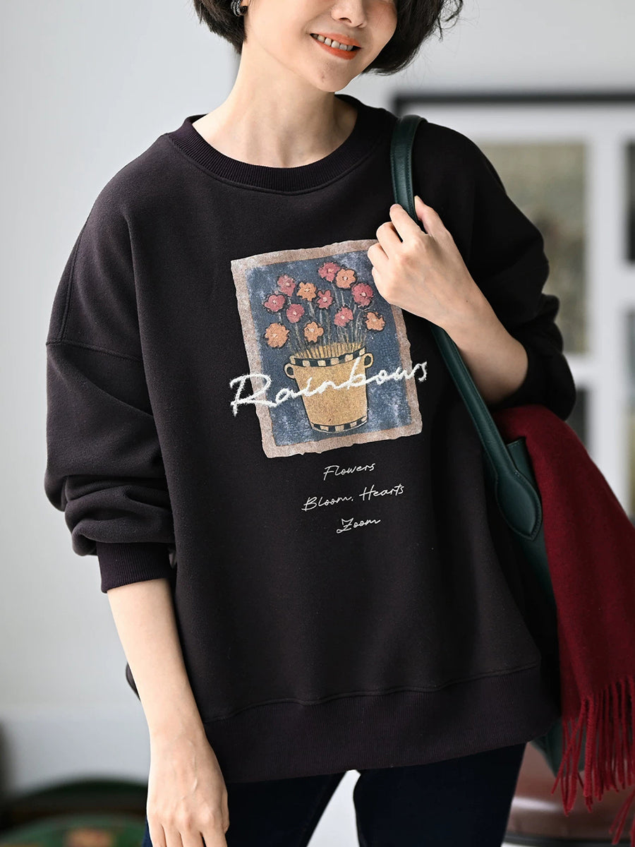 Women Artsy Winter Print Fleece-lined O-Neck Blouse