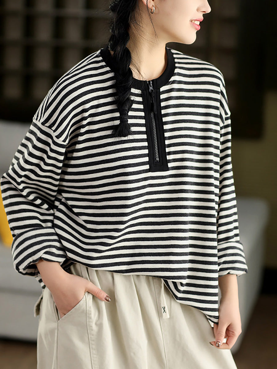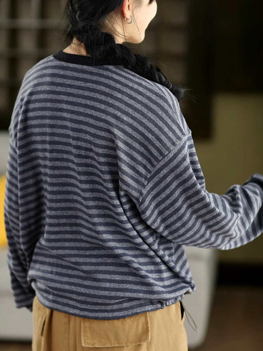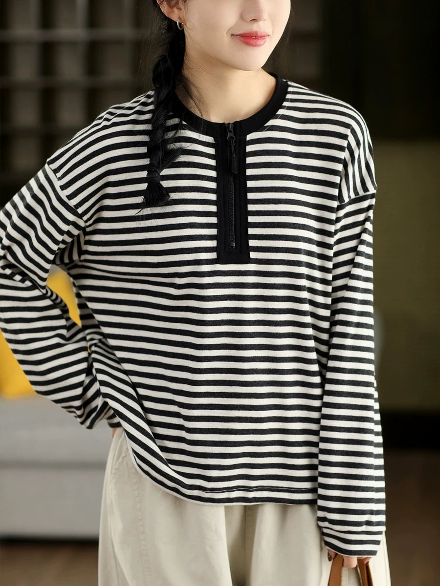 Women Artsy Spring Stripe O-Neck Cotton Blouse