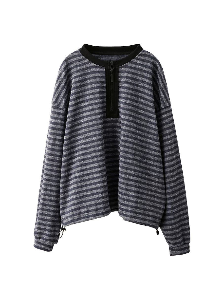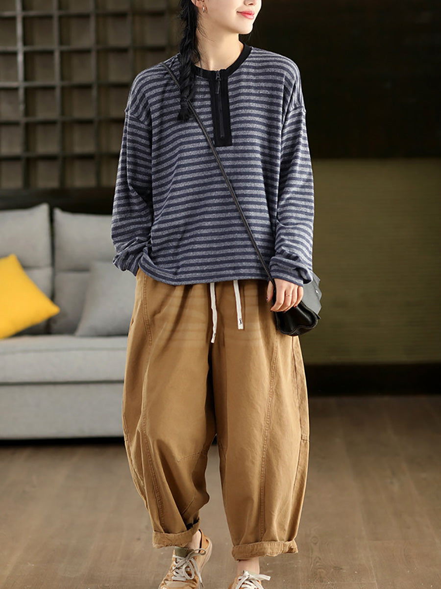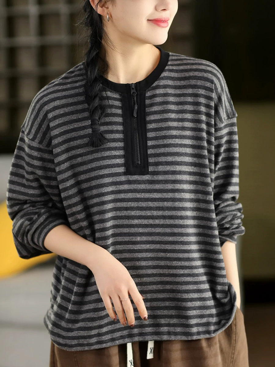 Women Artsy Spring Stripe O-Neck Cotton Blouse