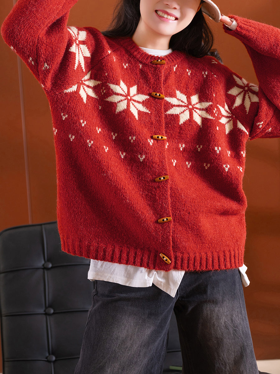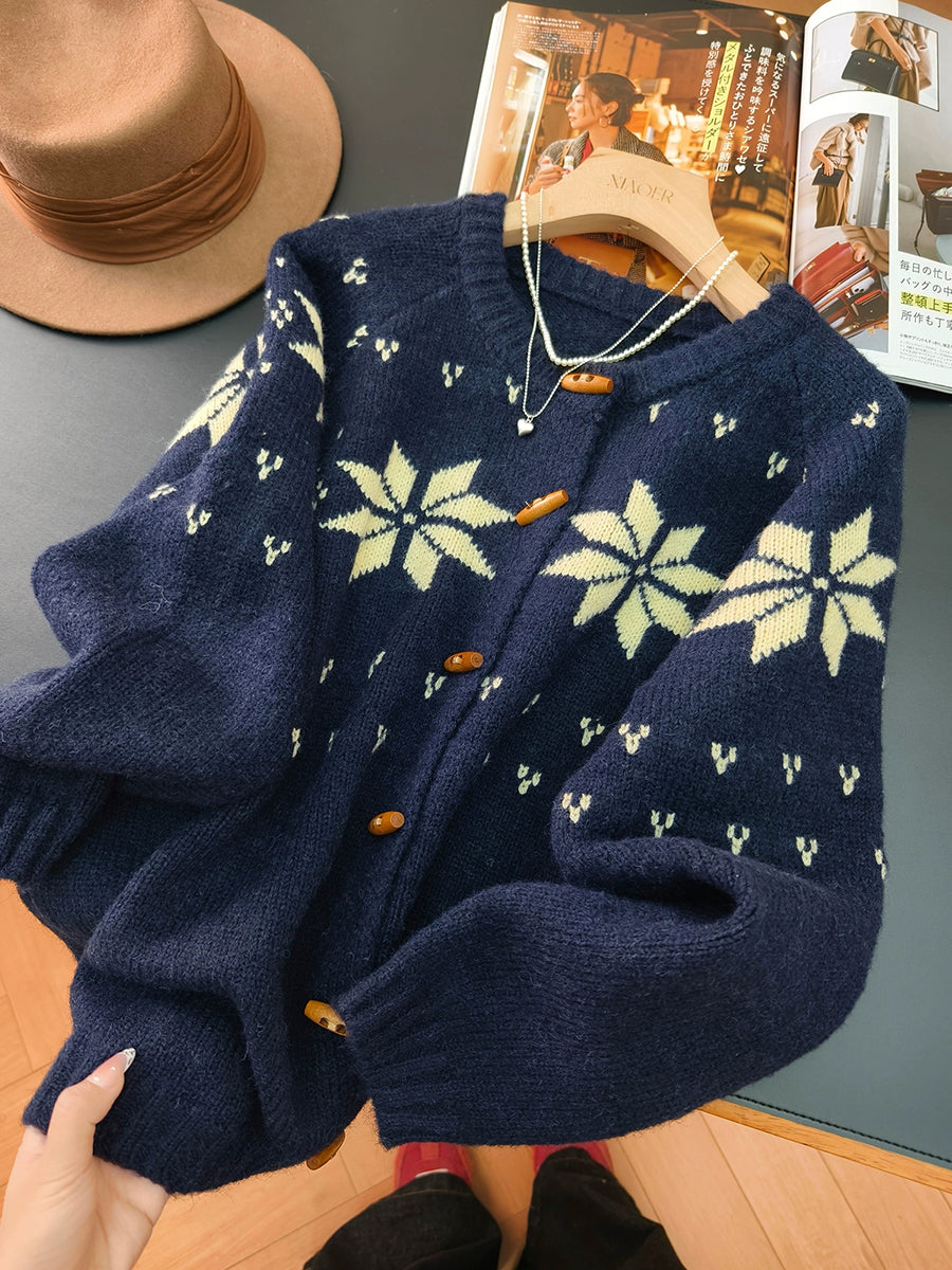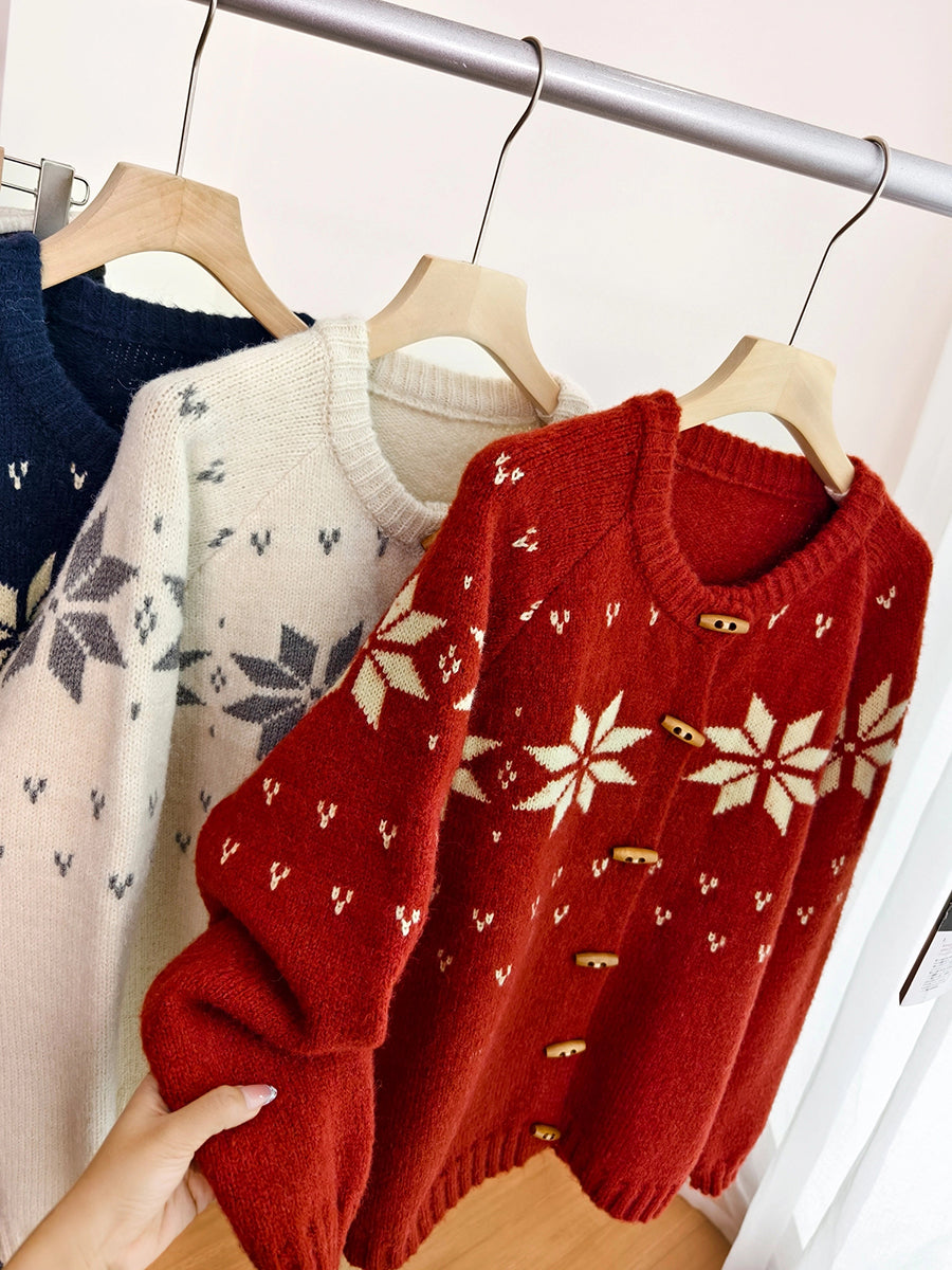 Women Autumn Artsy Flower Knitted O-Neck Sweater