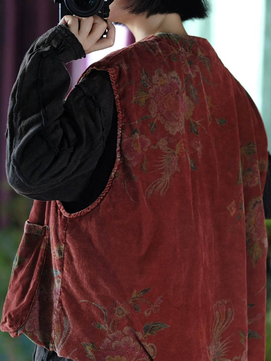 Women Autumn Retro Flower O-Neck Cotton Padded Vest