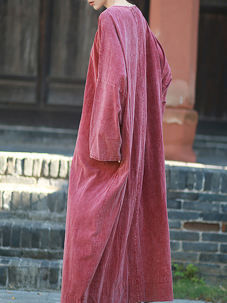 Women Autumn Retro Pure Color O-Neck Cotton Linen Dress
