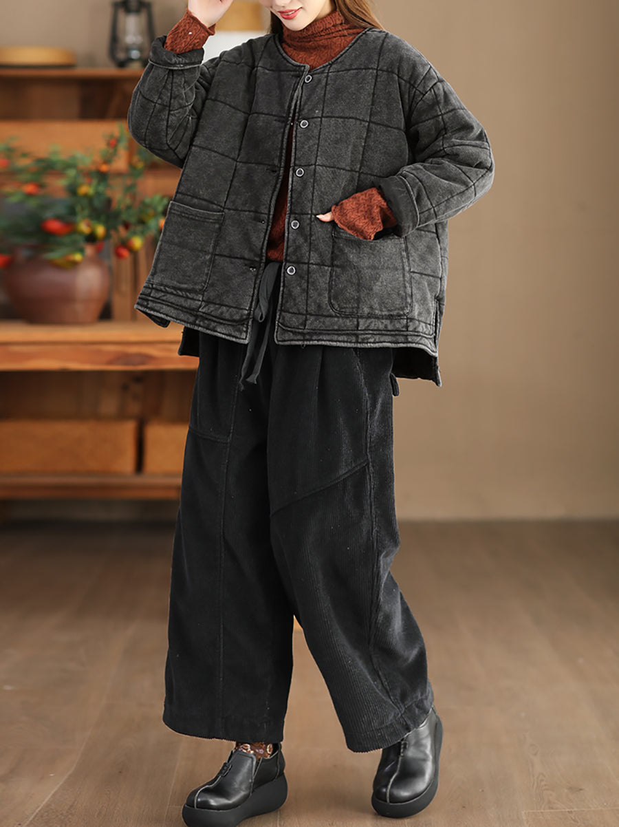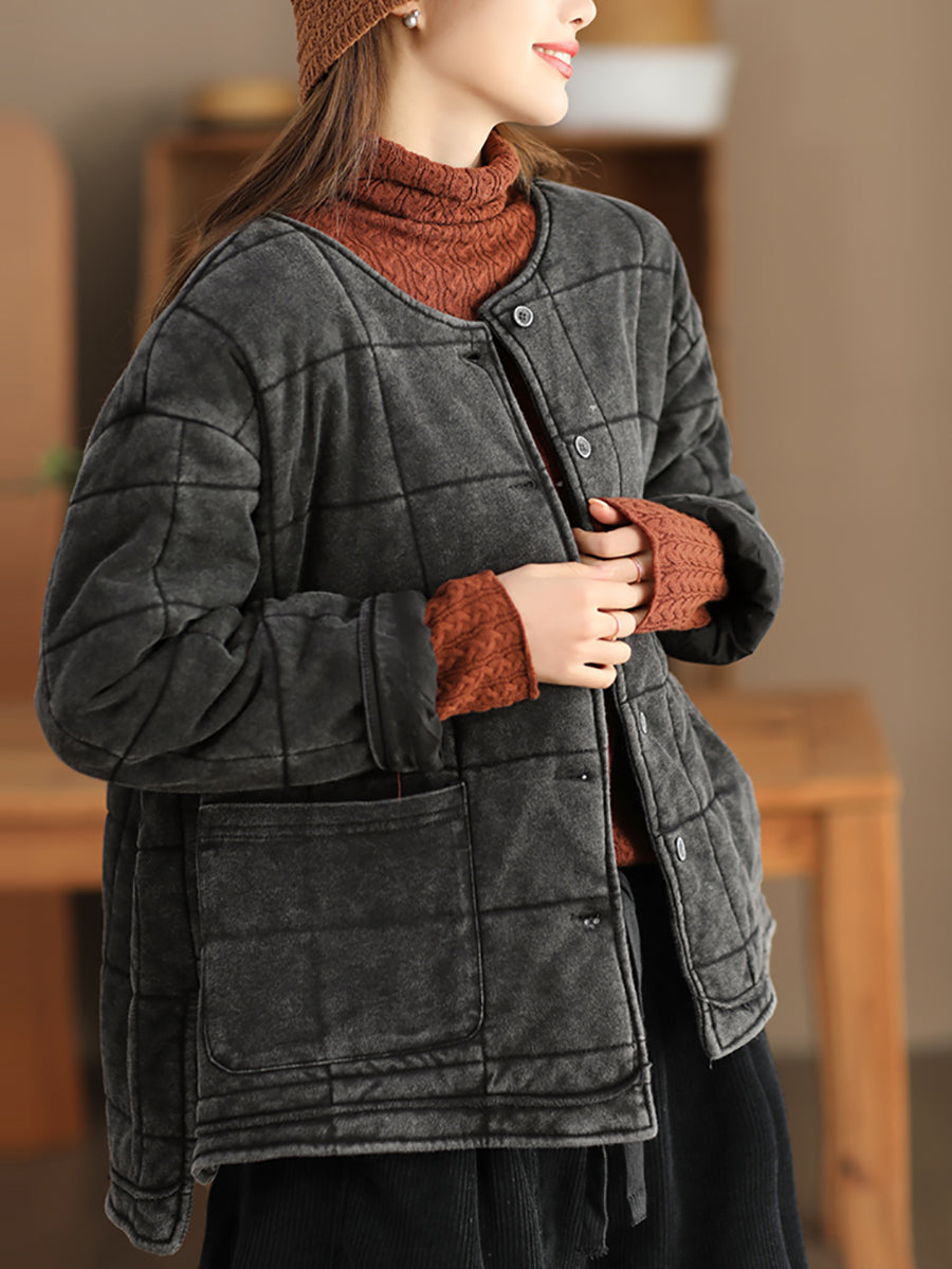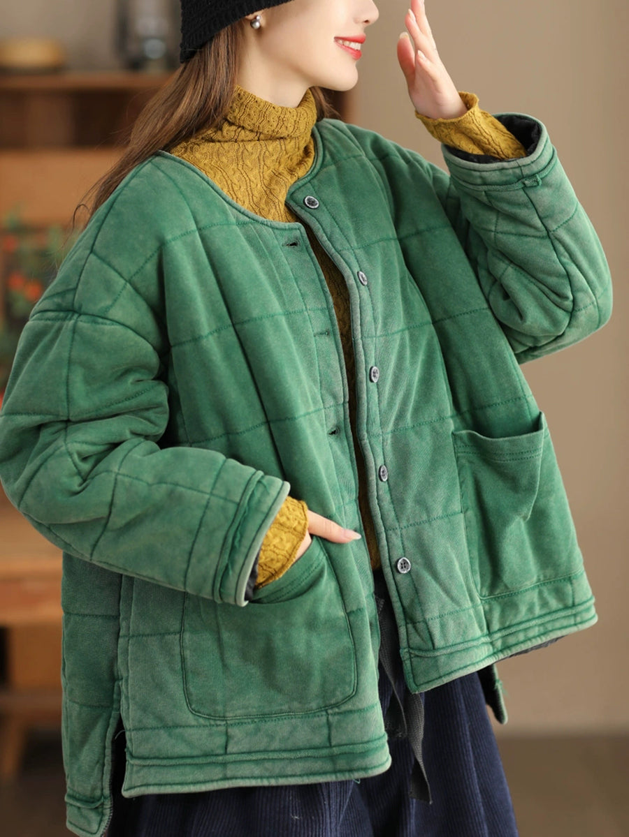 Plus Size Women Autumn Retro Pure Color O-Neck Padded Jacket