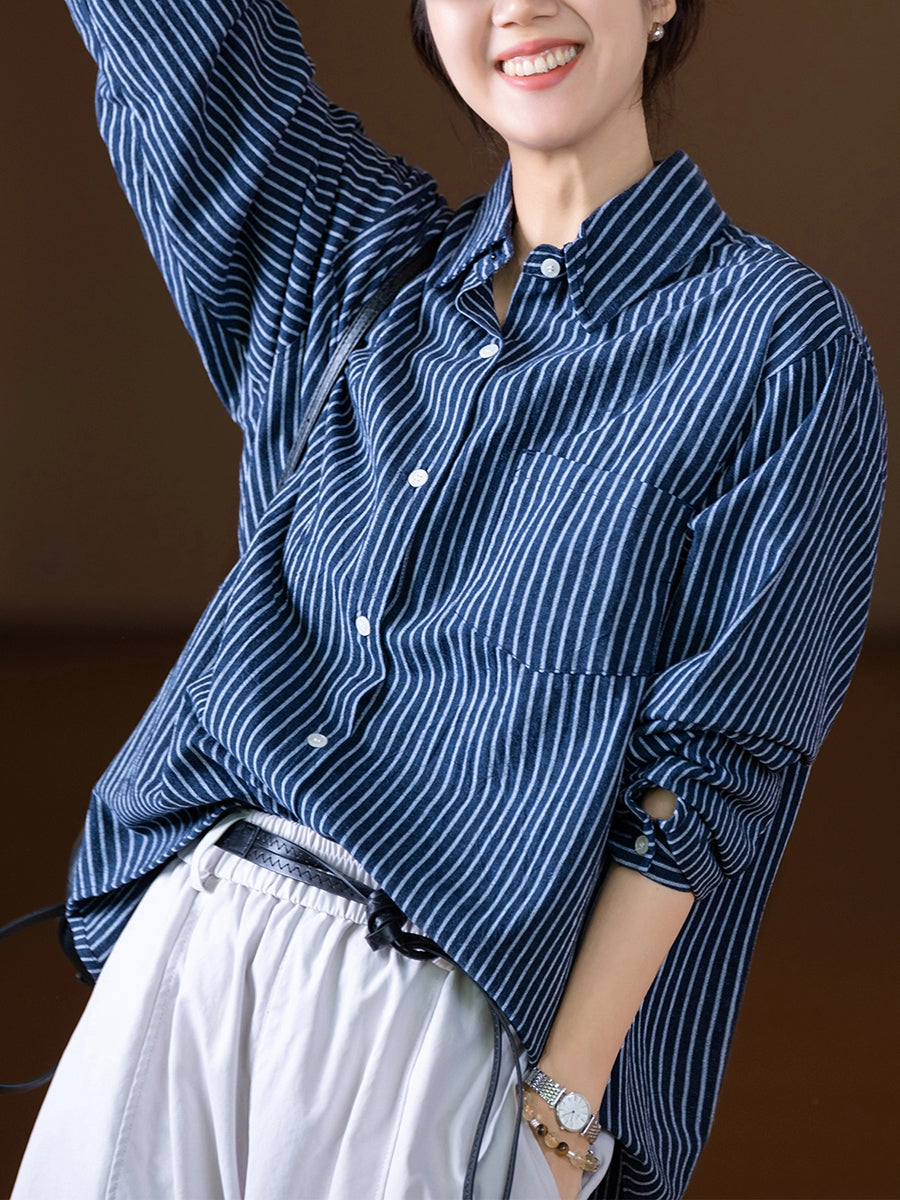 Women Autumn Stripe Turn-down Collar 100%Cotton Shirt