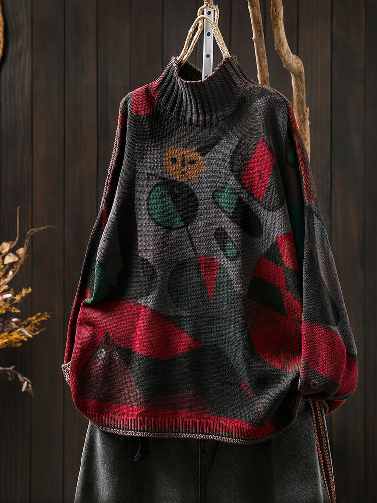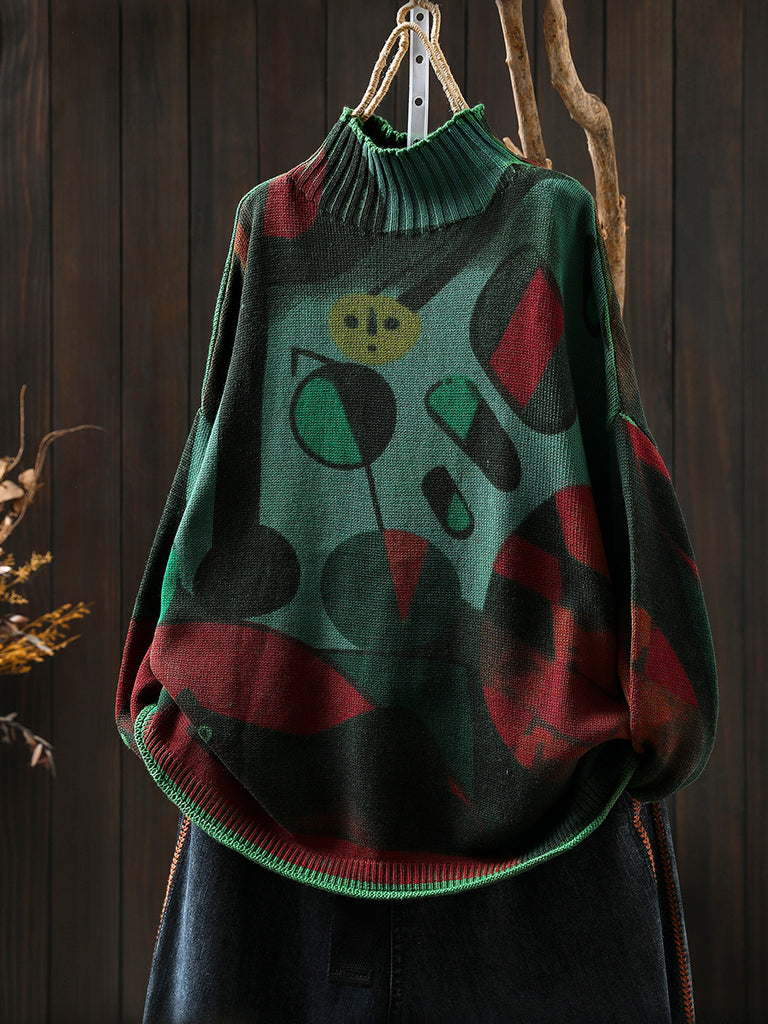 Women Autumn Vintage Print Half-Turtleneck Sweater