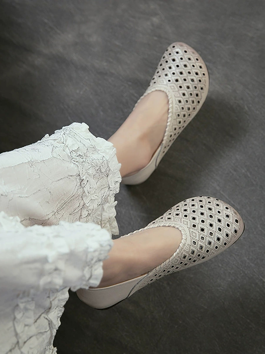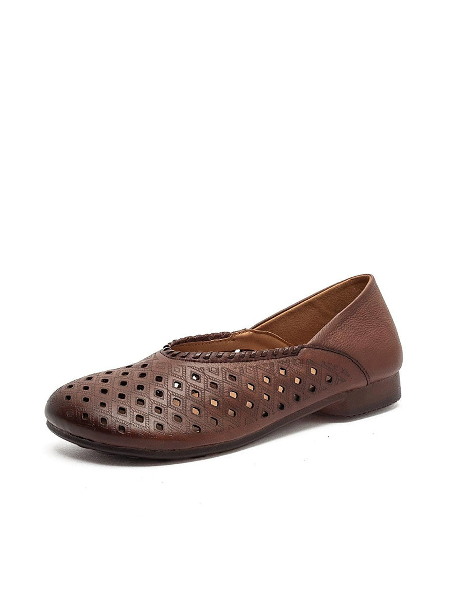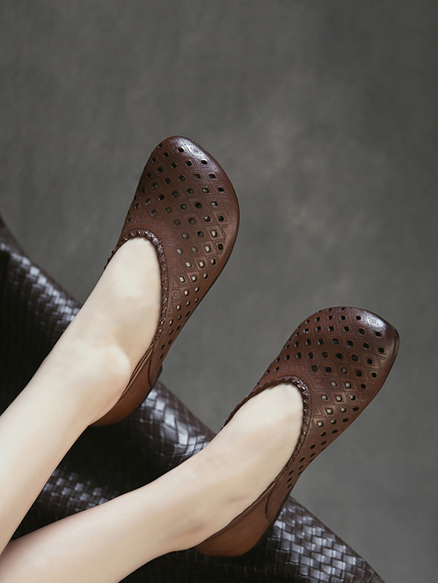 Women Retro Genuine Leather Hole Low Heel Sandals