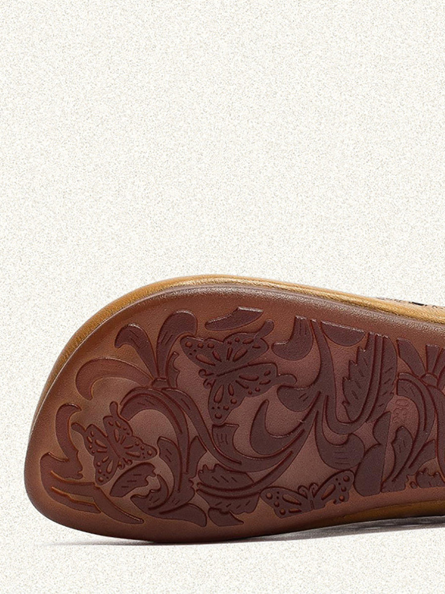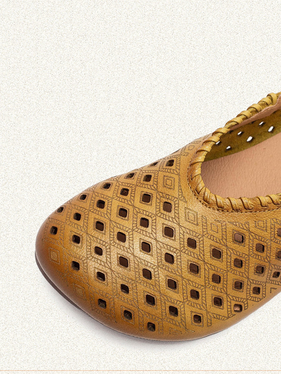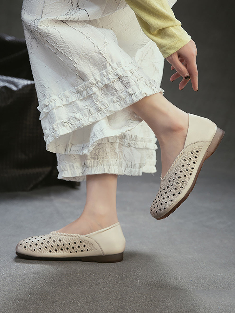 Women Retro Genuine Leather Hole Low Heel Sandals