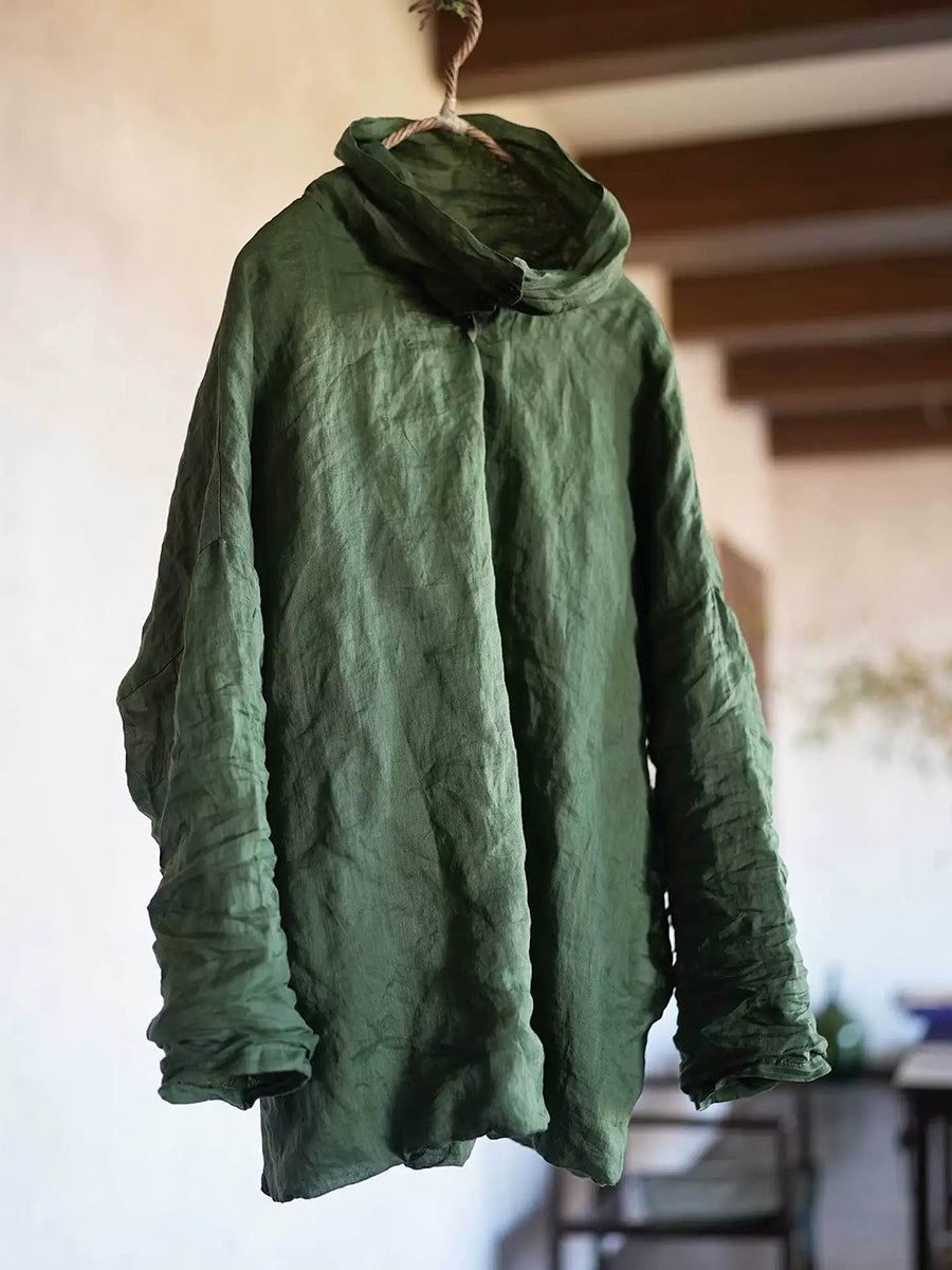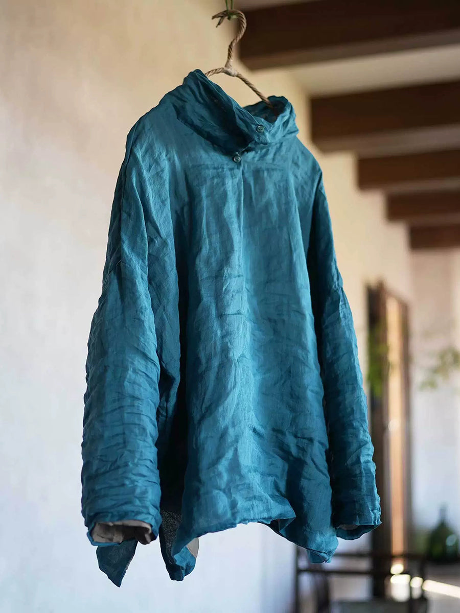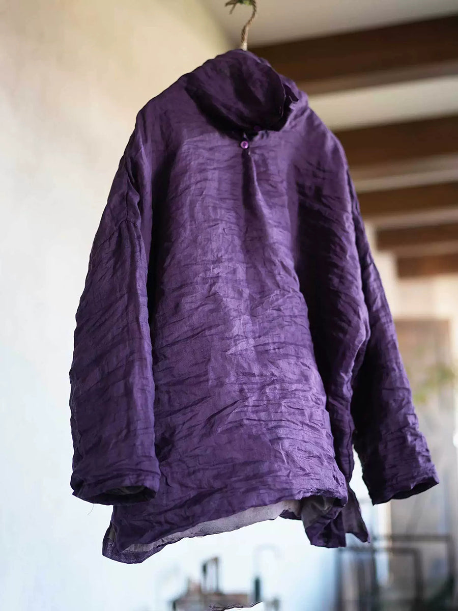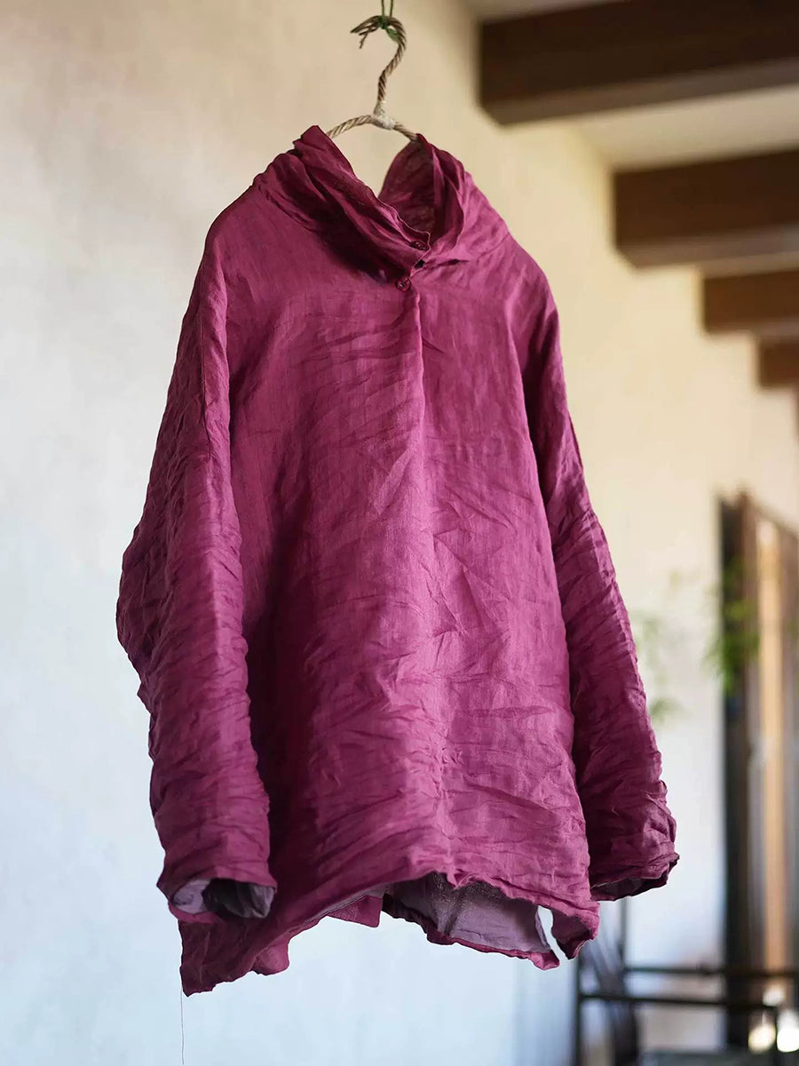 Women Retro Spring Pure Color Ramie Heaps Collar Blouse