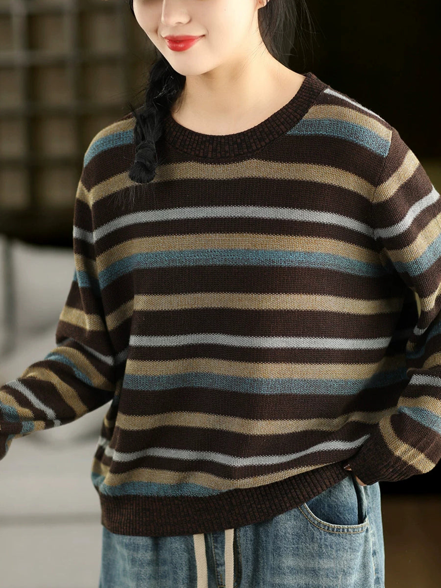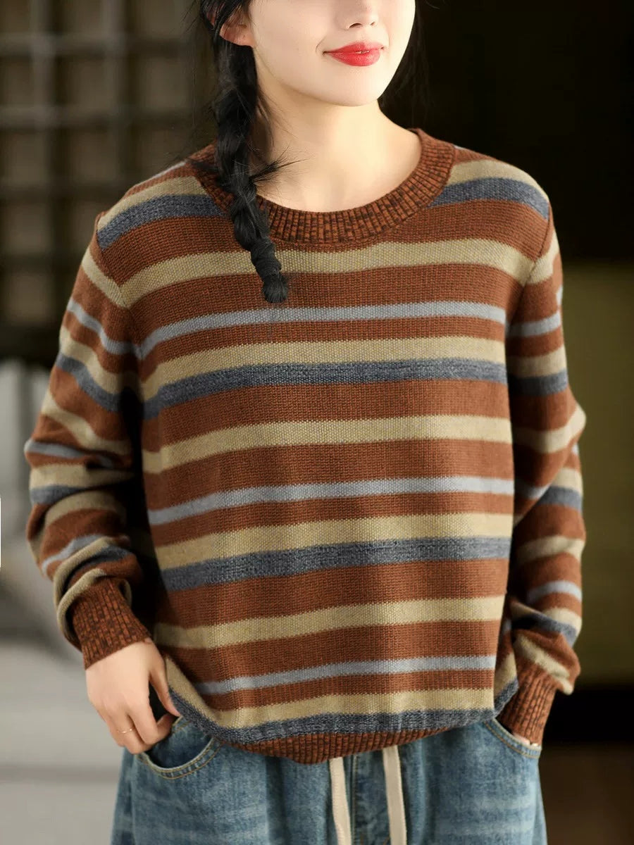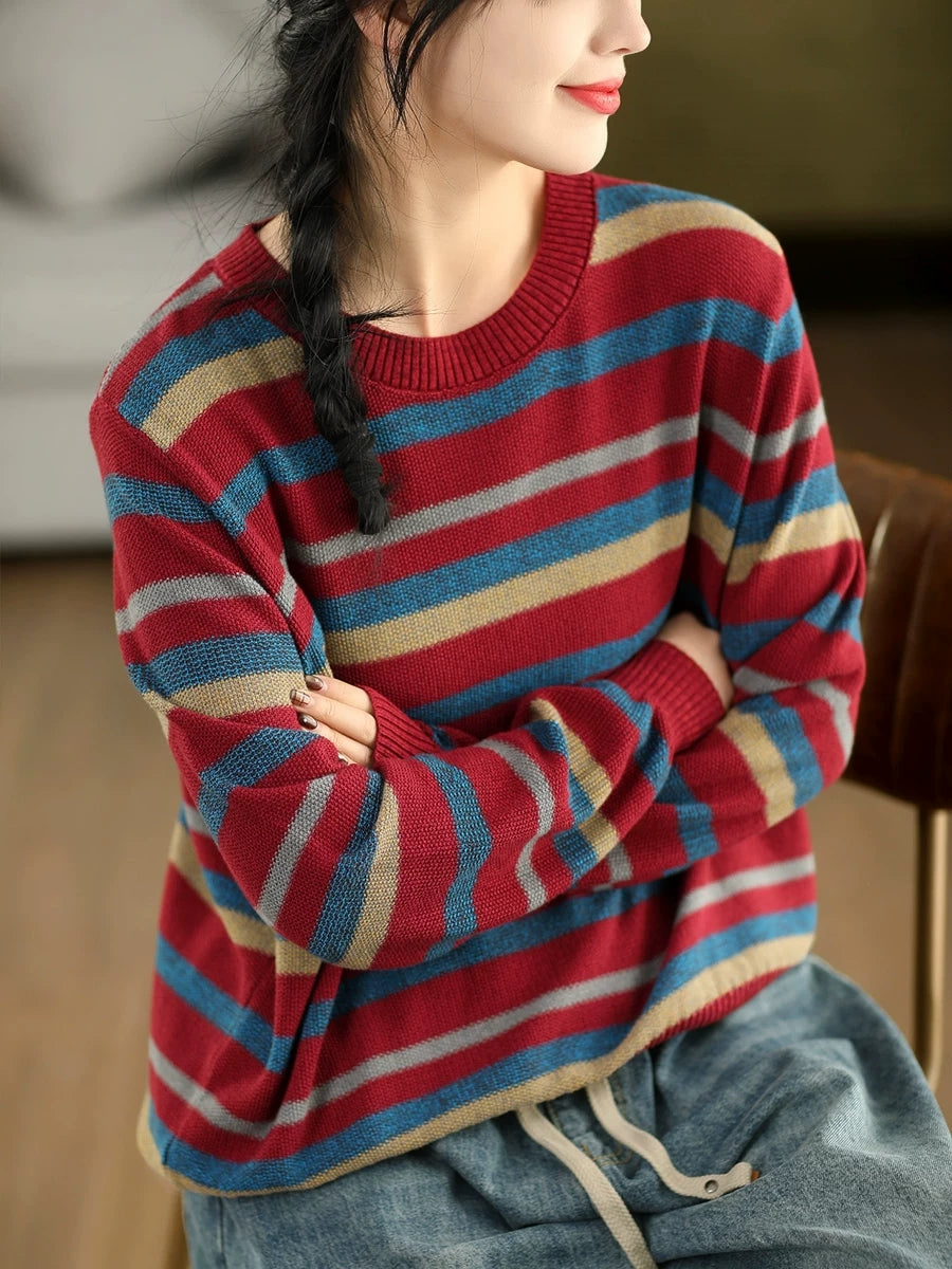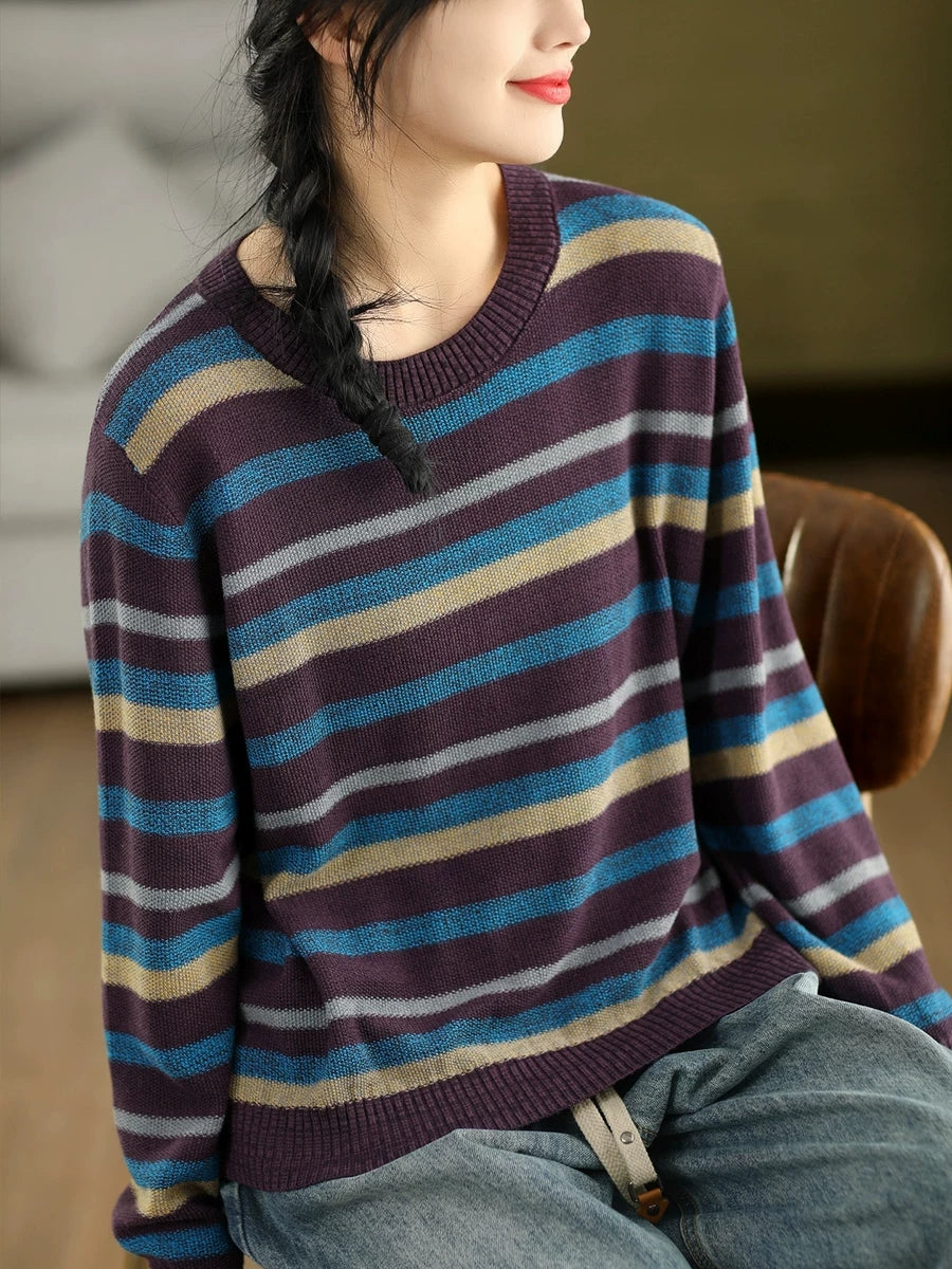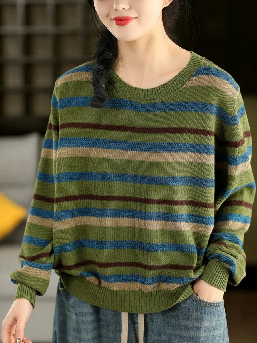Women Retro Spring Stripe O-Neck Sweater