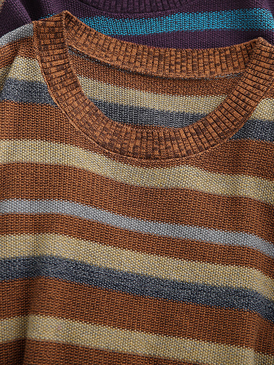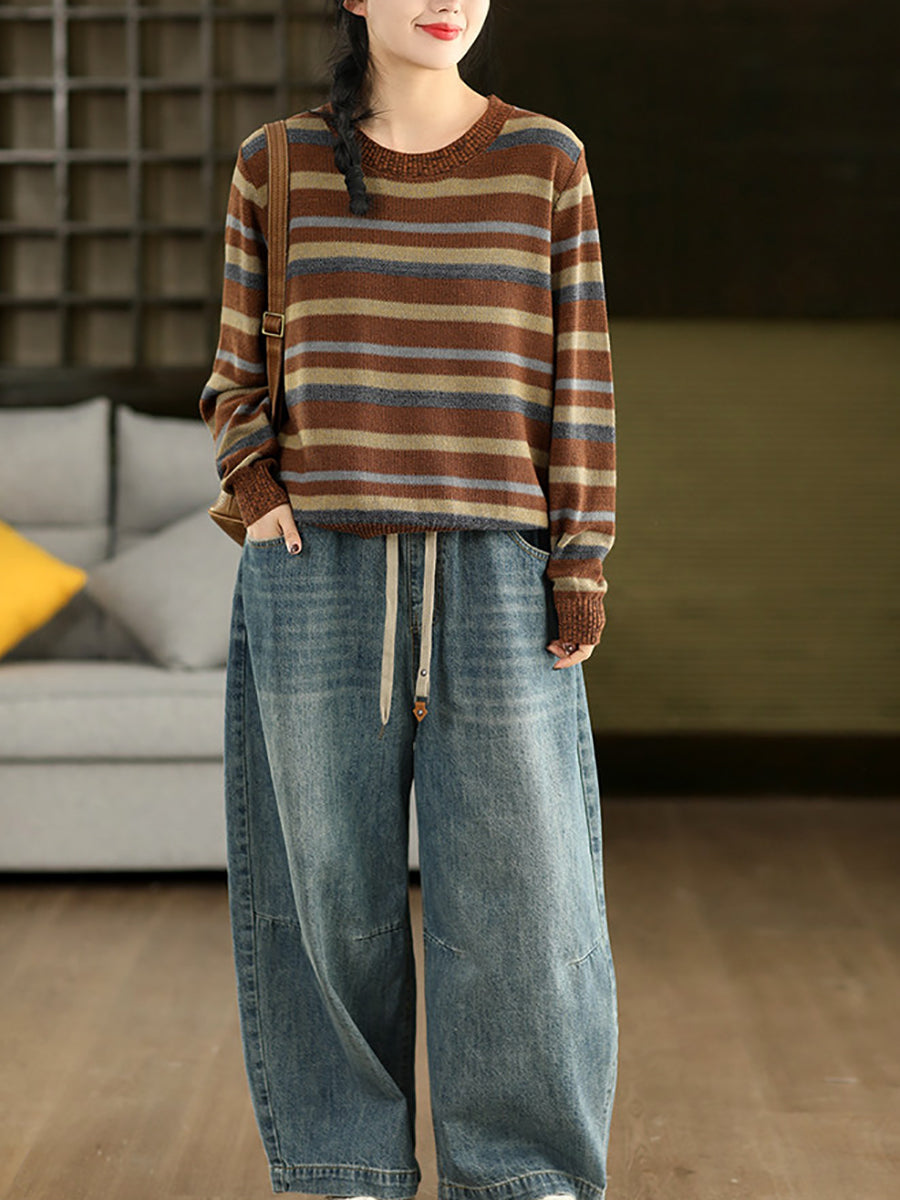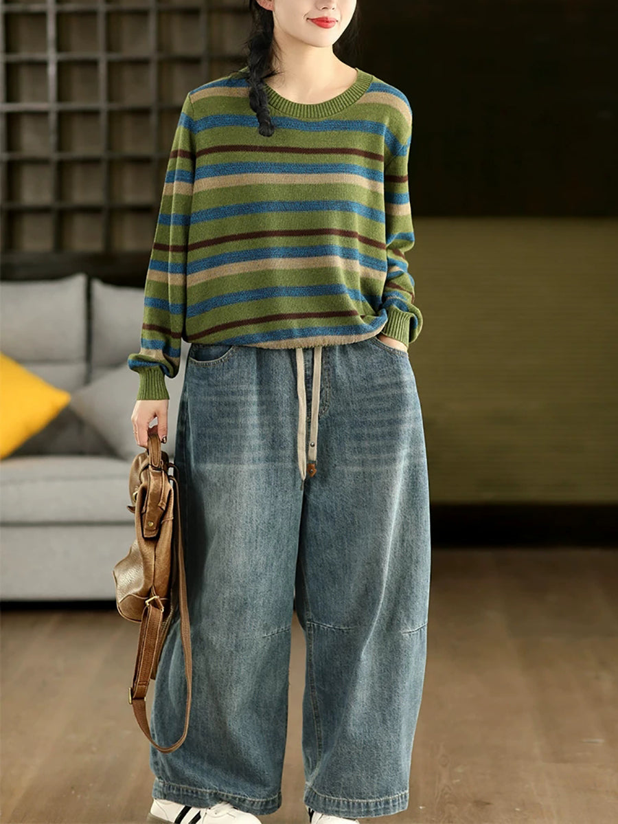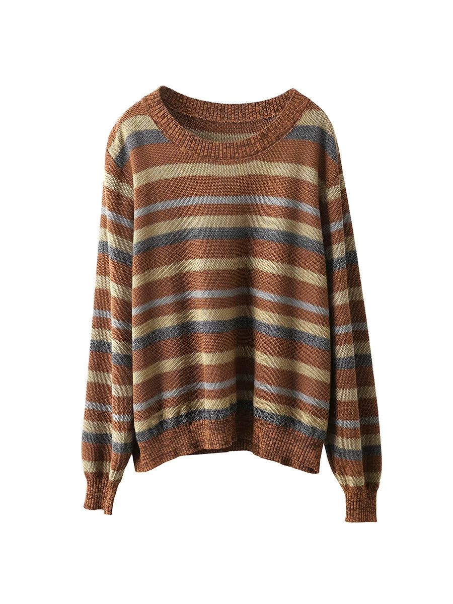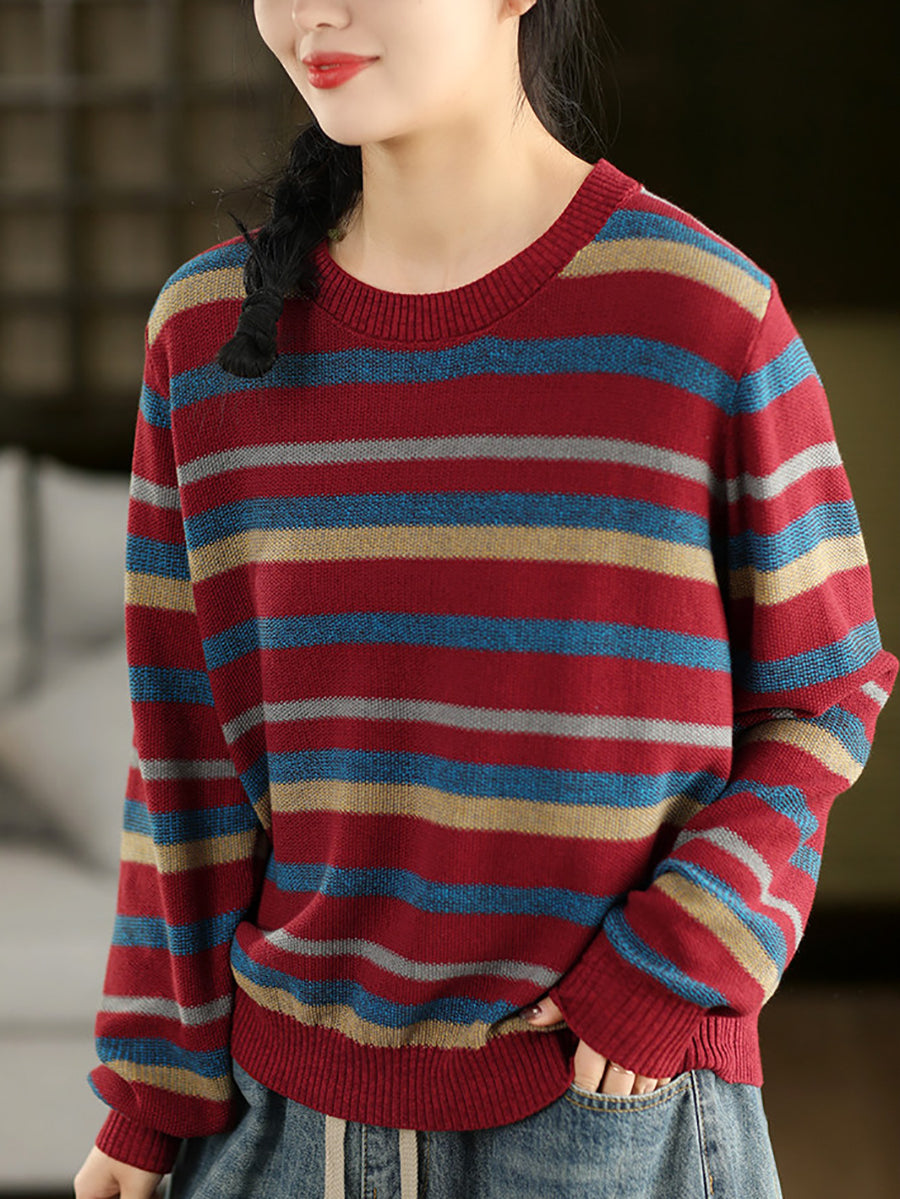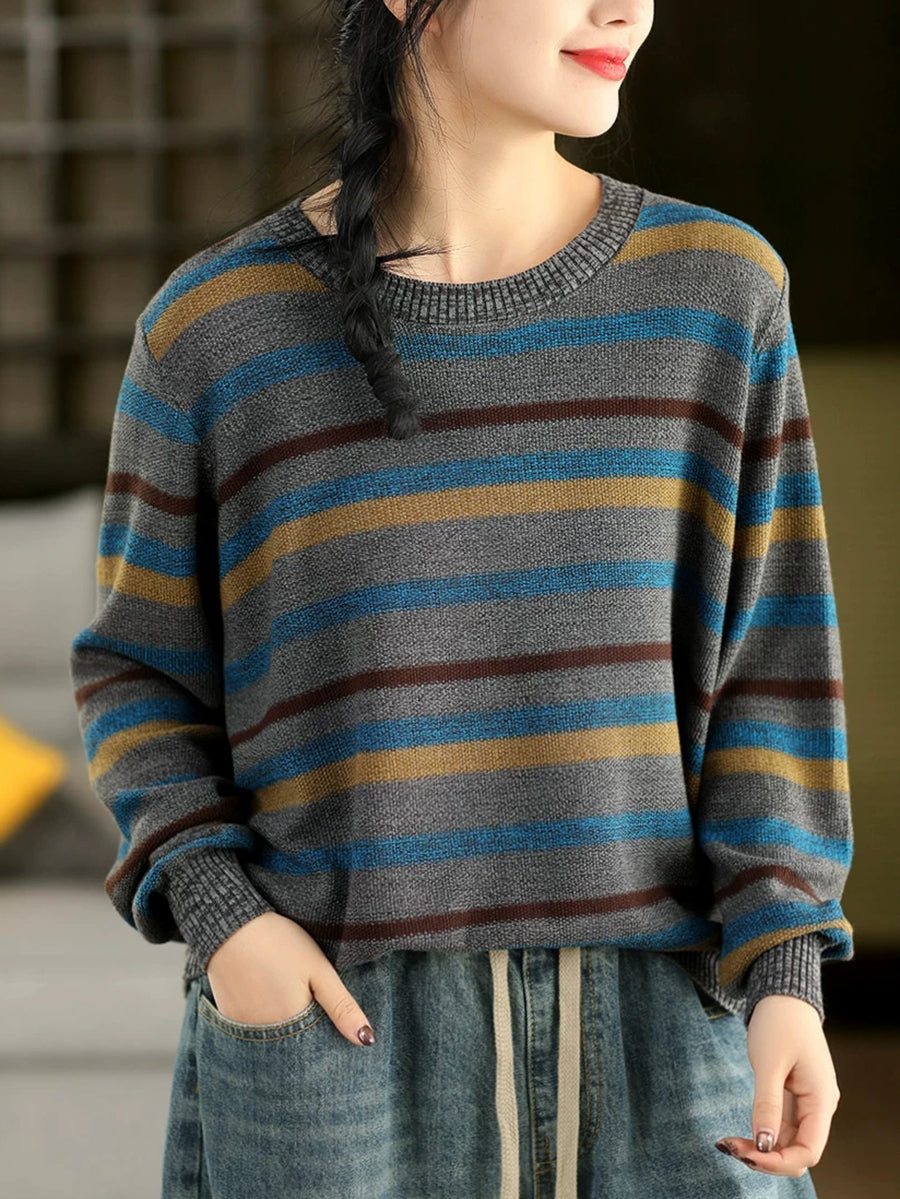 Women Retro Spring Stripe O-Neck Sweater