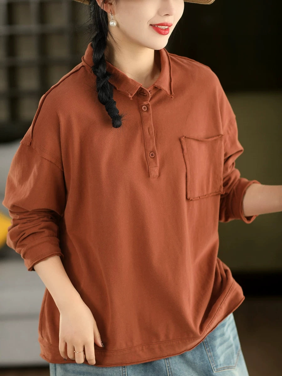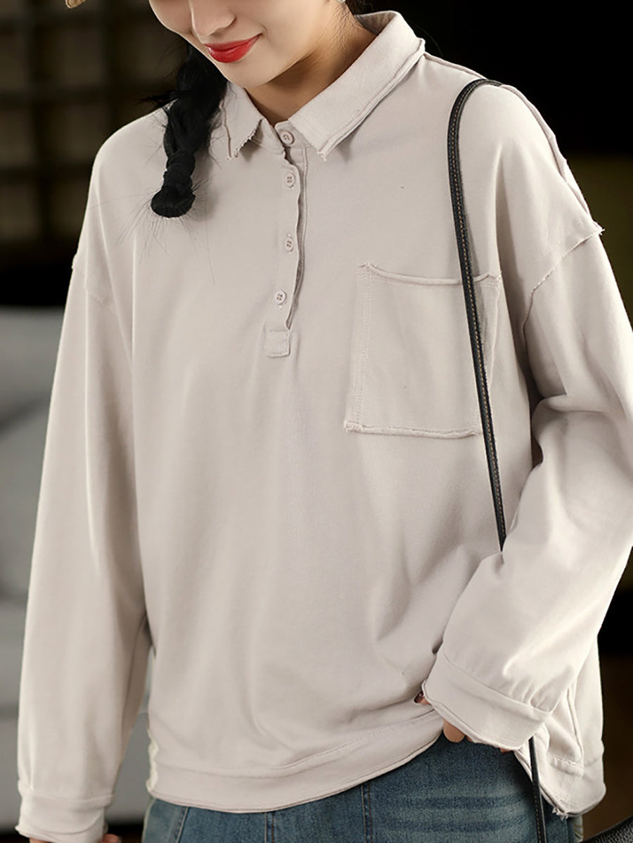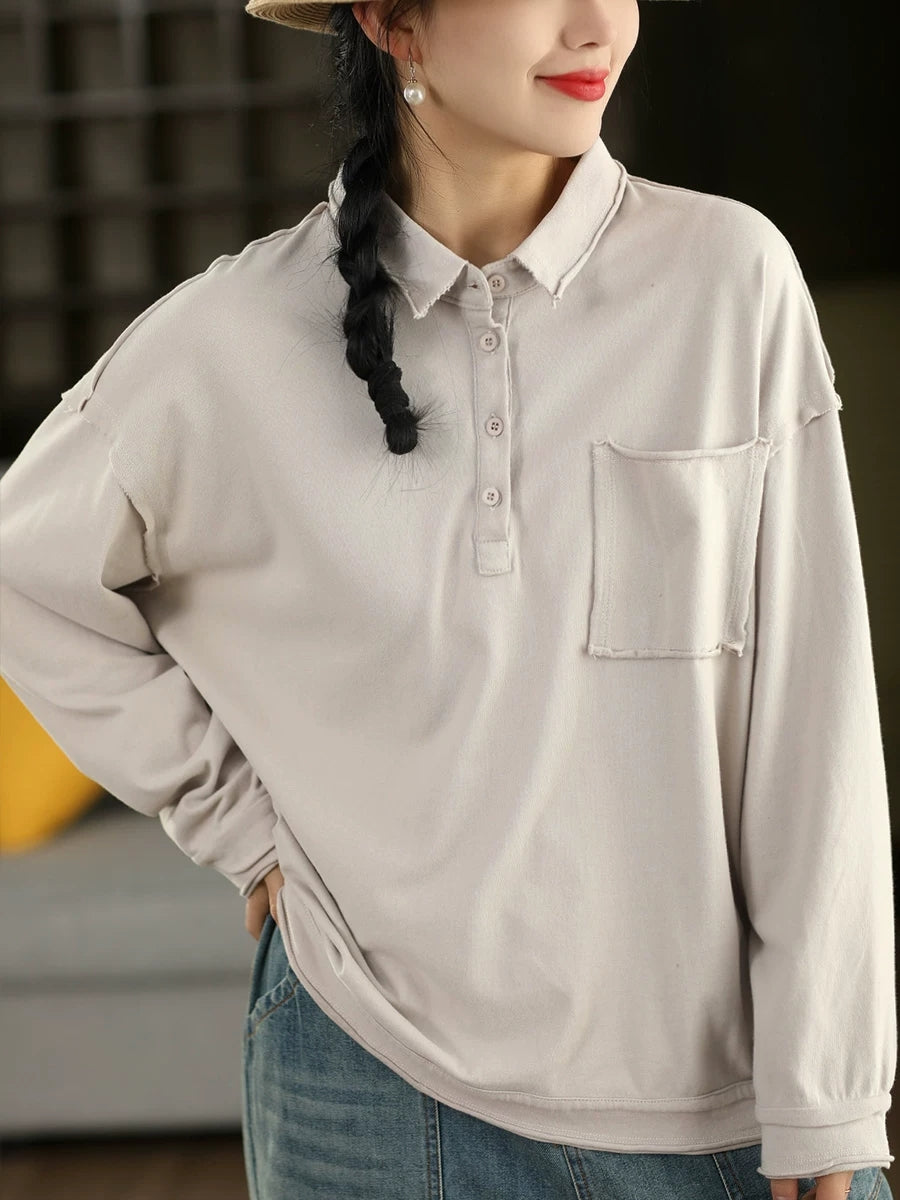 Women Spring Artsy Pure Color Cotton Turn-down Collar Blouse