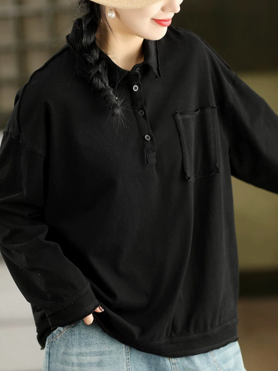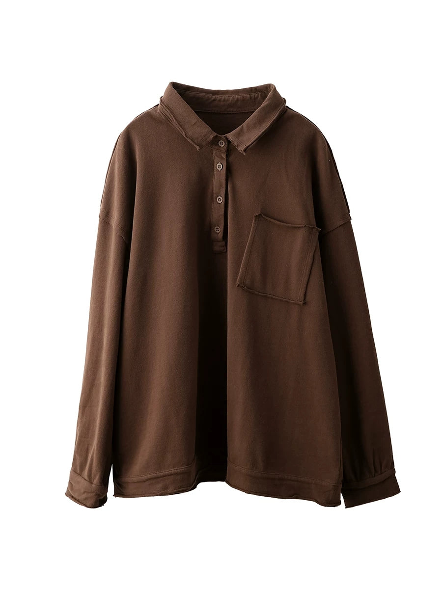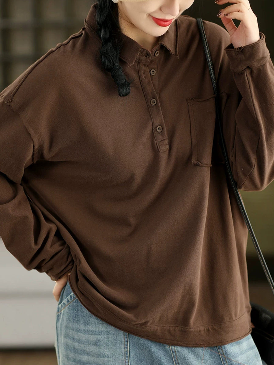 Women Spring Artsy Pure Color Cotton Turn-down Collar Blouse