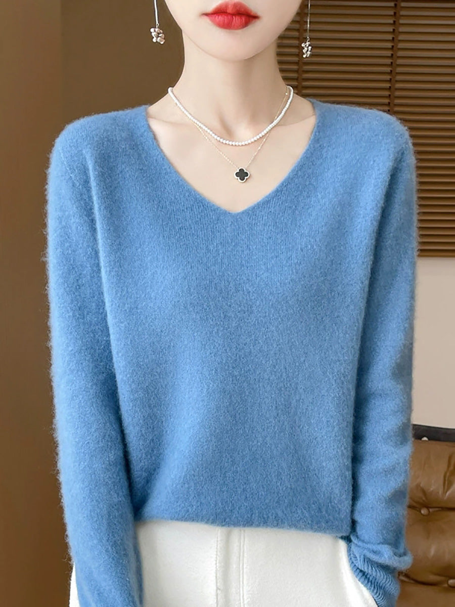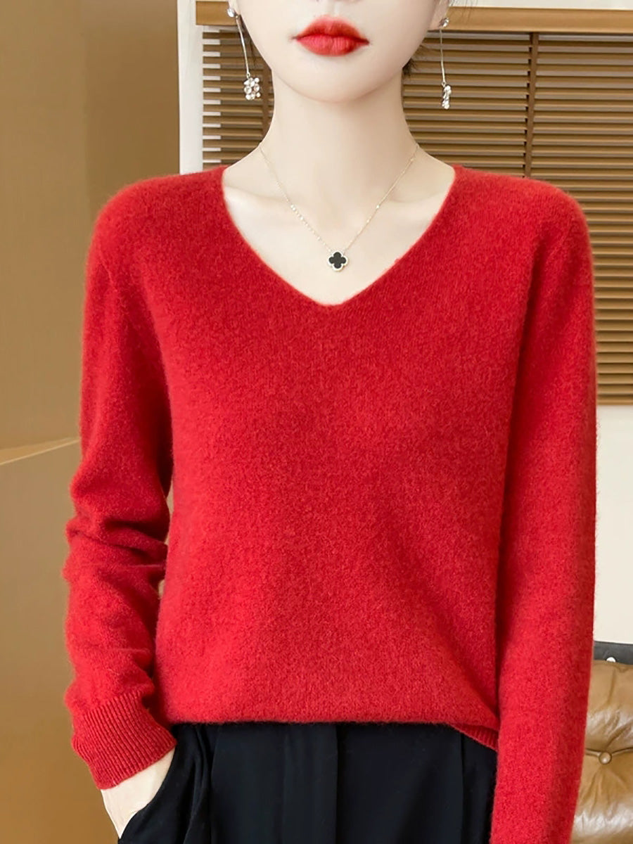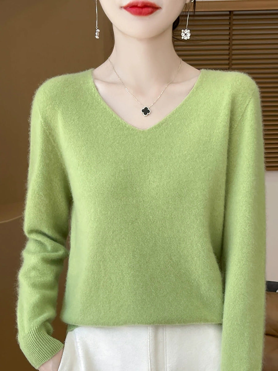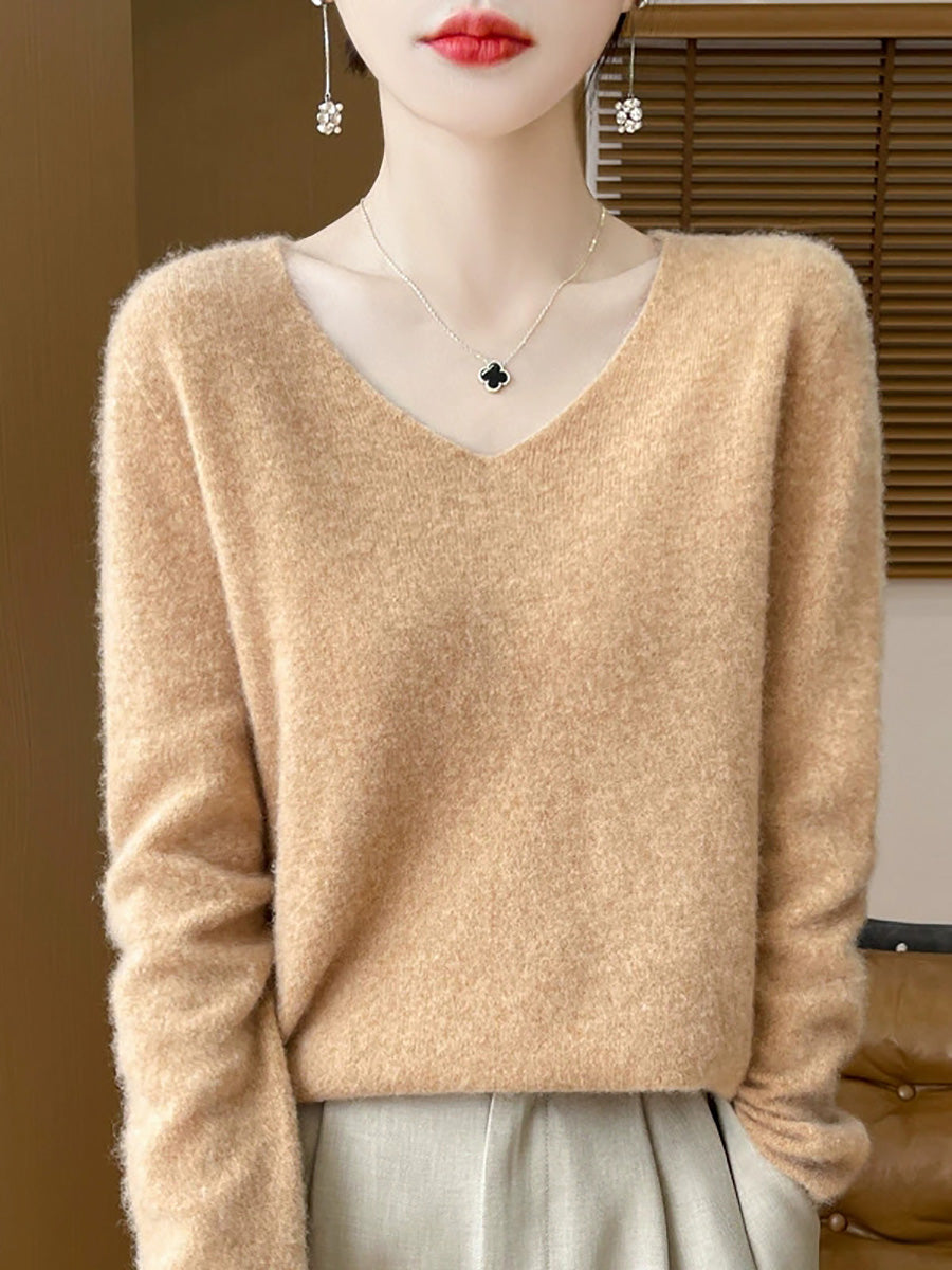 Women Spring Artsy Pure Color V-Neck Sweater