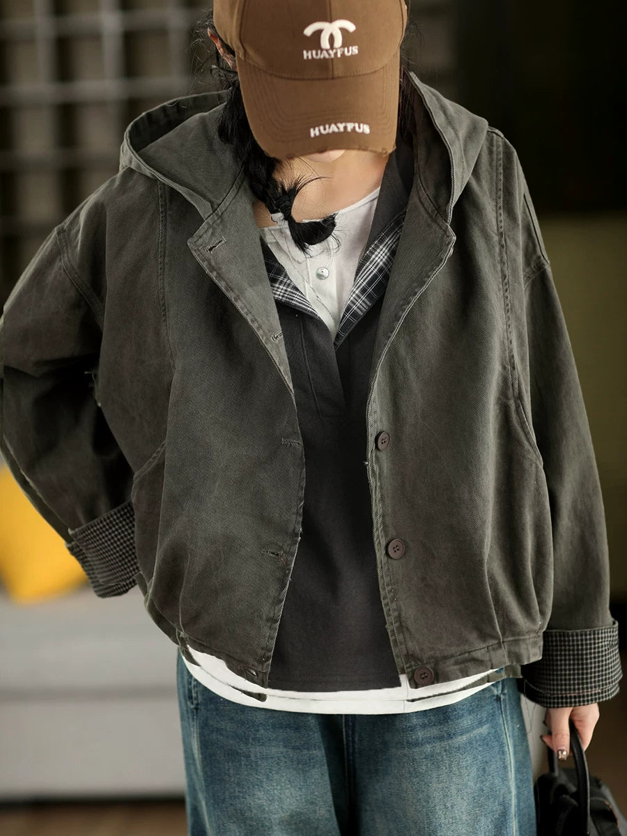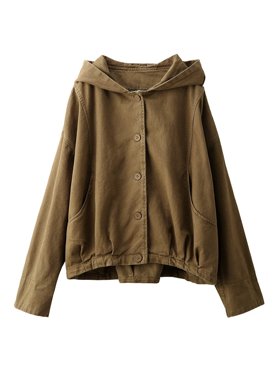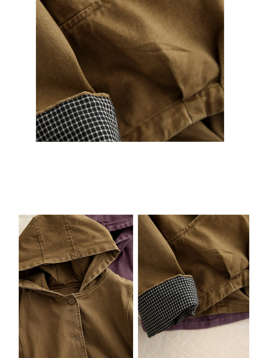 Women Spring Casual Pure Color 100%Cotton Hooded Coat