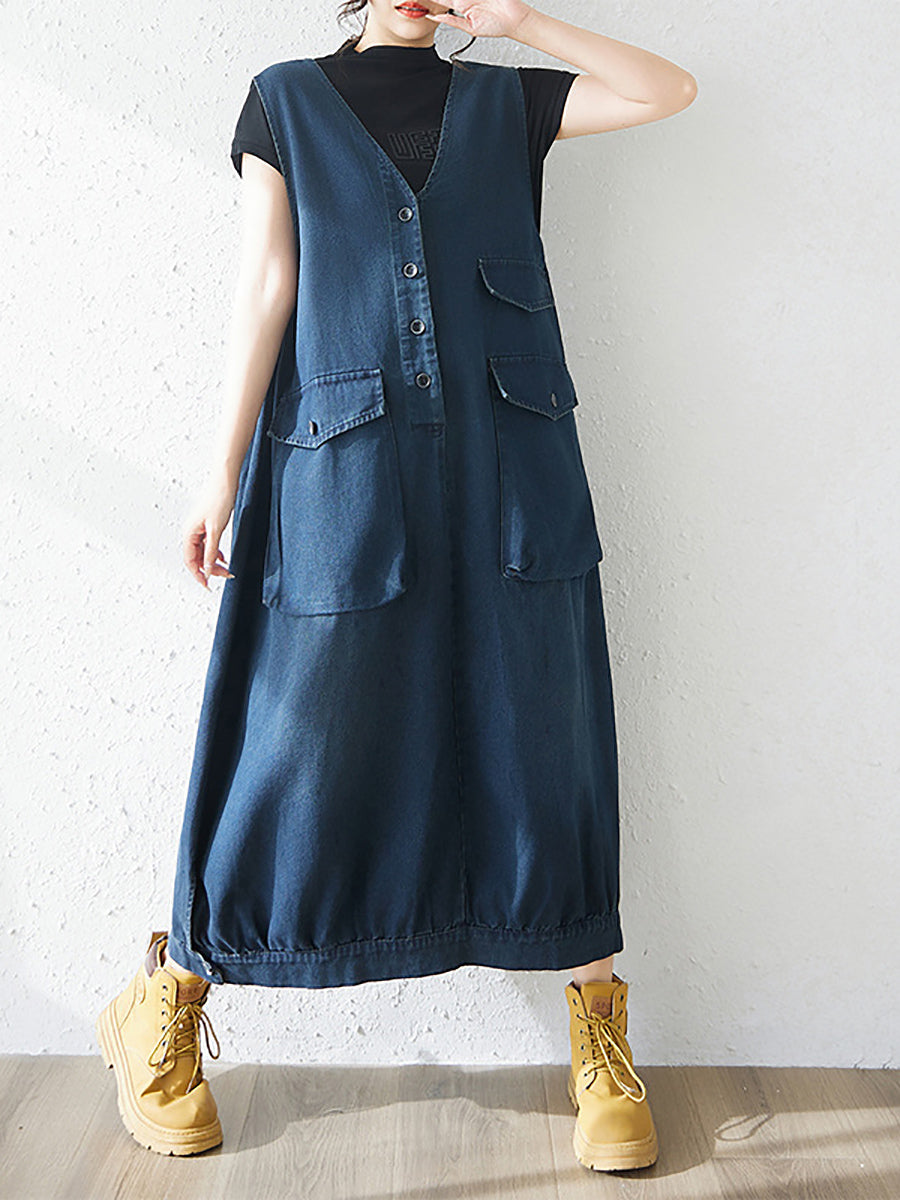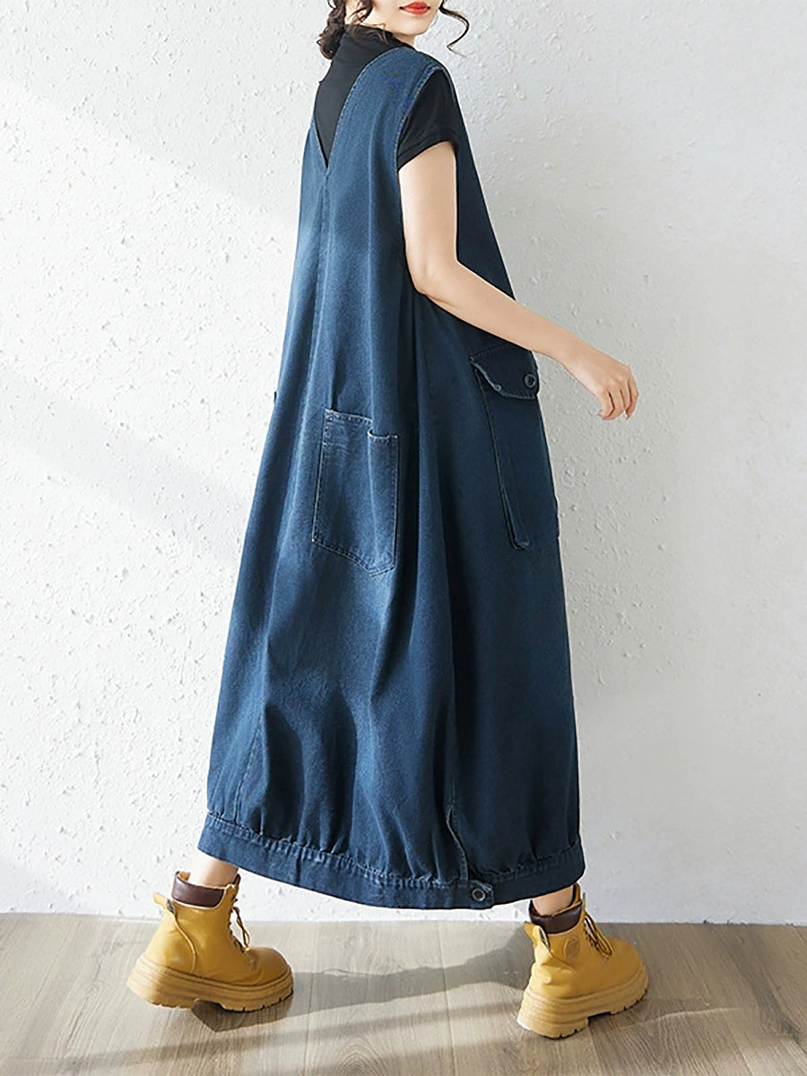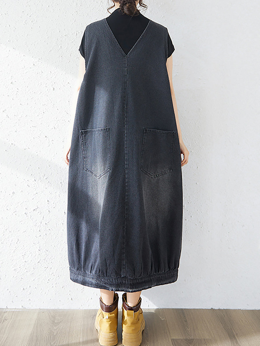 Women Spring Casual Pure Color Denim V-Neck Dress