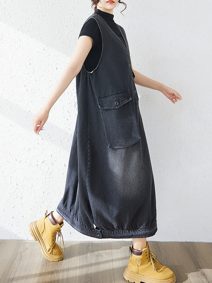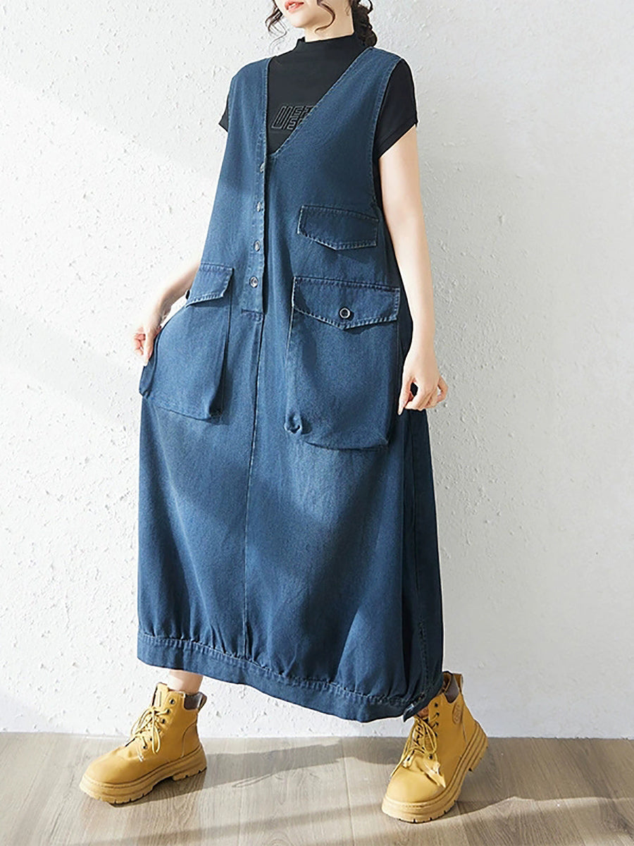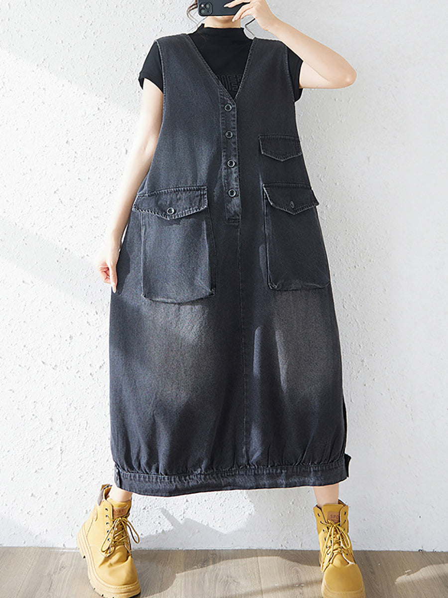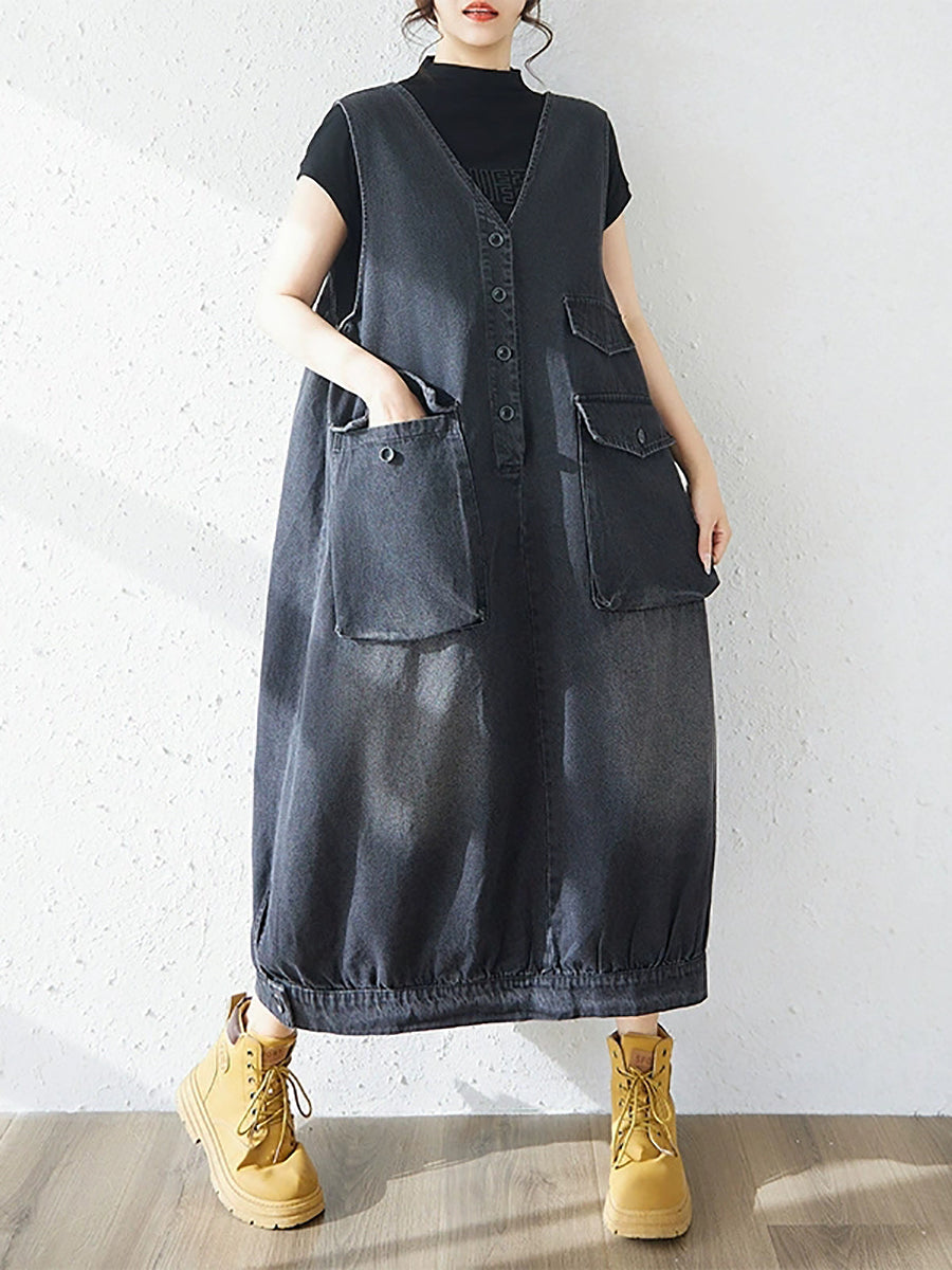 Women Spring Casual Pure Color Denim V-Neck Dress