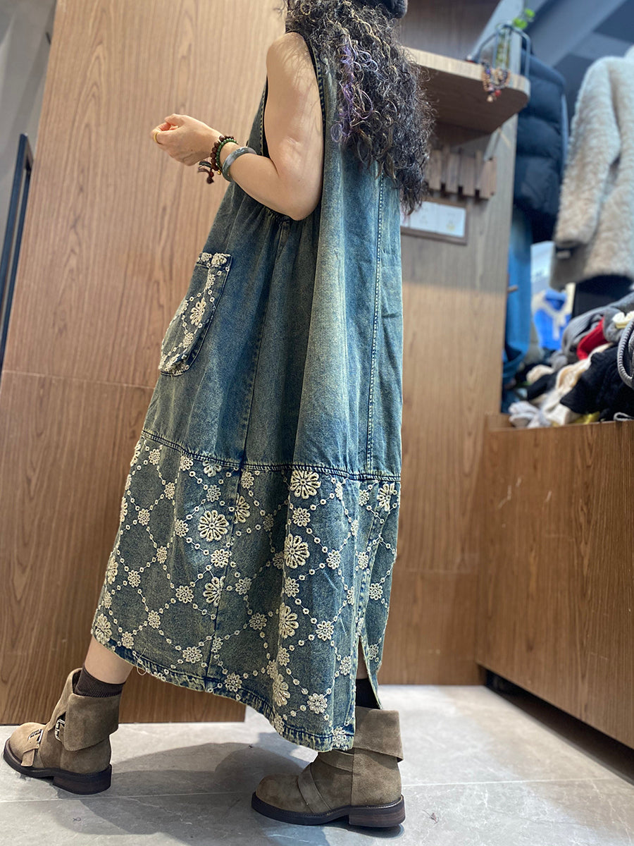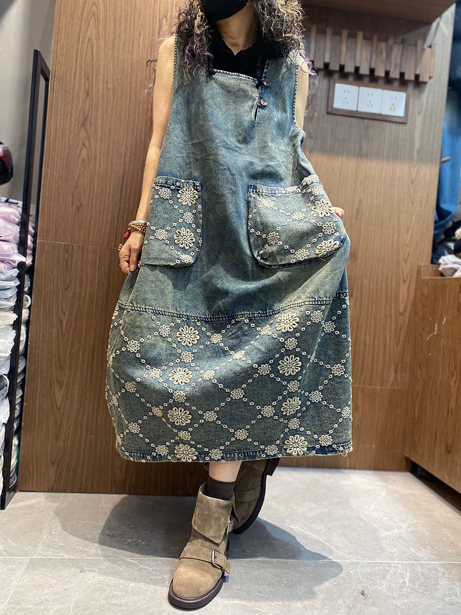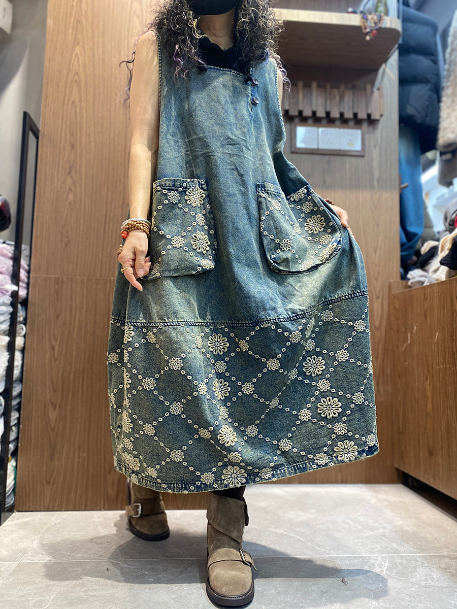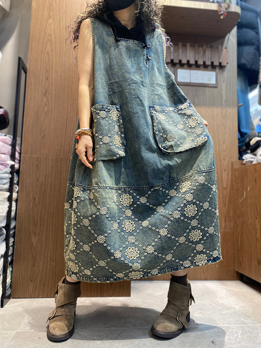 Women Spring Retro Embroidery Denim Dress