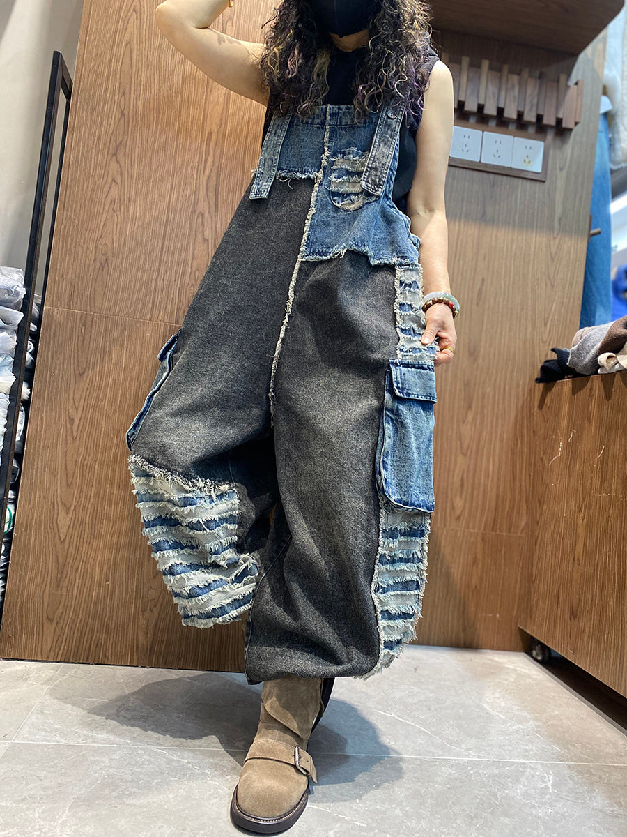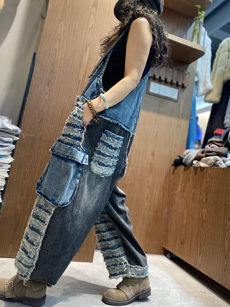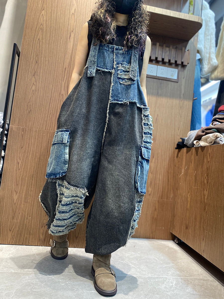 Women Spring Retro Patchwork Denim Jumpsuits