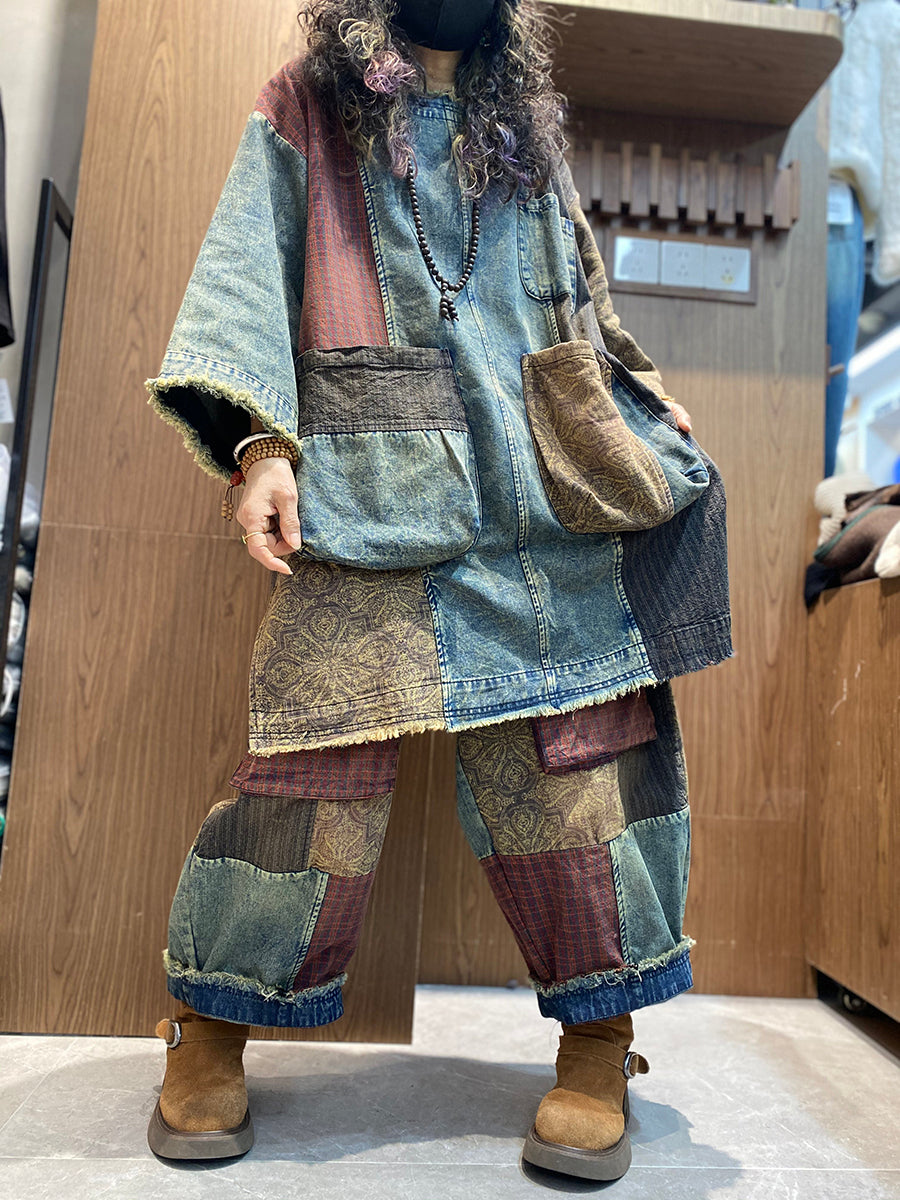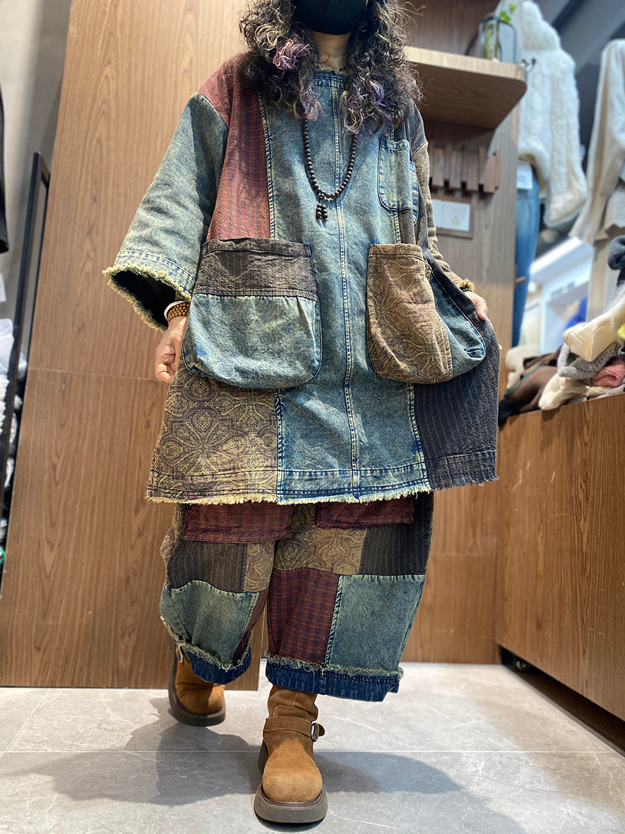 Women Spring Retro Patchwork O-Neck Padded Suits
