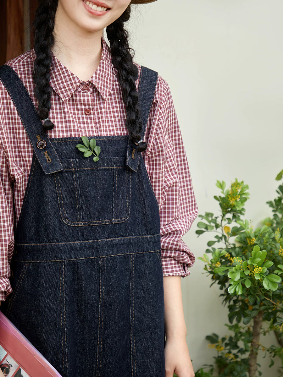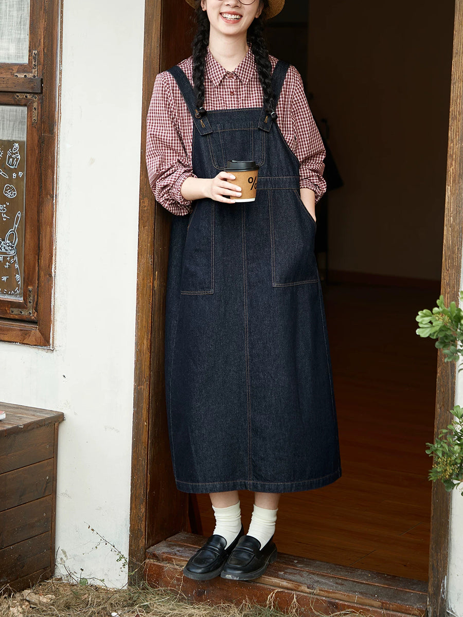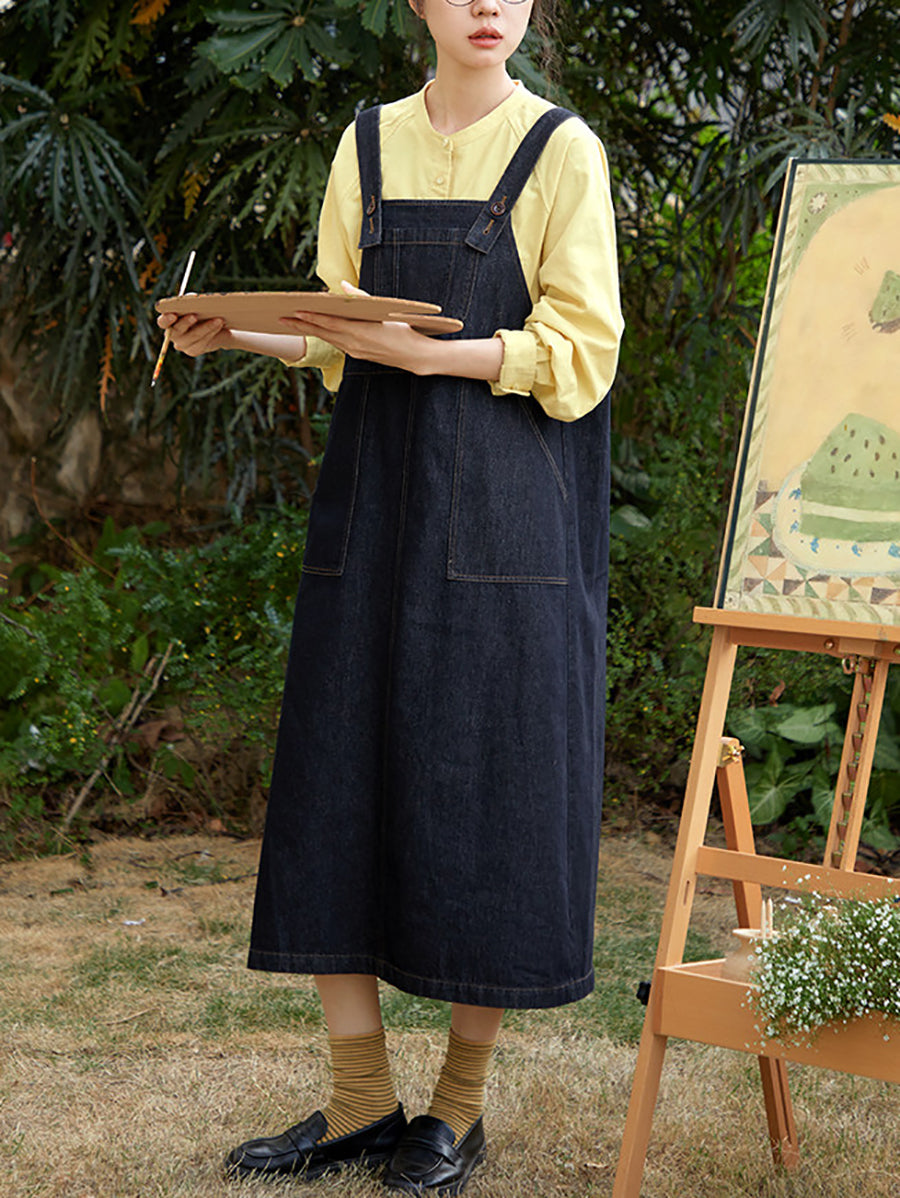 Women Spring Retro Pure Color Denim Overall Dress
