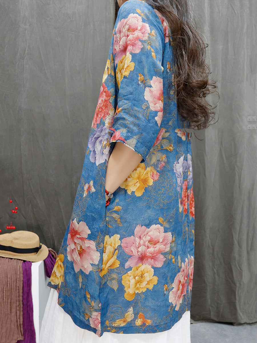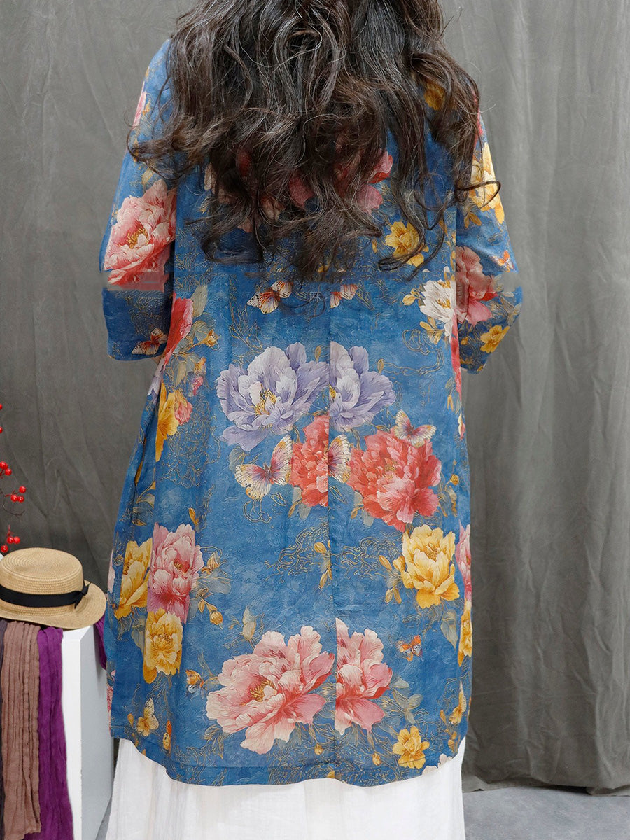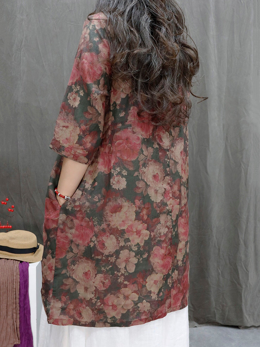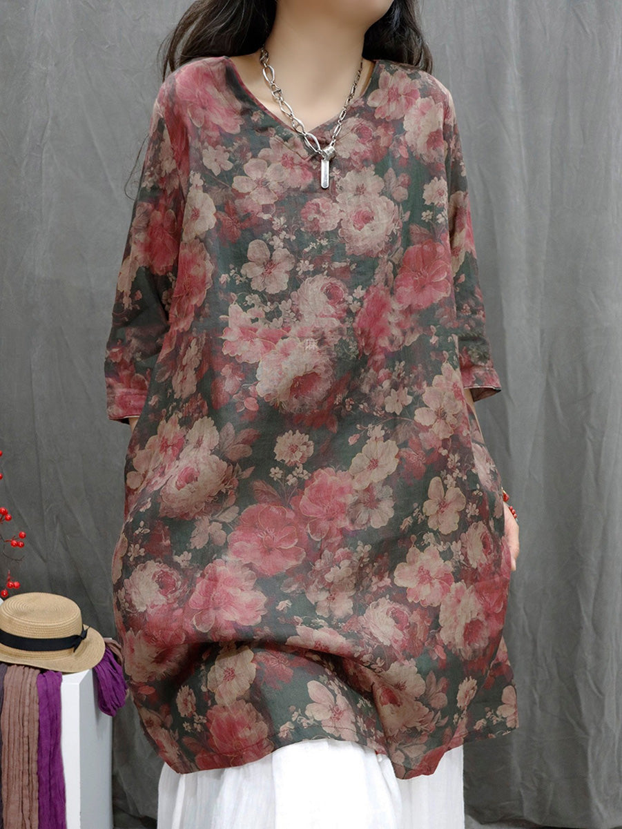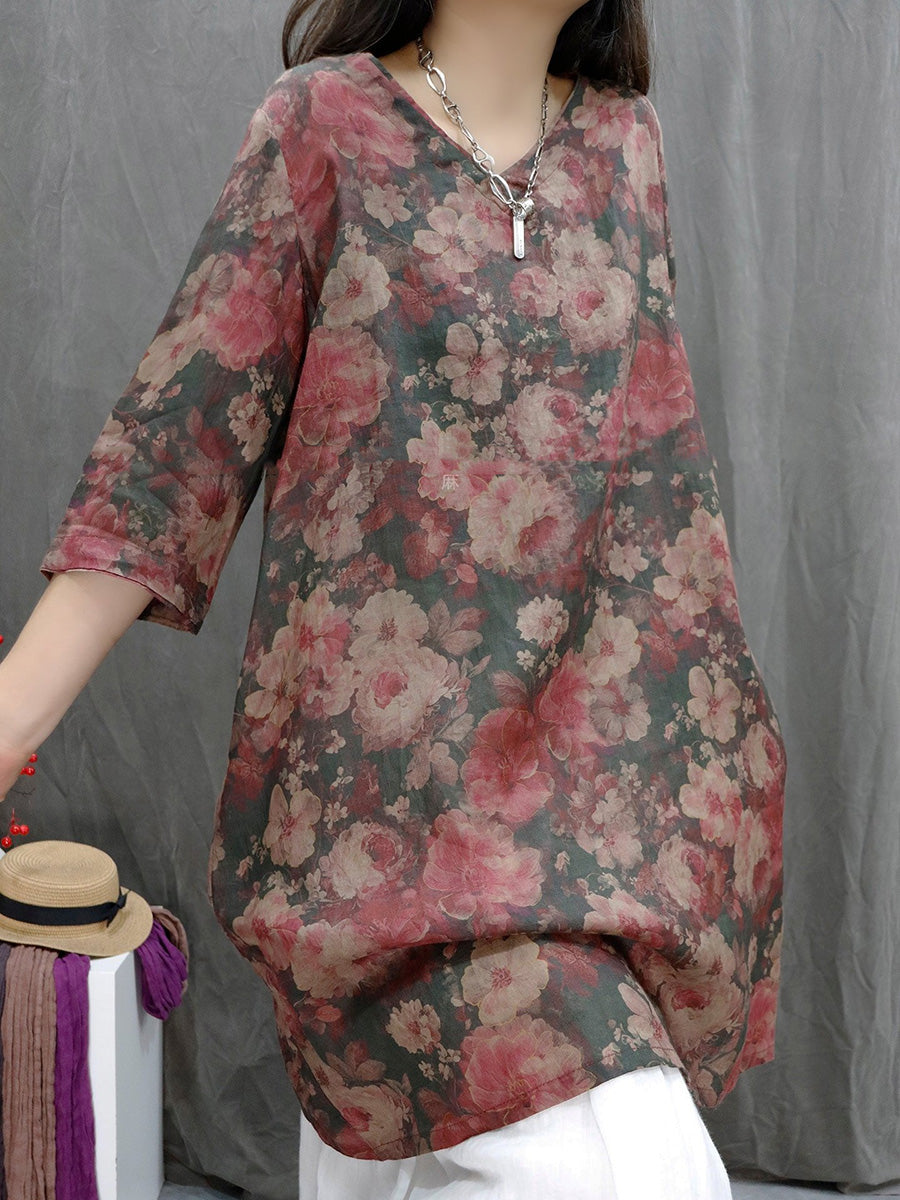 Women Summer Artsy Flower V-Neck 100%Ramie Shirt