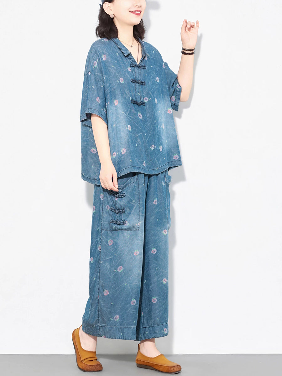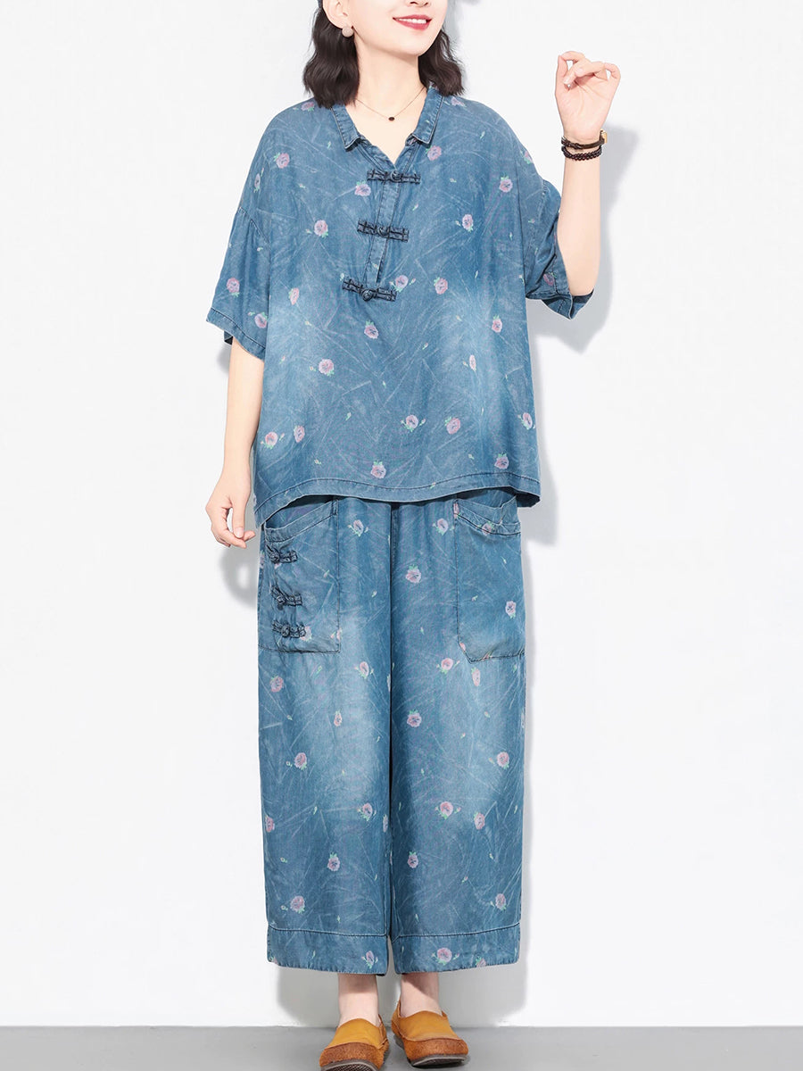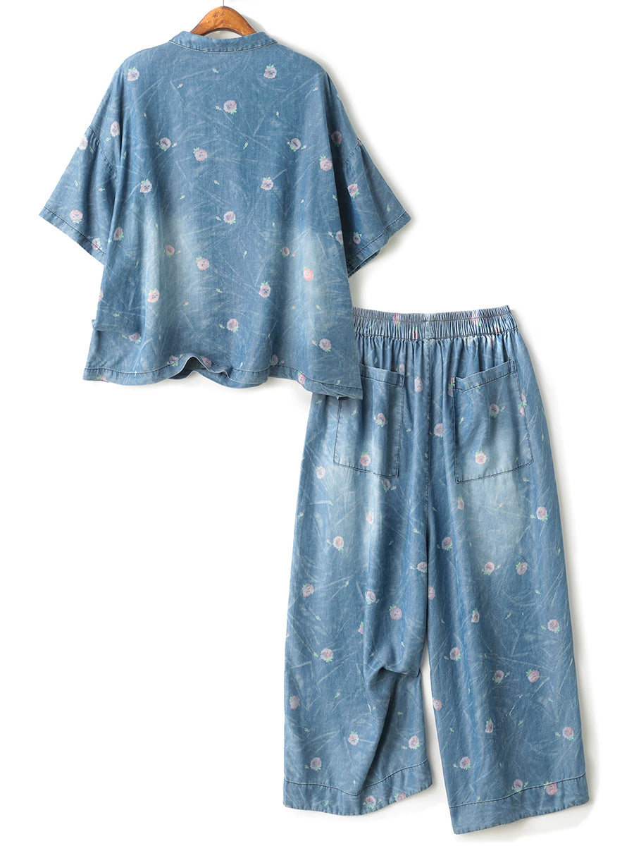 Women Summer Ethnic Flower Denim Suits