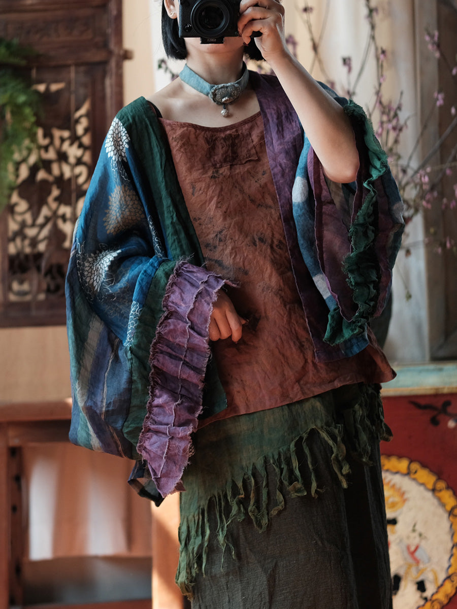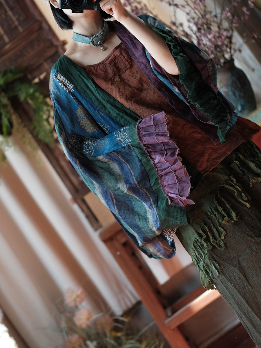 Women Summer Retro Flower Patchwork Linen Shirt