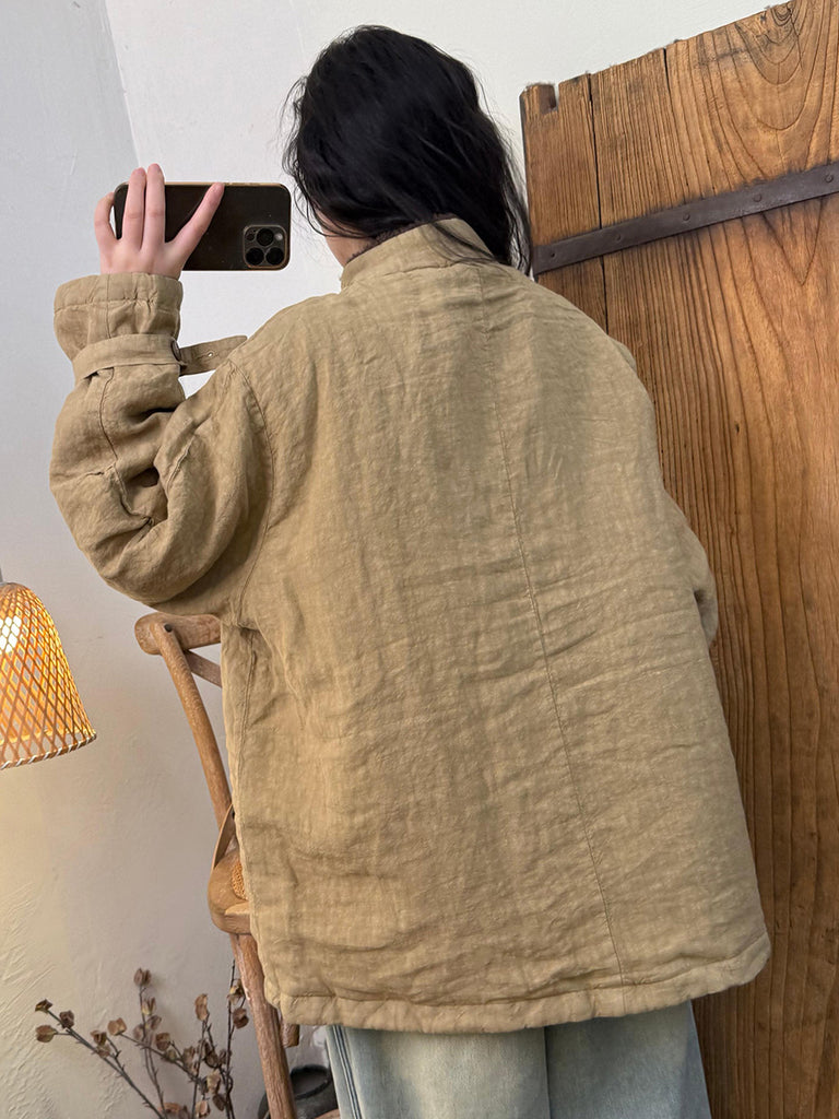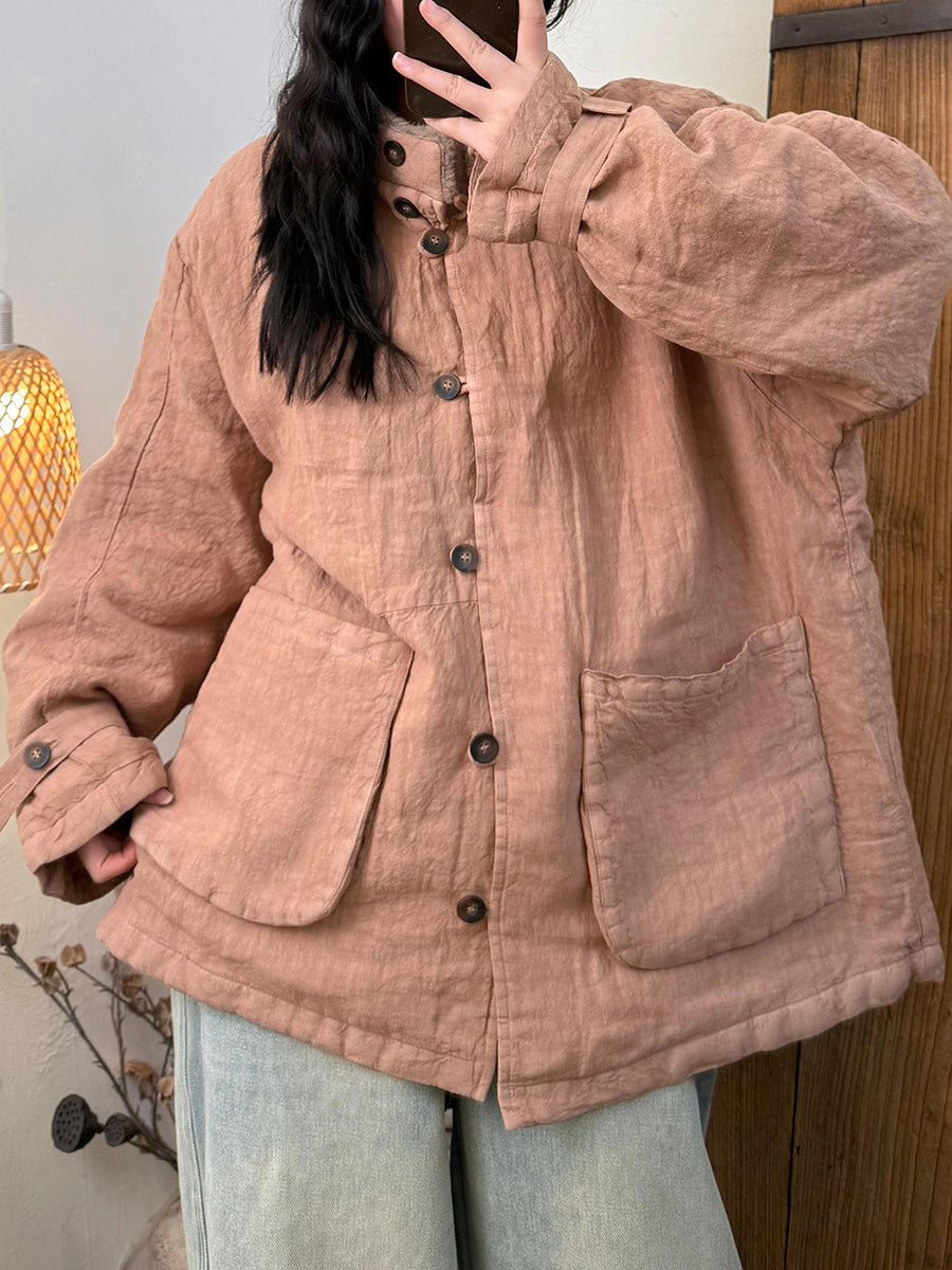 Women Vintage Winter Fleece Linen Stand Collar Coat