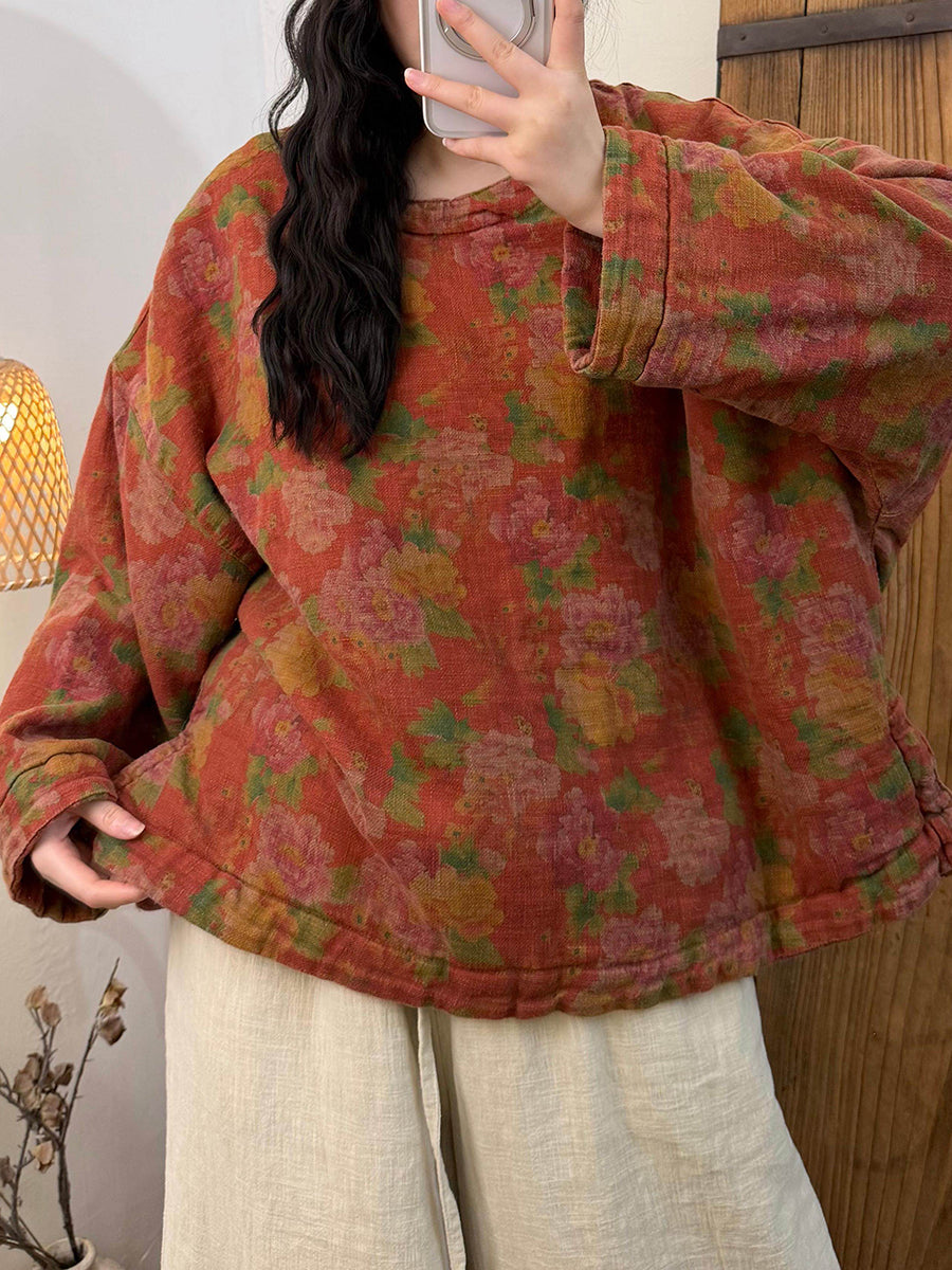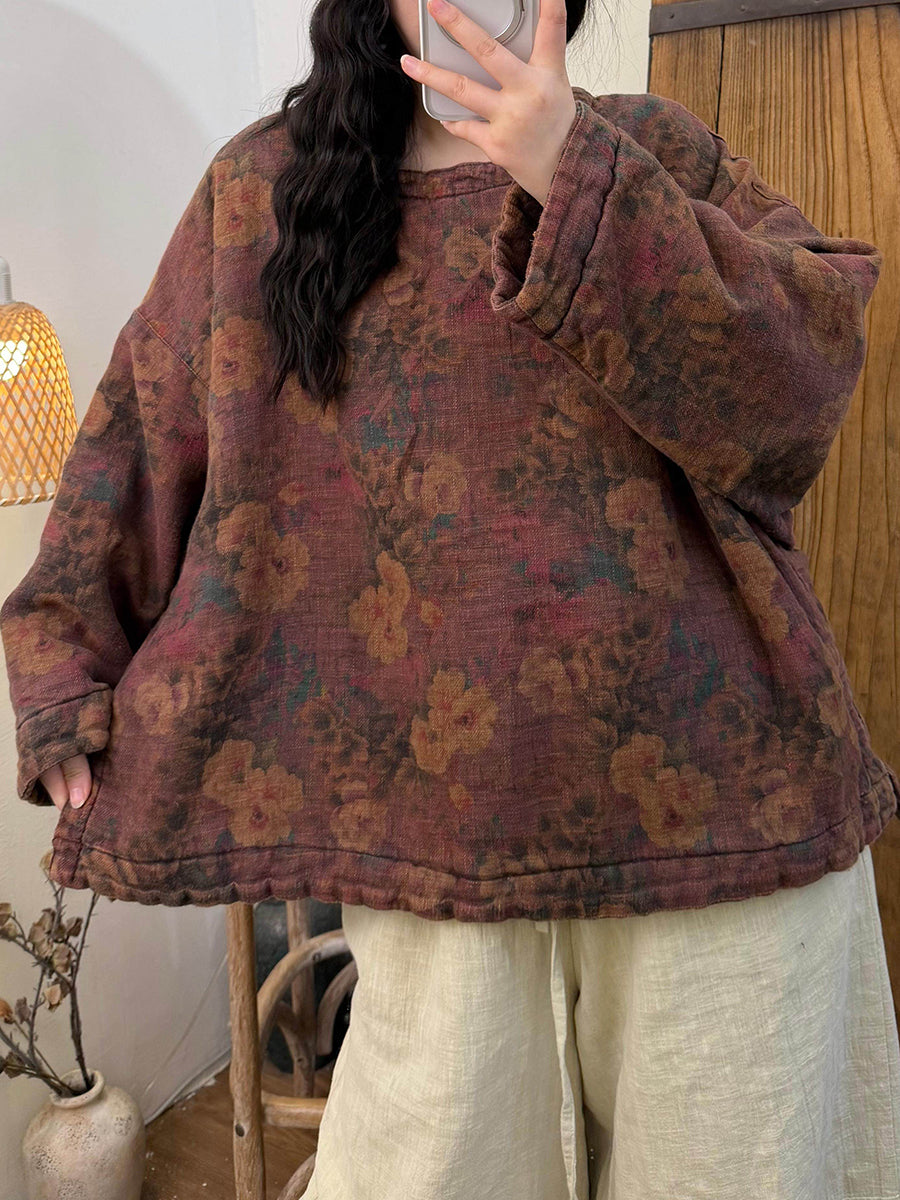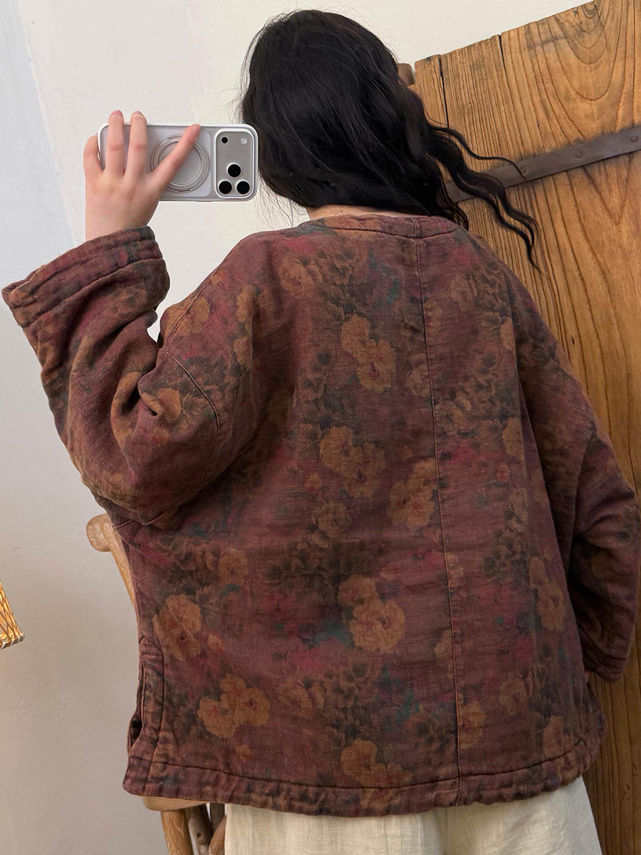 Women Winter Retro Worn Flower O-Neck Coat