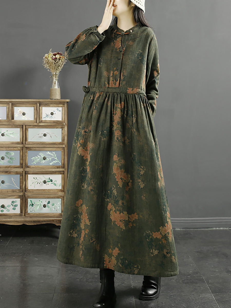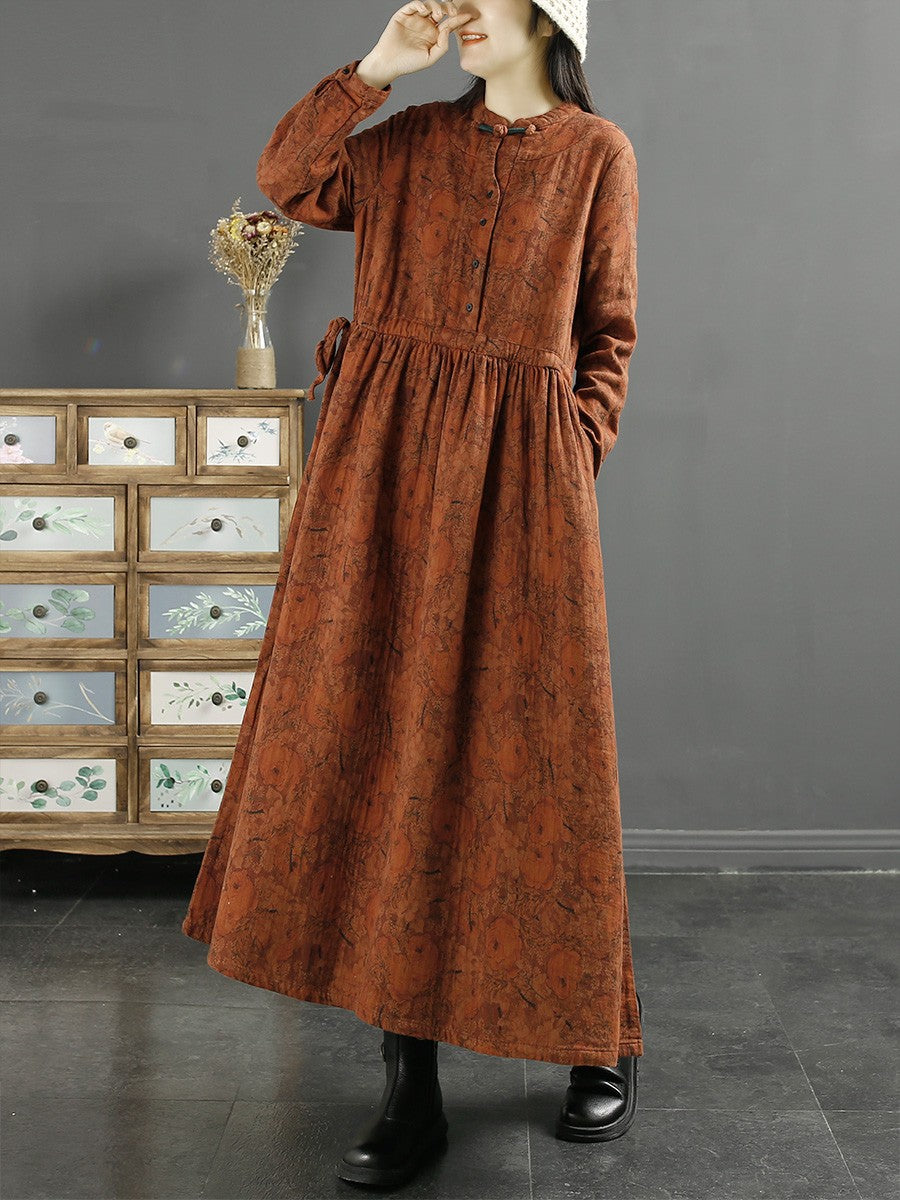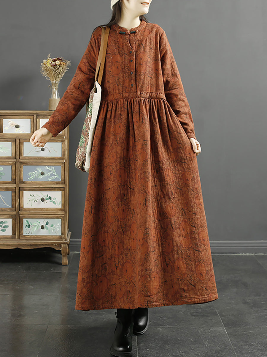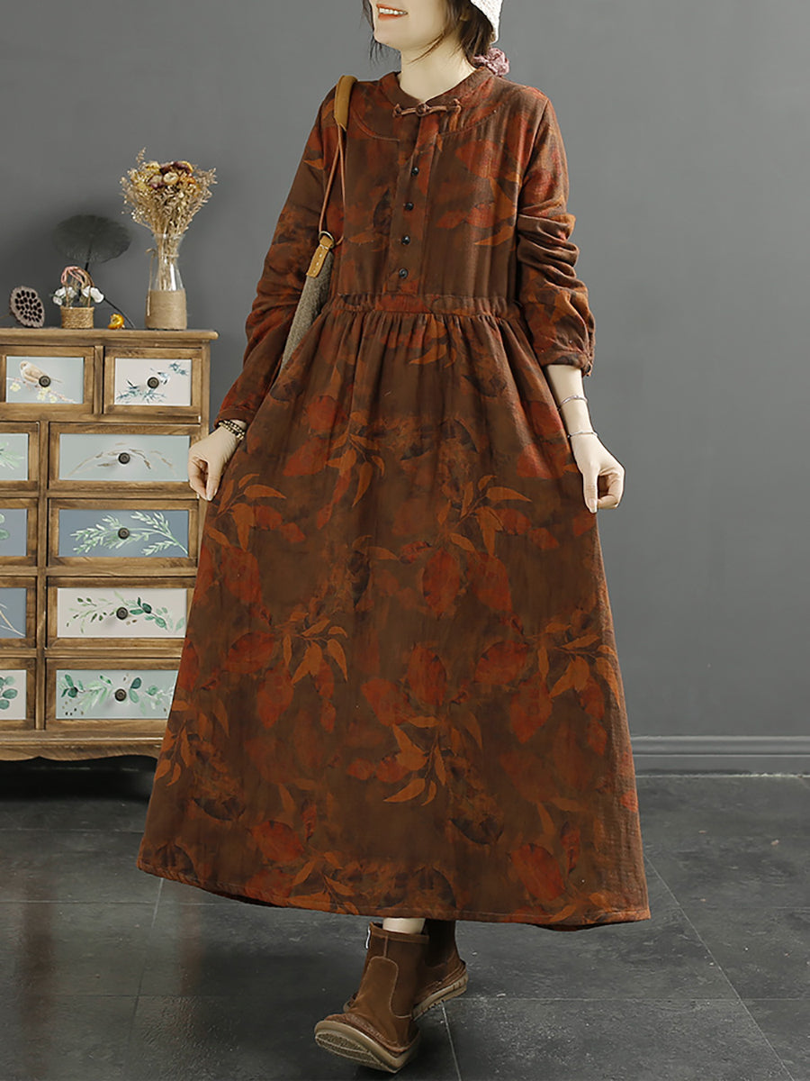 Plus Size Kvinder Efterårskjole Vintage Bladprint Bomuld