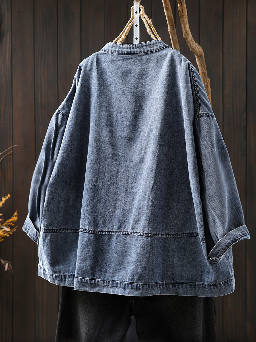 Plus Size Kvinder Sommer Retro Ren Farve Stand Collar Denim Frakke