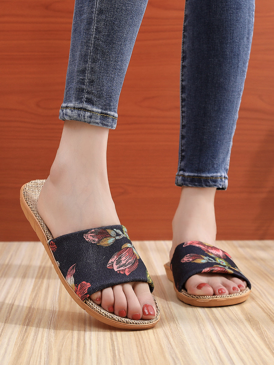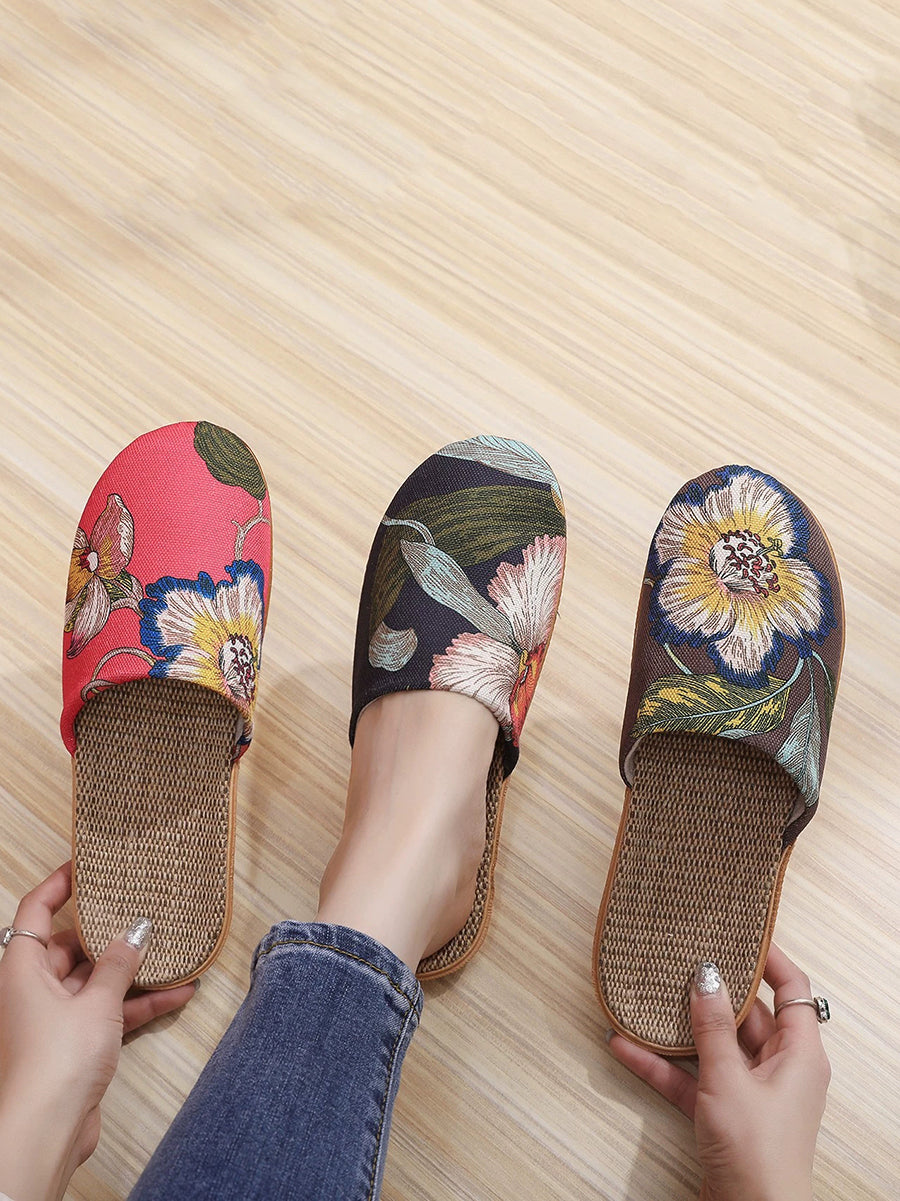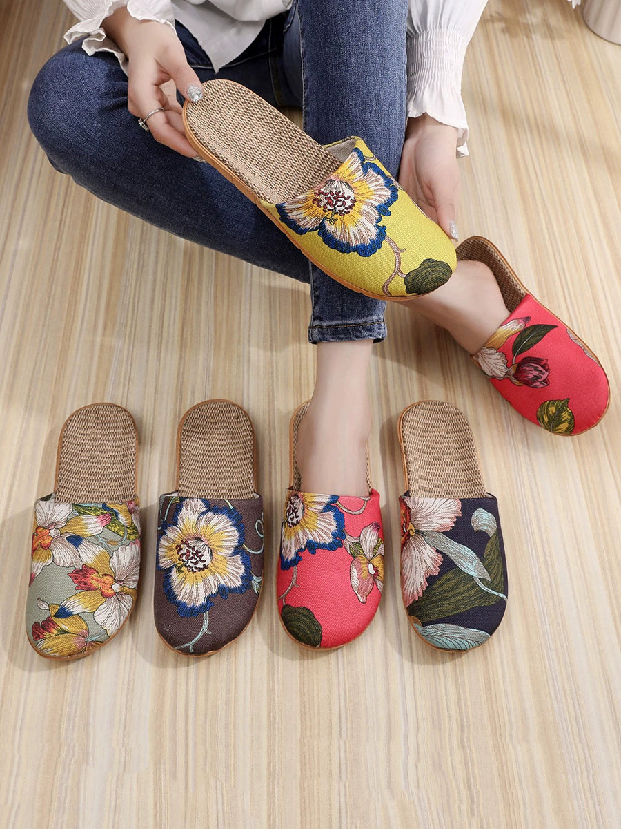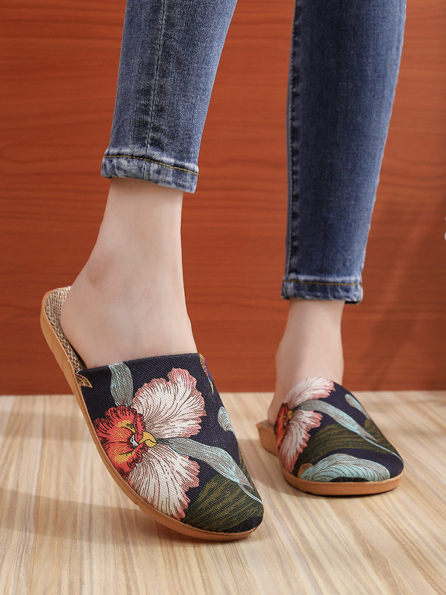 Flade hjemmesko i vintage-stil med blomsterprint i hør