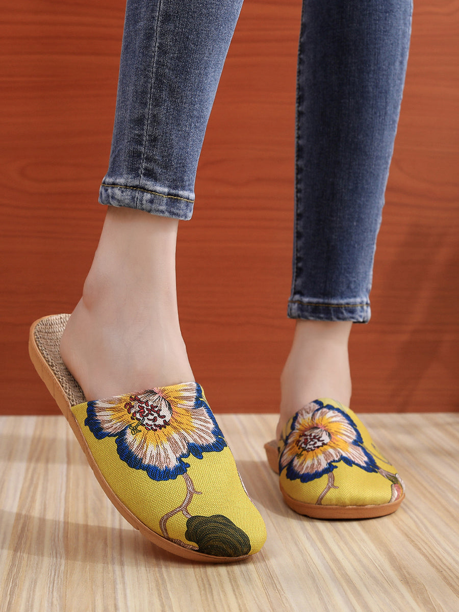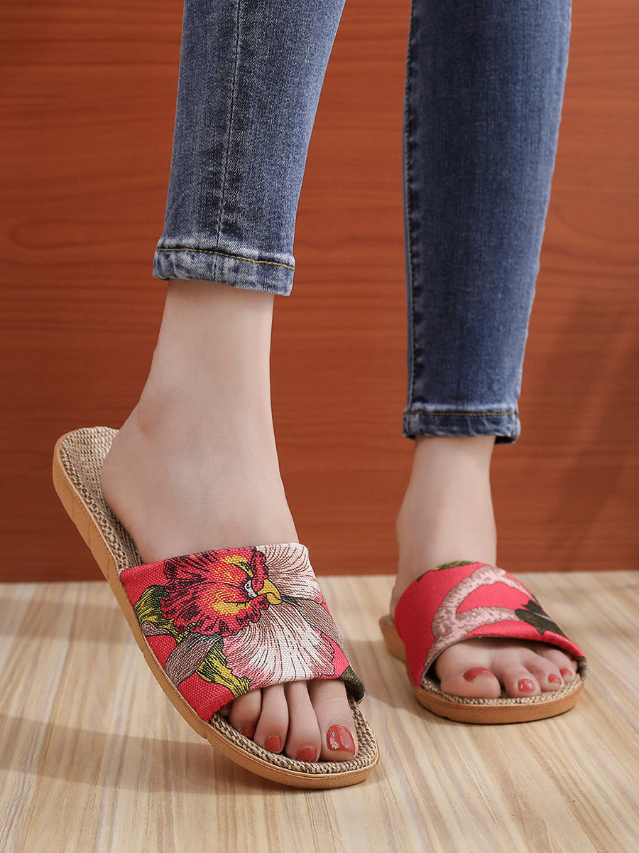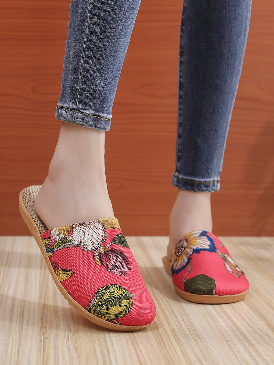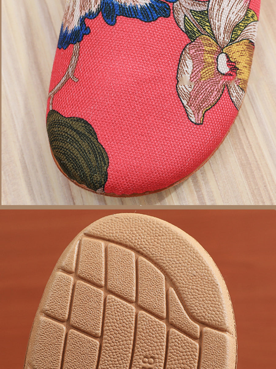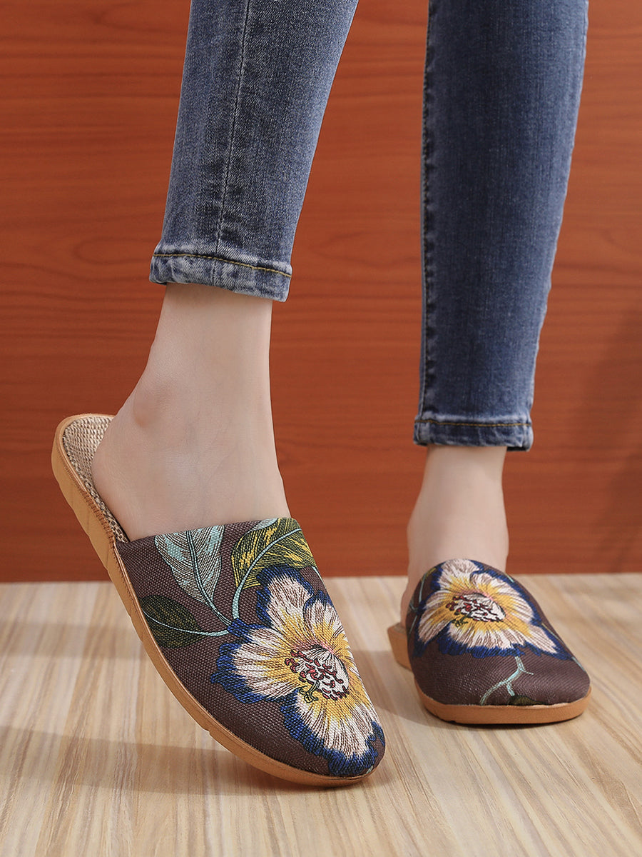 Flade hjemmesko i vintage-stil med blomsterprint i hør