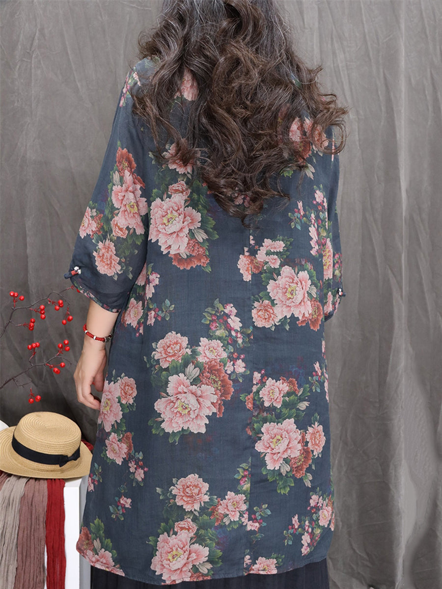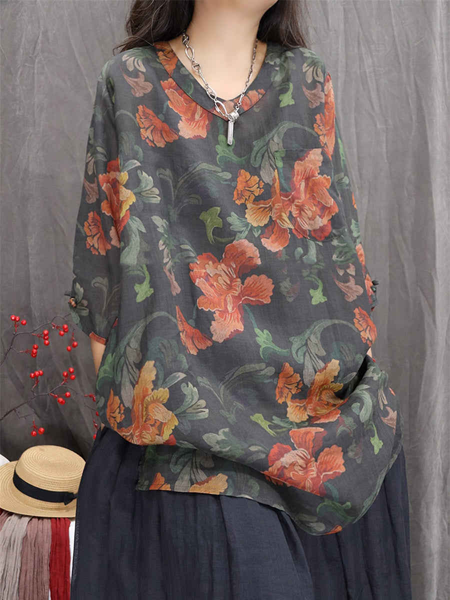 Kunstnerisk forårsblomstrende bluse med V-hals og 100% ramie til kvinder
