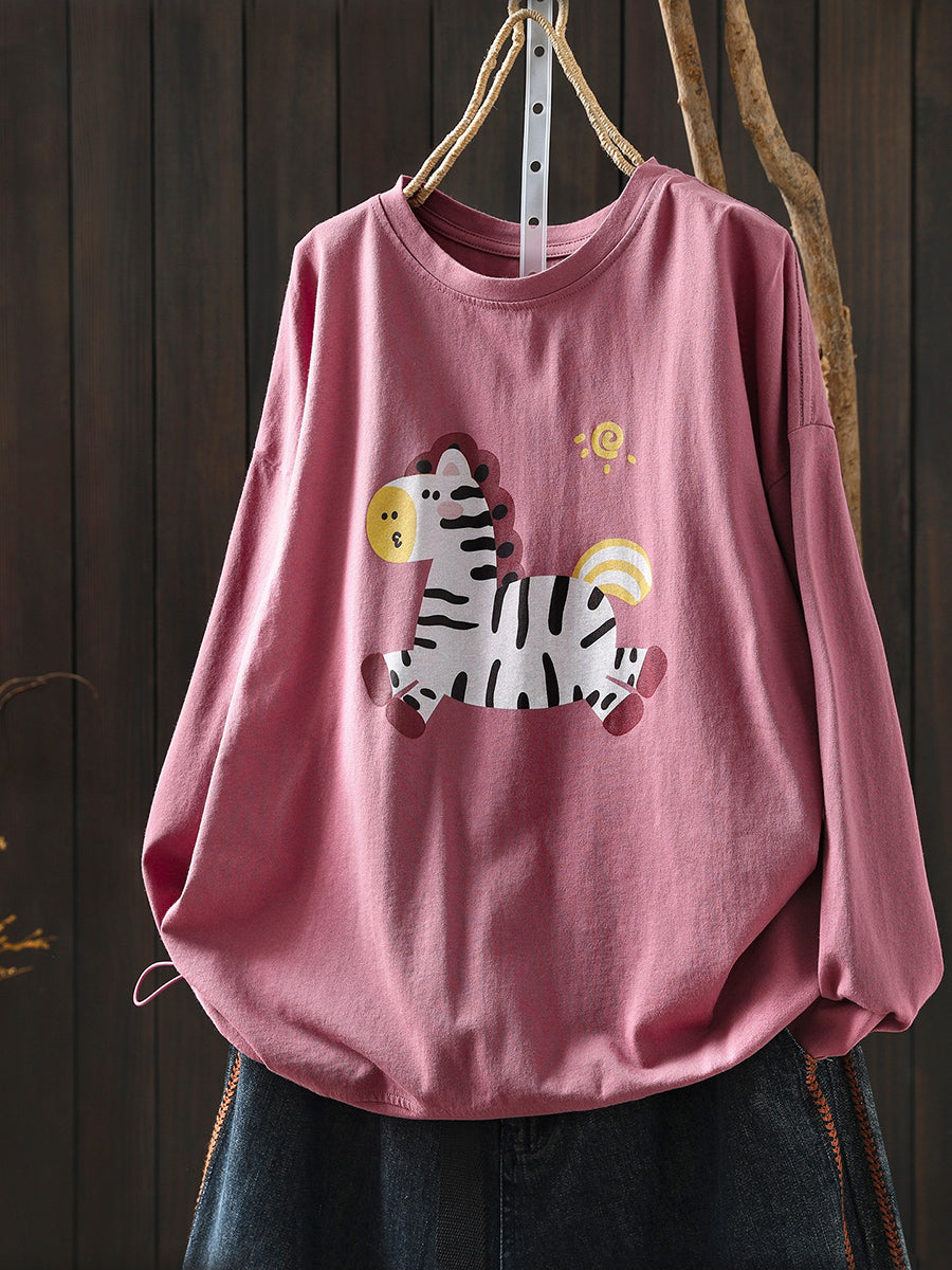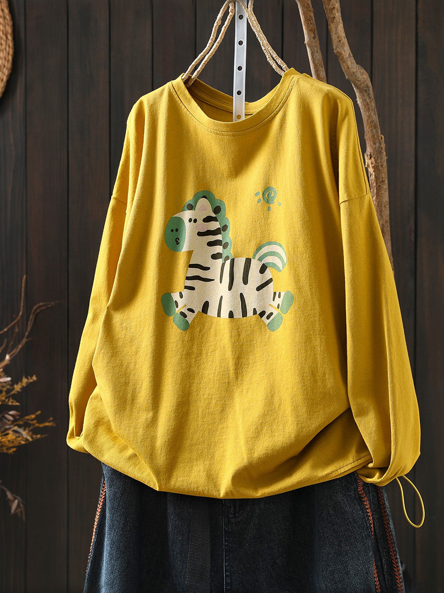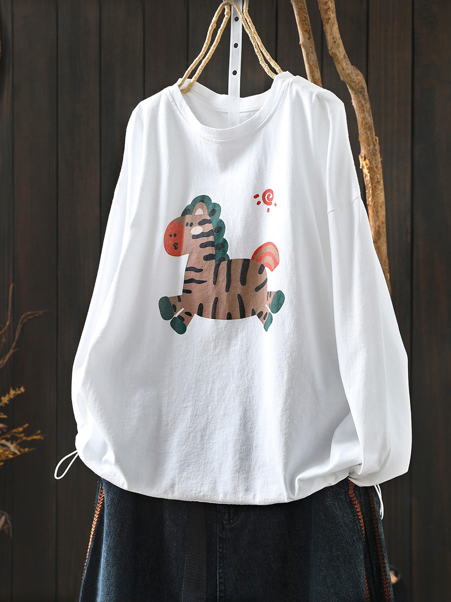 Kunstnerisk forårsbluse med hestemotiv i bomuld og O-hals til kvinder