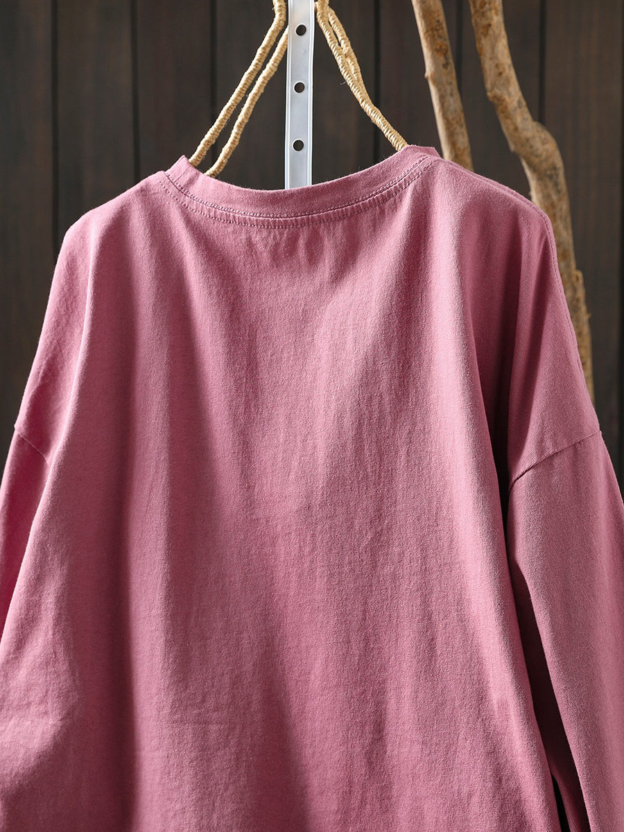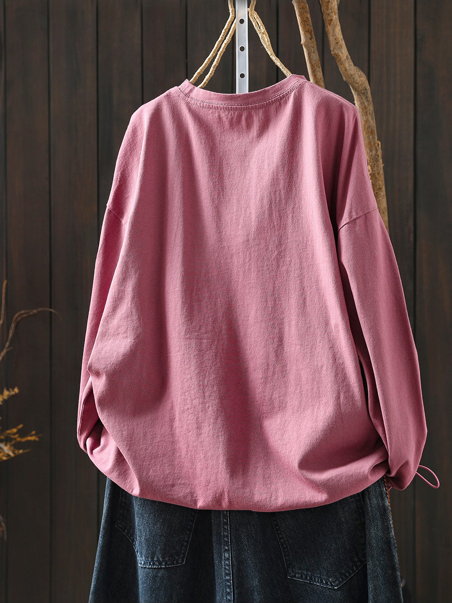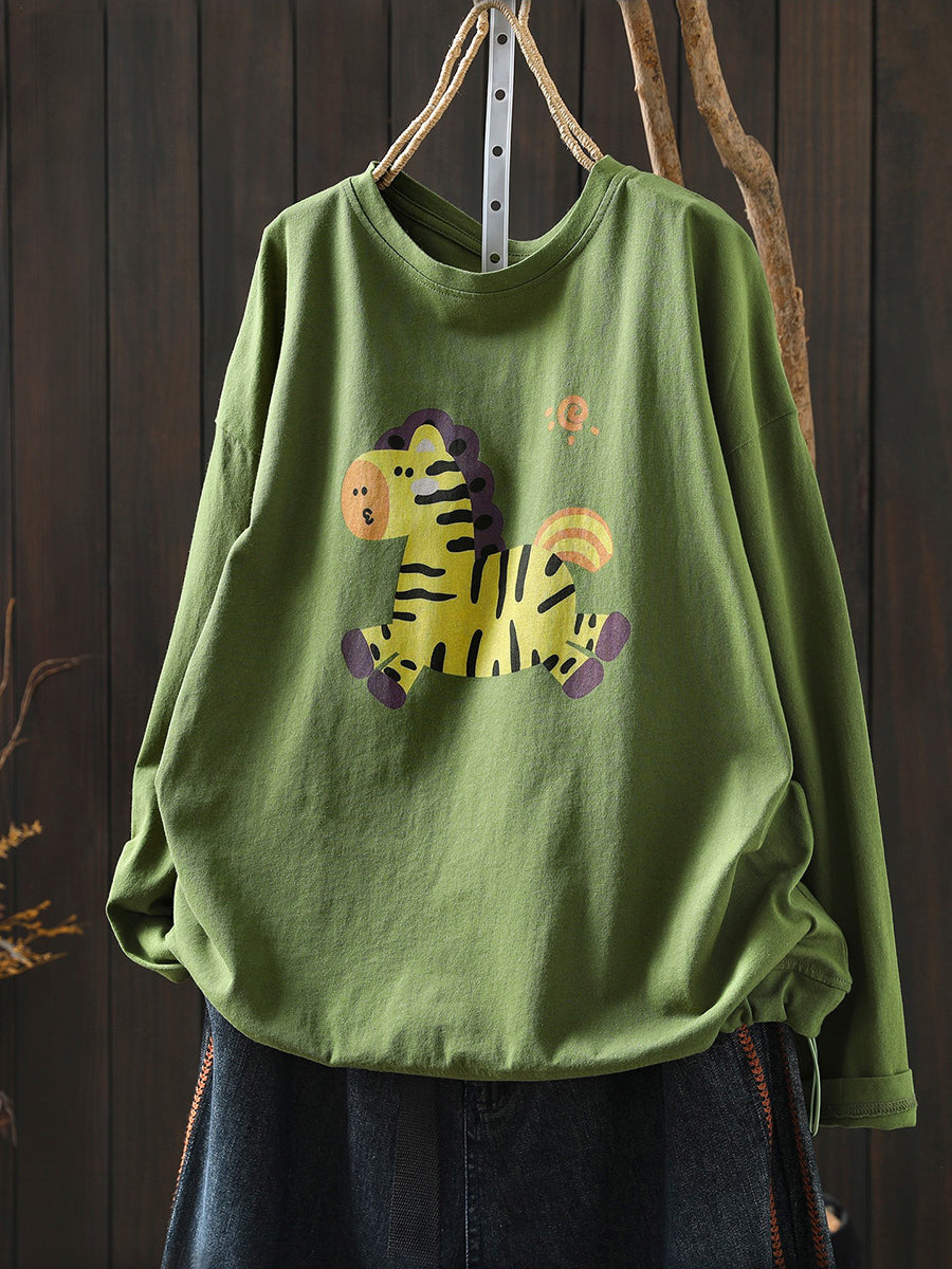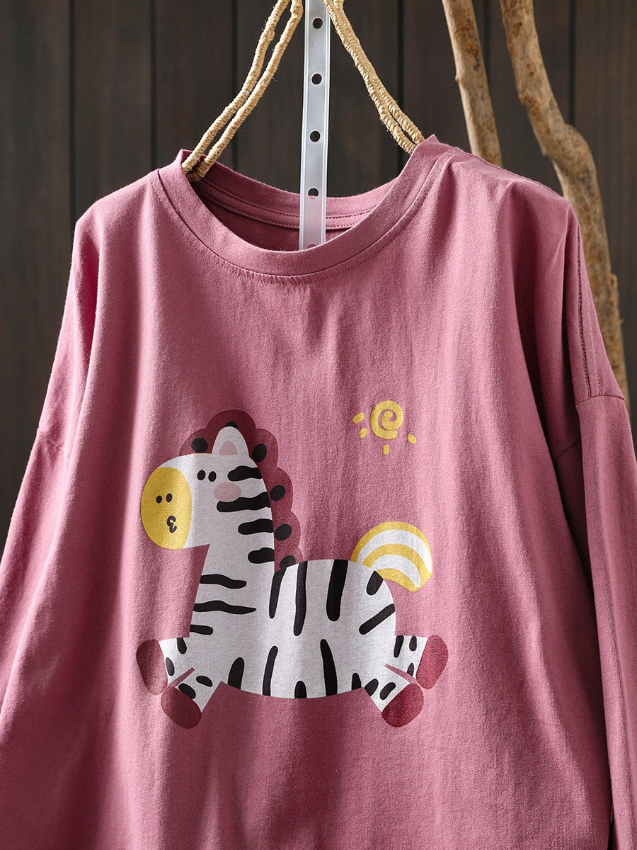 Kunstnerisk forårsbluse med hestemotiv i bomuld og O-hals til kvinder