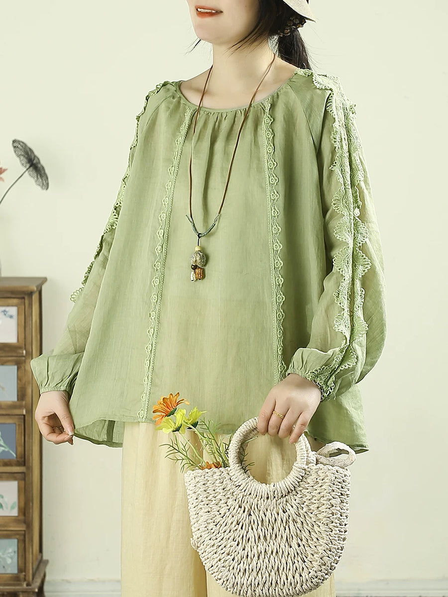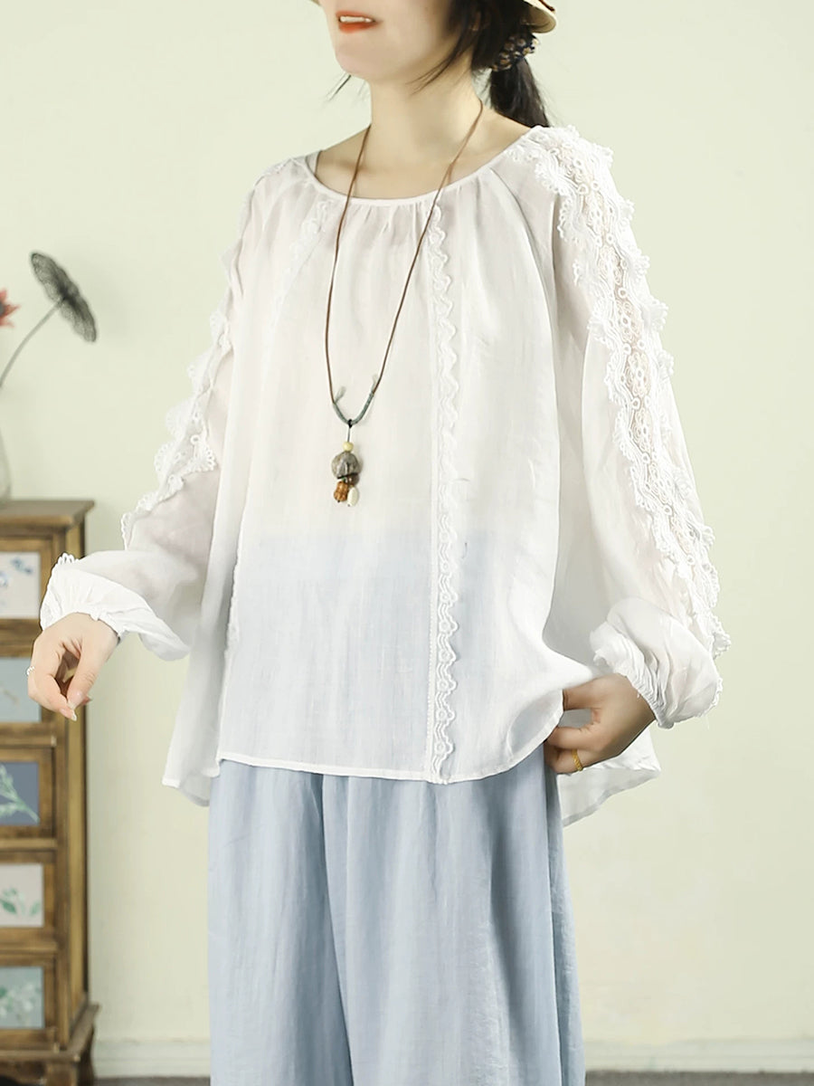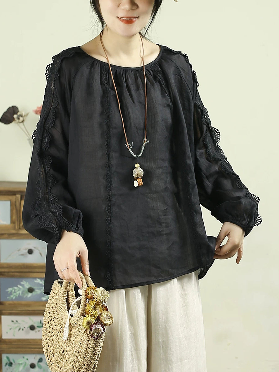 Kunstnerisk forårsskjorte med blondedetaljer og O-hals i 100% ramie til kvinder