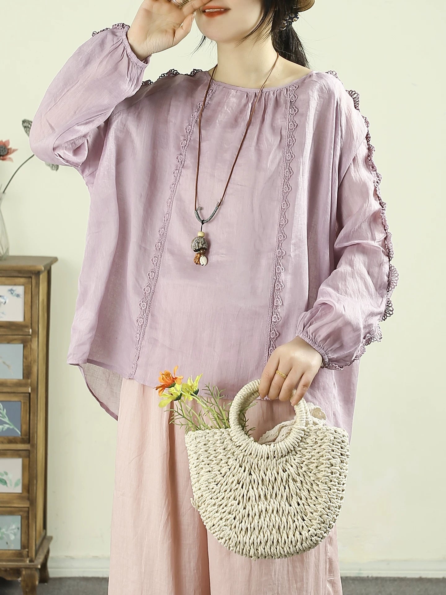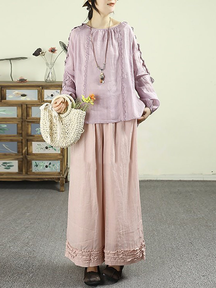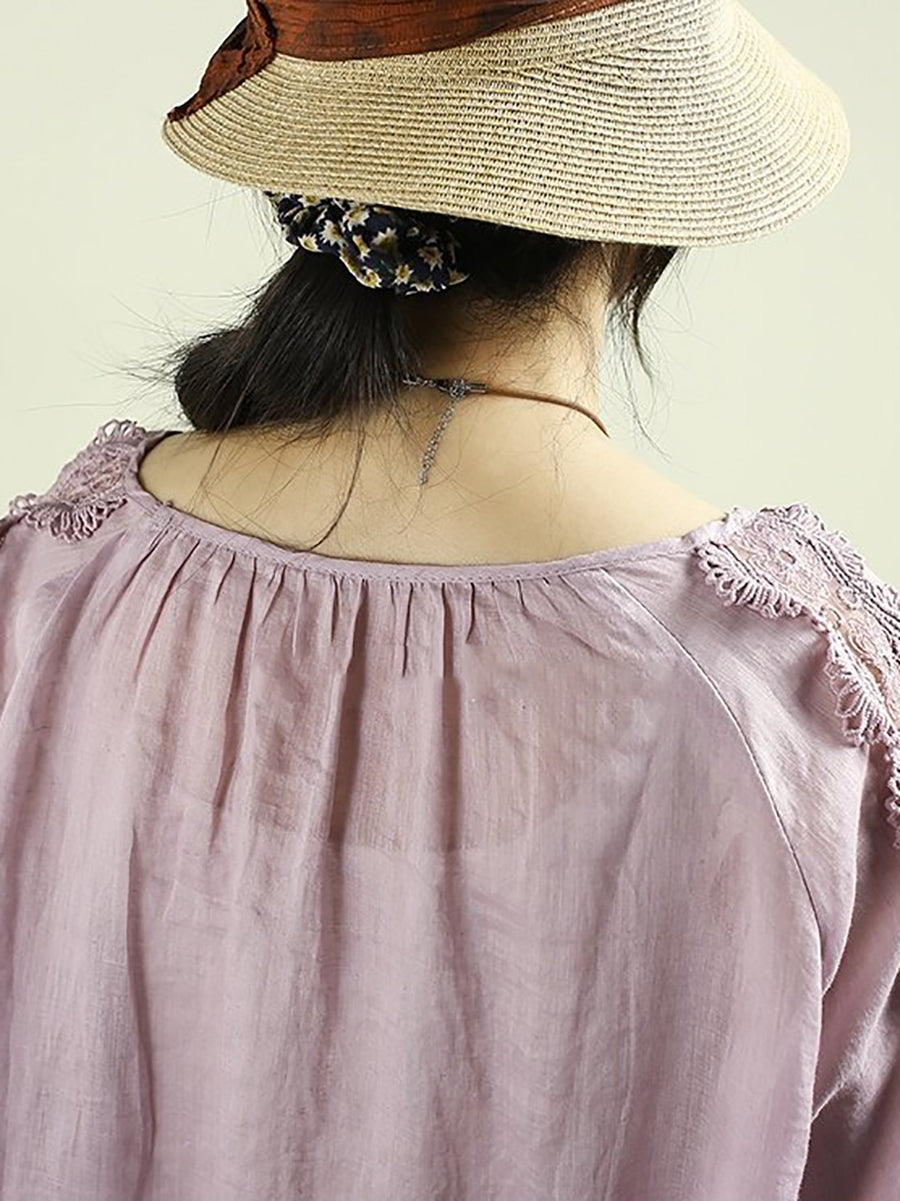 Kunstnerisk forårsskjorte med blondedetaljer og O-hals i 100% ramie til kvinder
