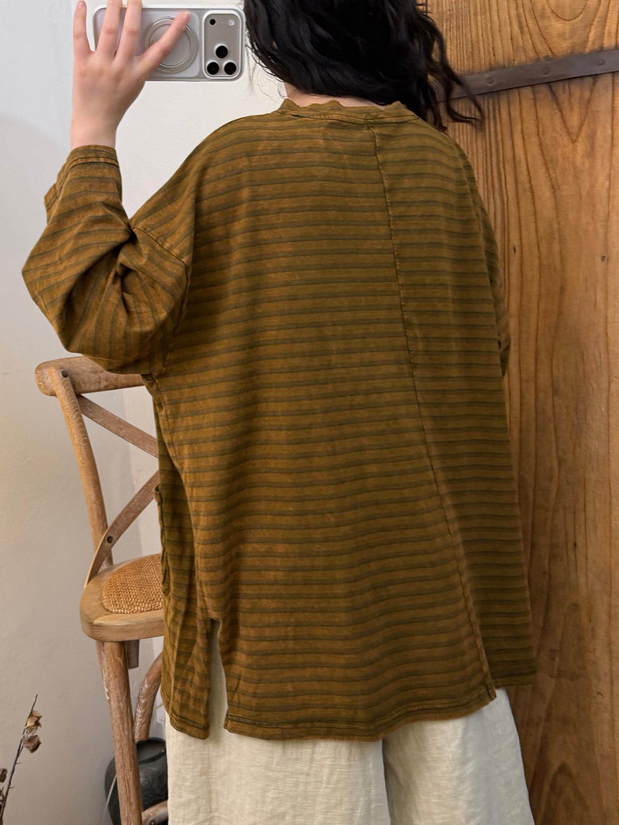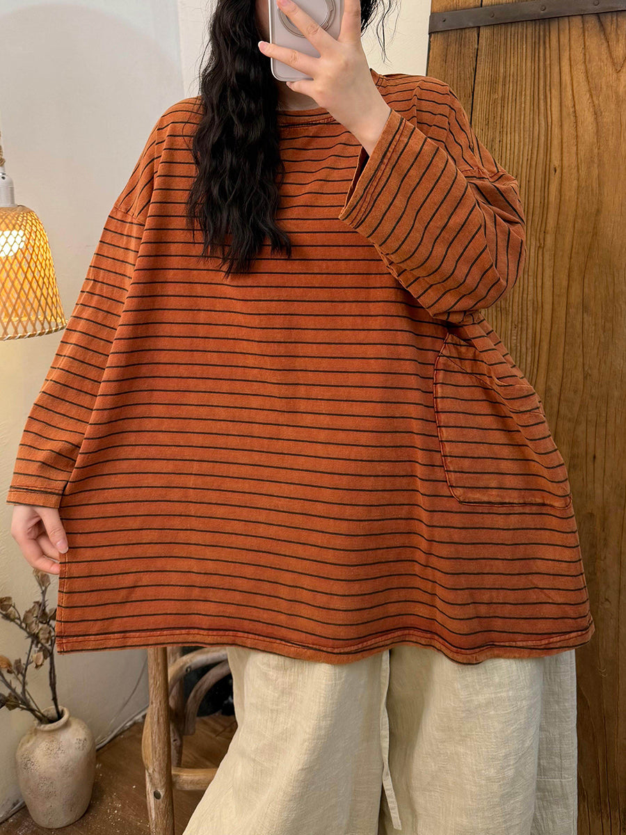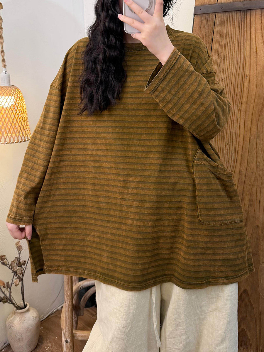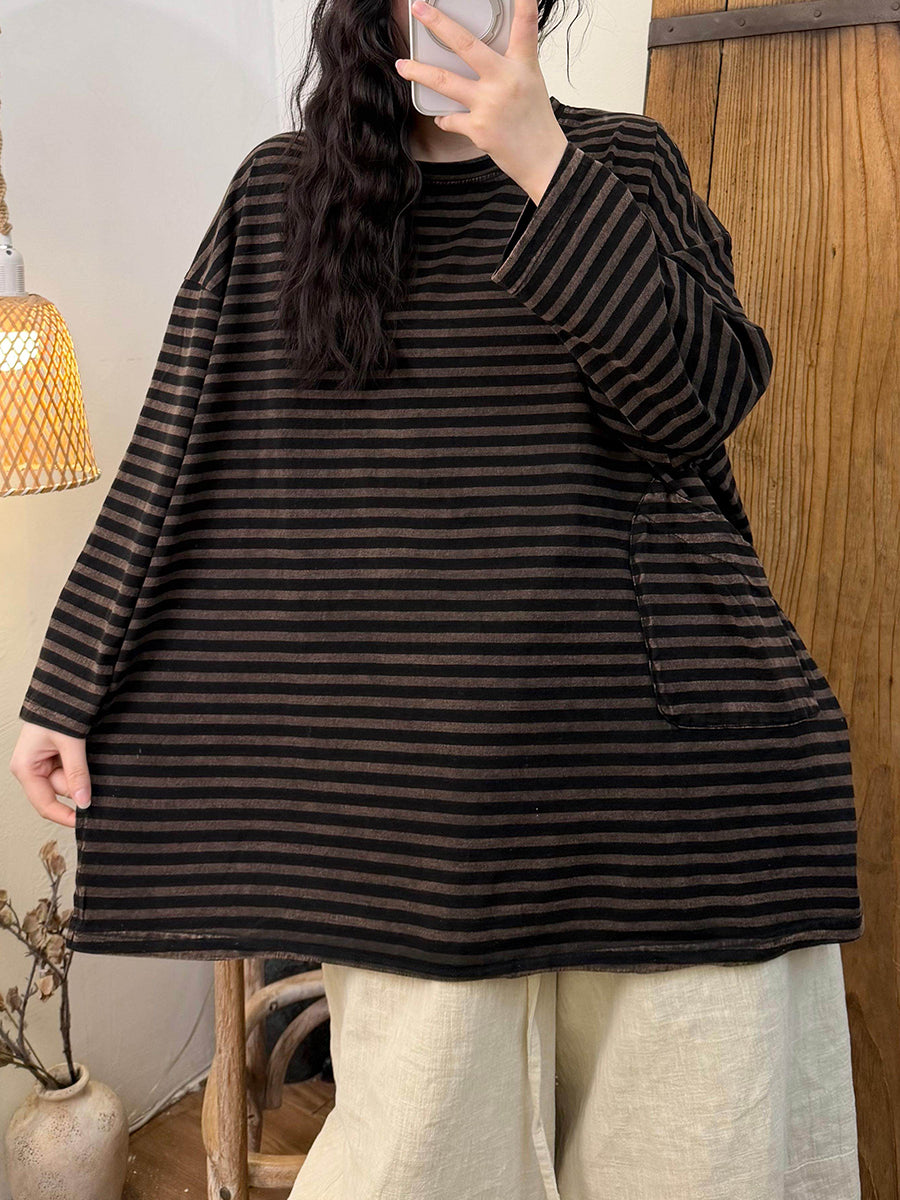 Kunstnerisk forårsstribet bomuldsbluse med O-hals til kvinder