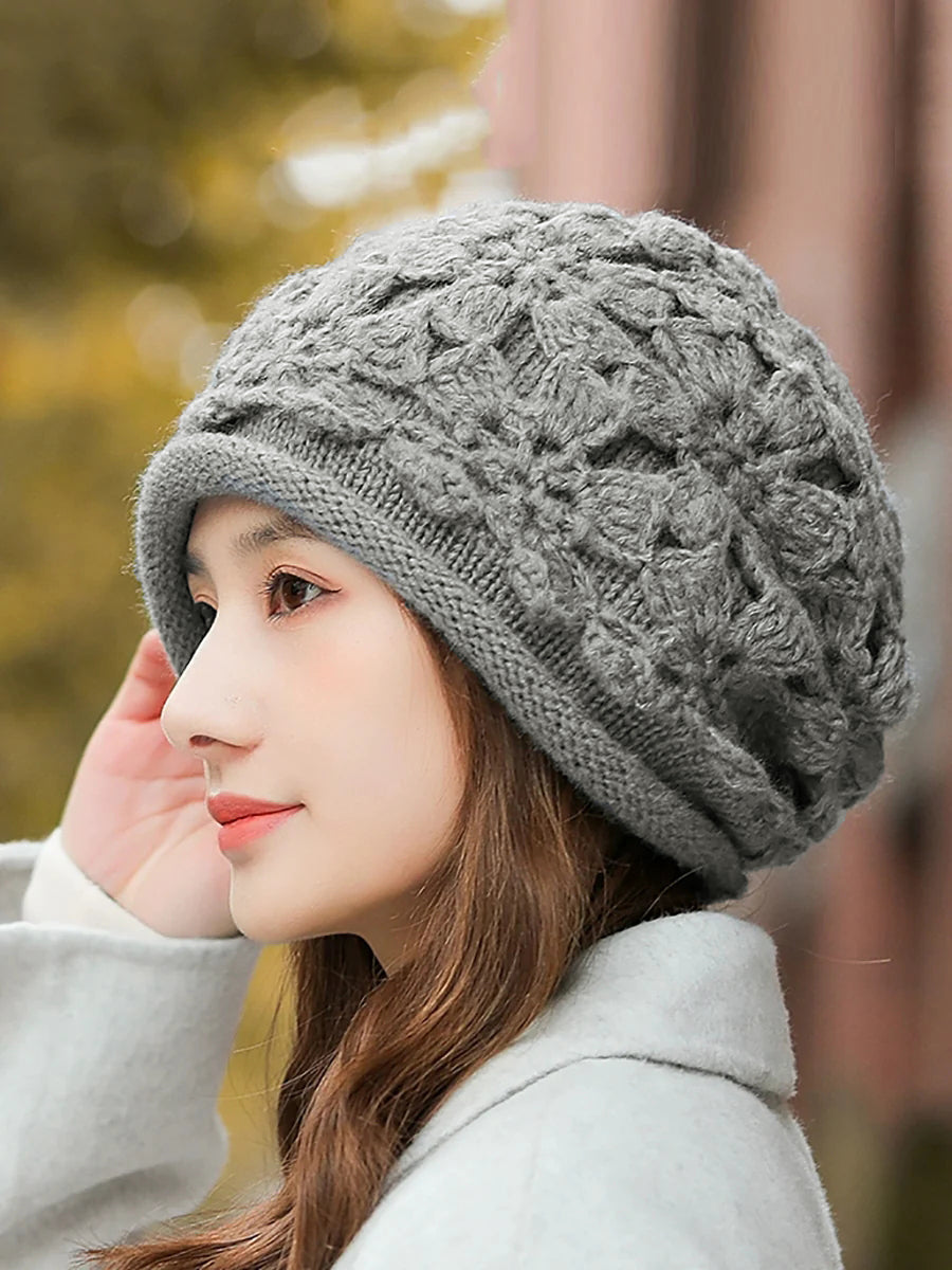 Kunstnerisk vinterblomst strikket hue til kvinder
