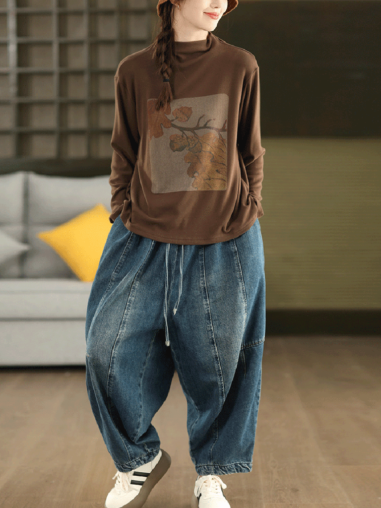 Kvinder Efterårsbluse med kunstnerisk print og halv rullekrave