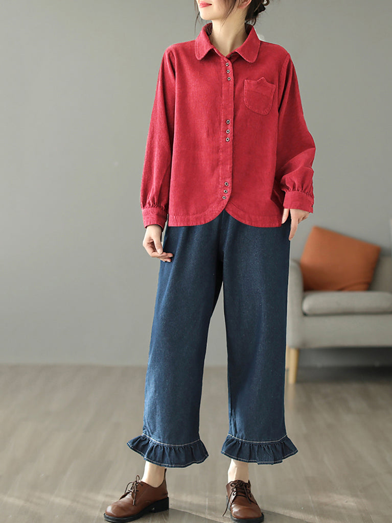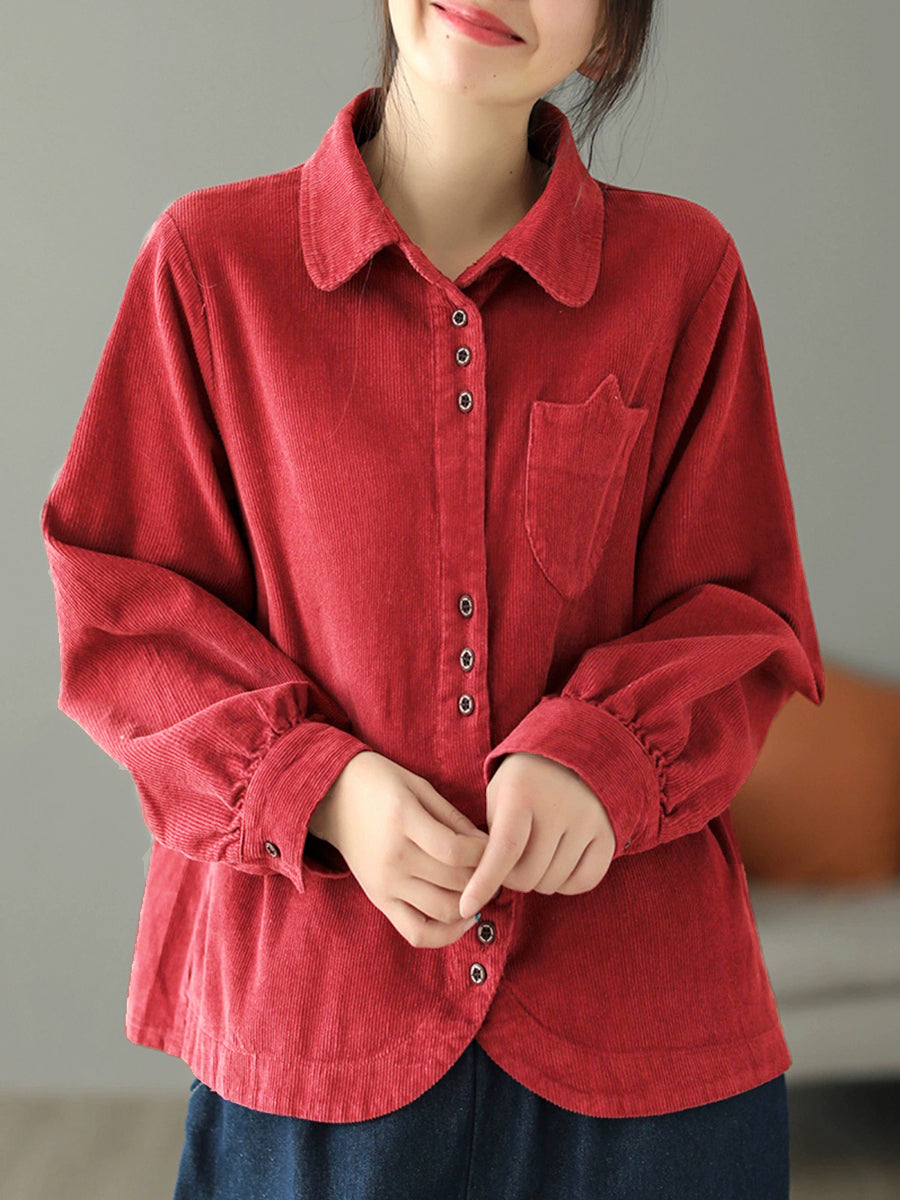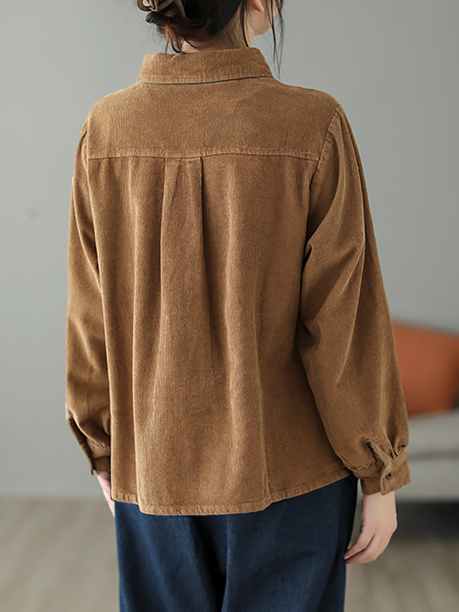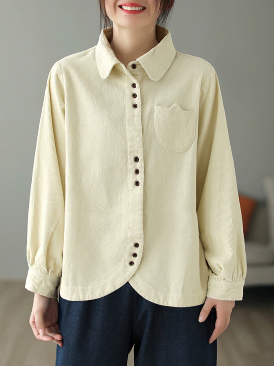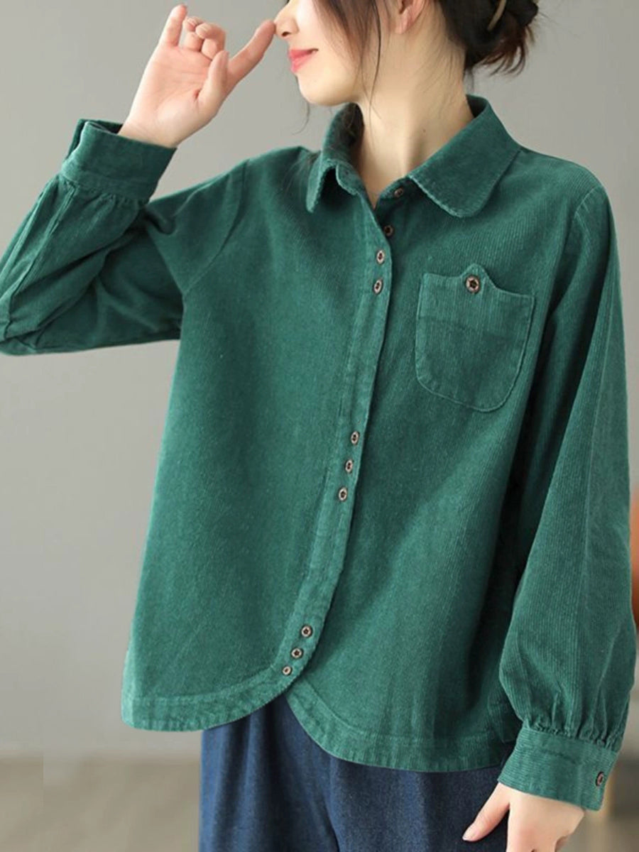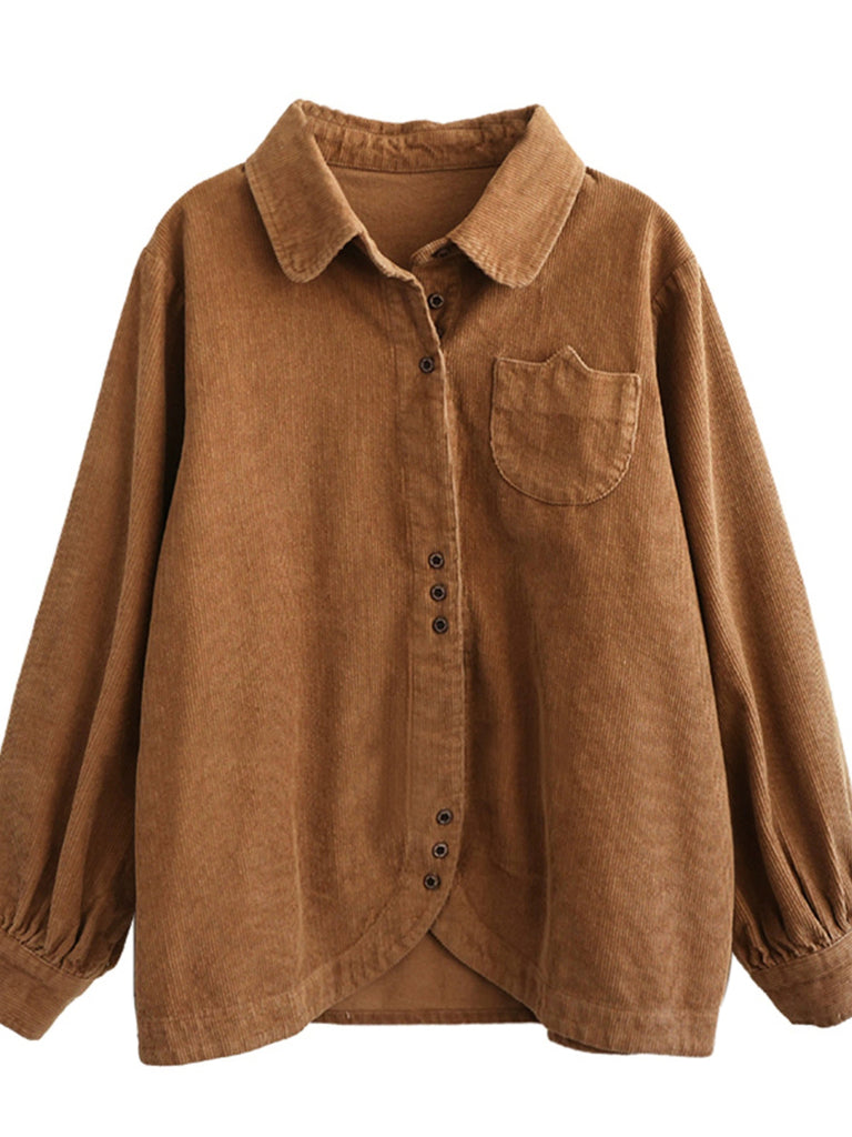 Kvinder Efterårs Ren Farve Turn-down Krave Corduroy Skjorte