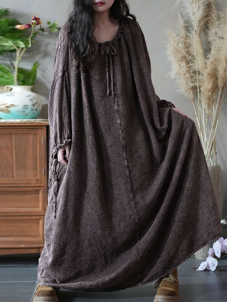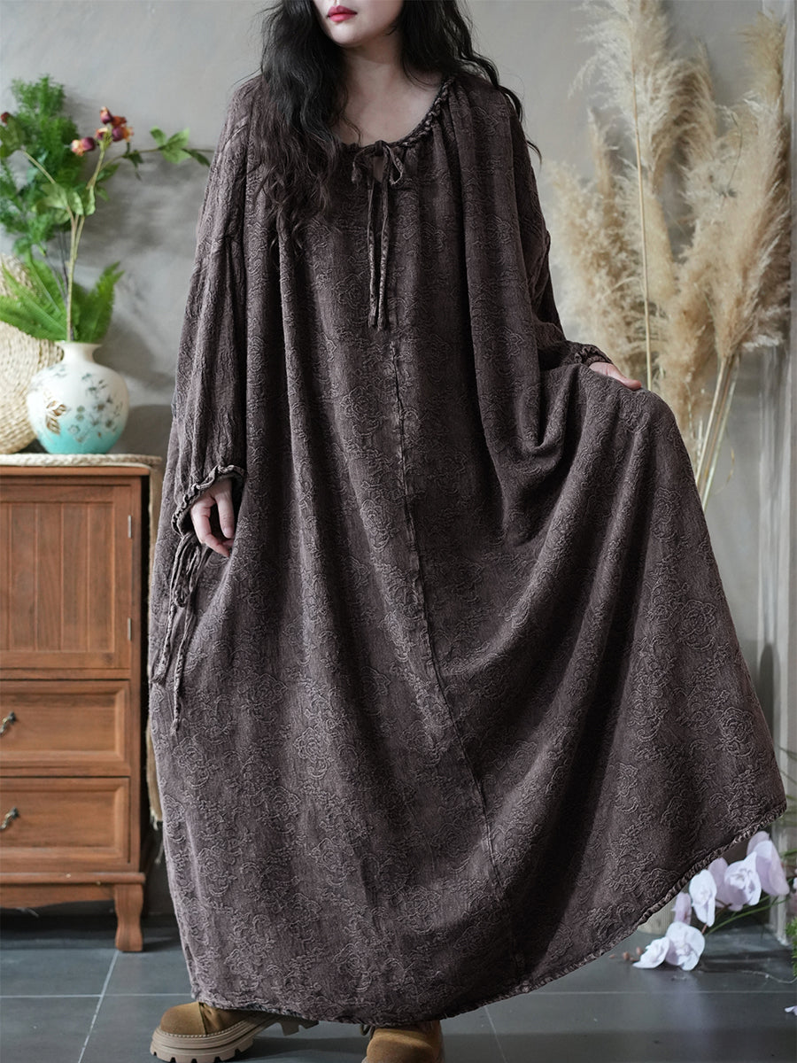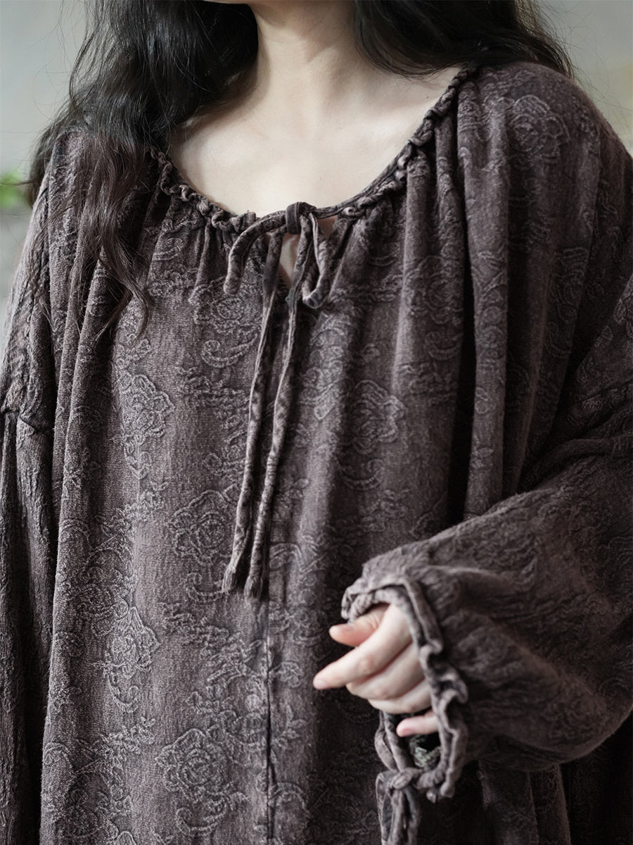 Kvinder Efterårs Retro Jacquard O-hals 100% Hørkjole