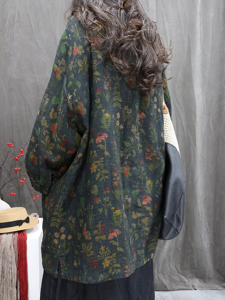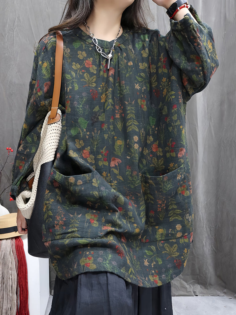 Dame Efterårs Vintage Blomster Hør O-hals Skjorte
