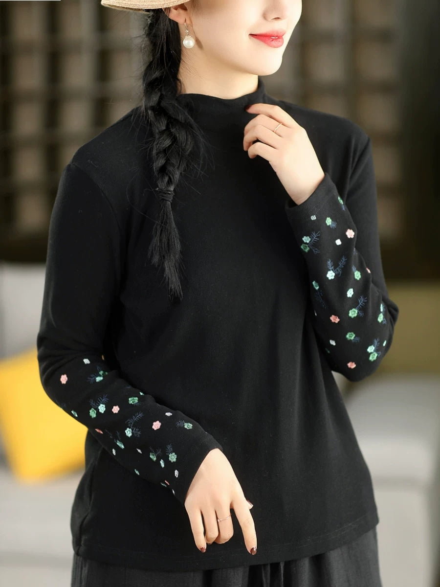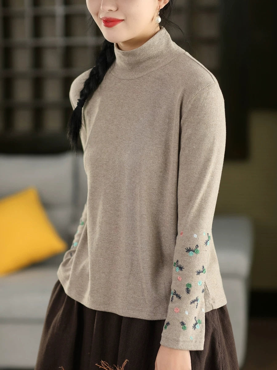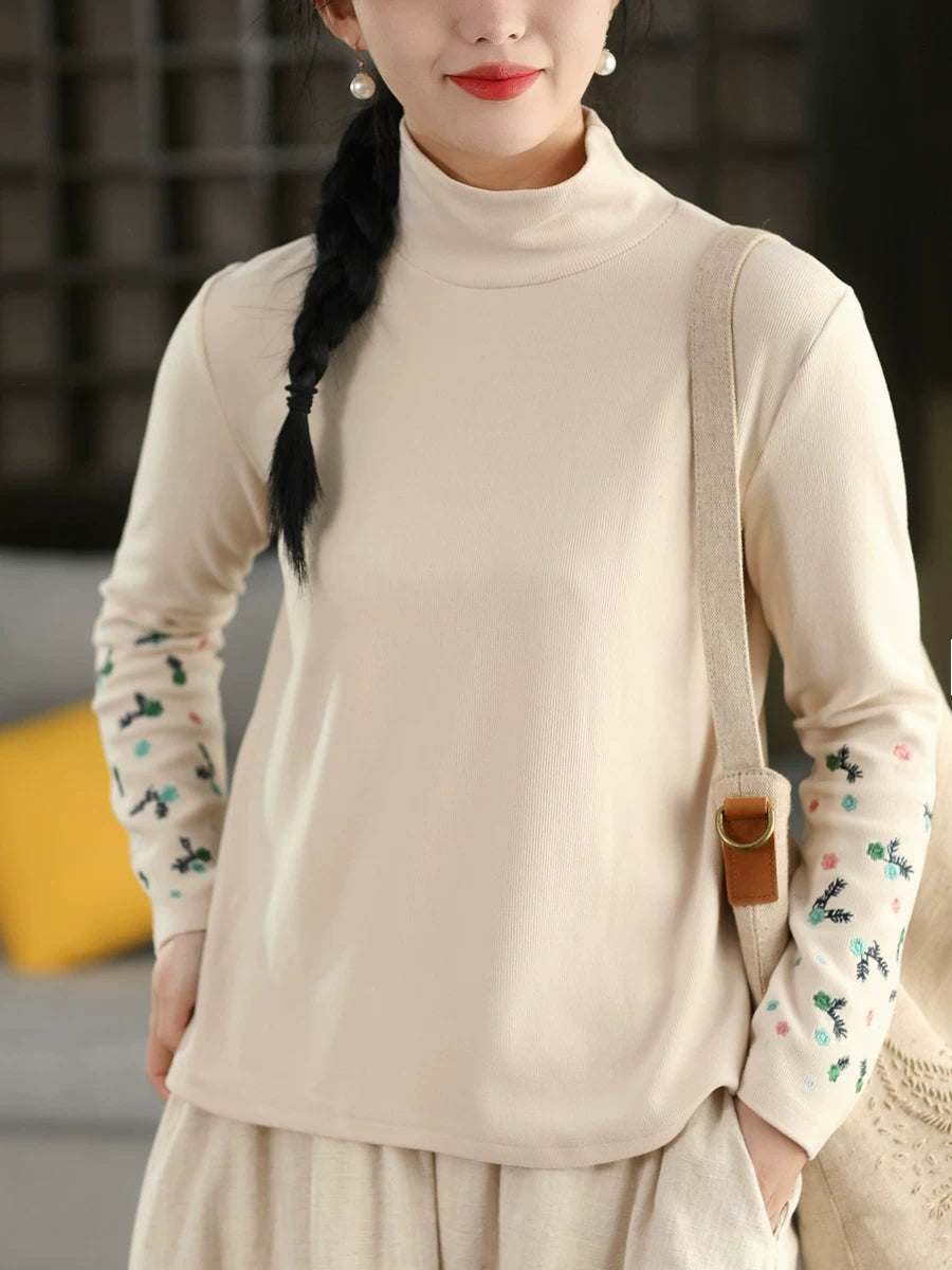 Kvinder Forårsbluse med kunstnerisk broderi og rullekrave
