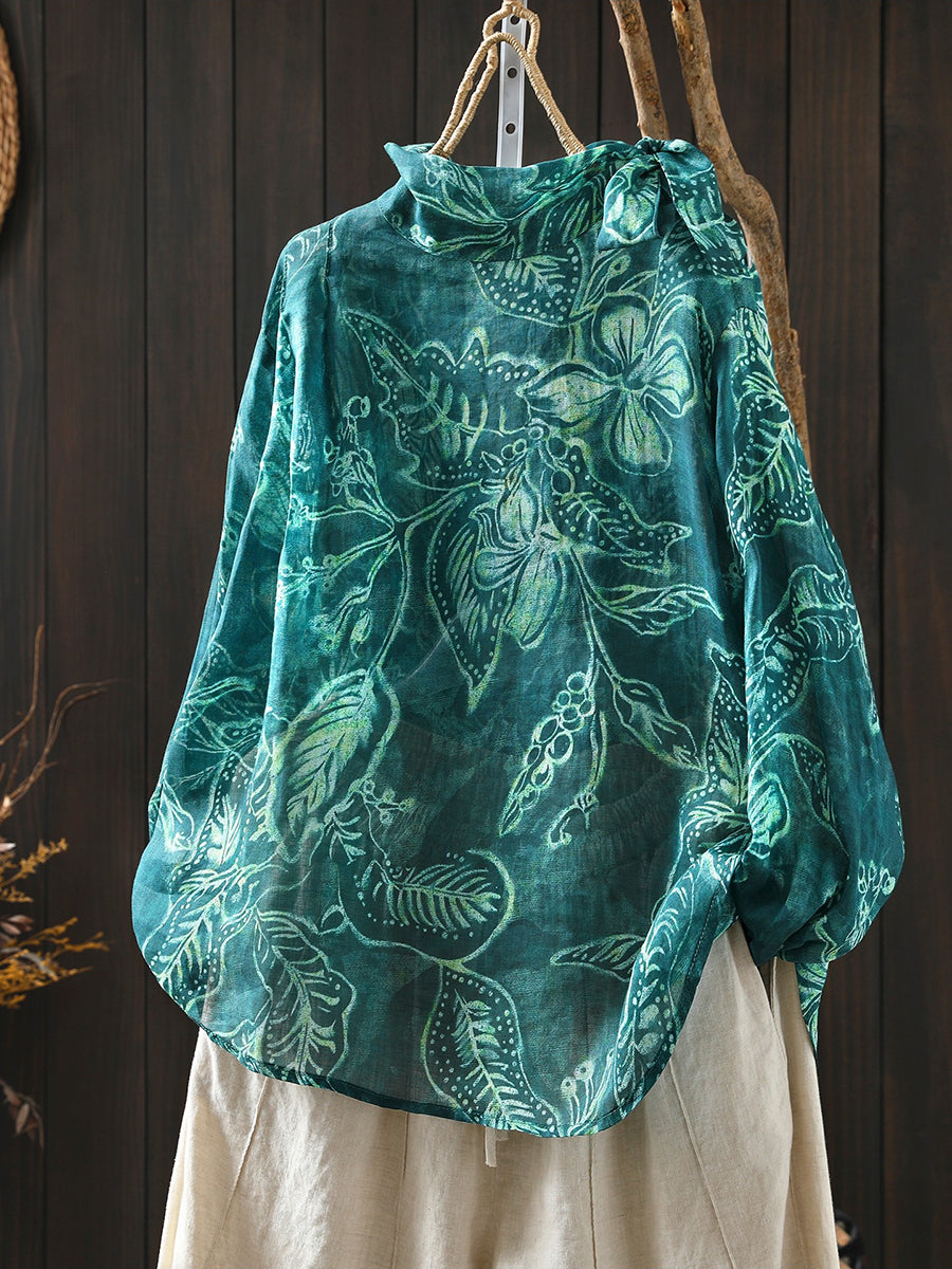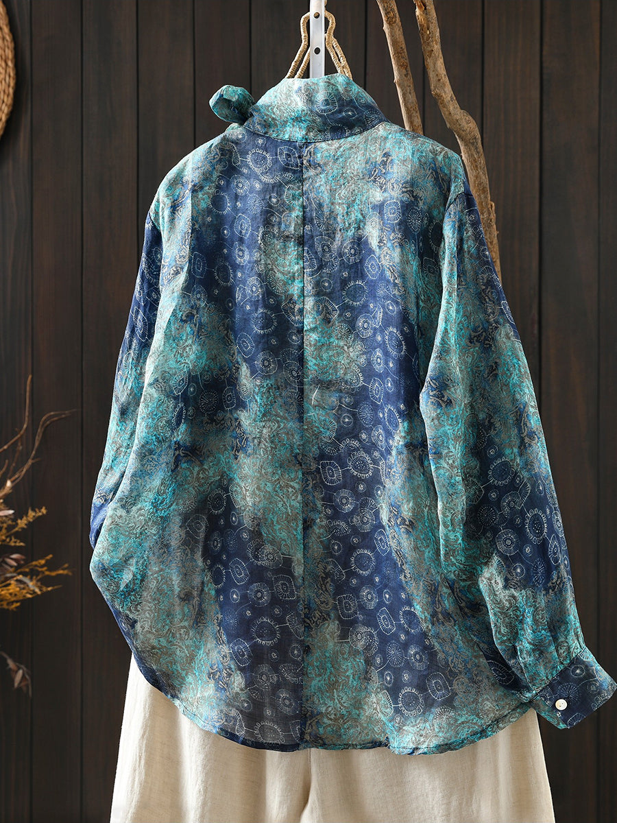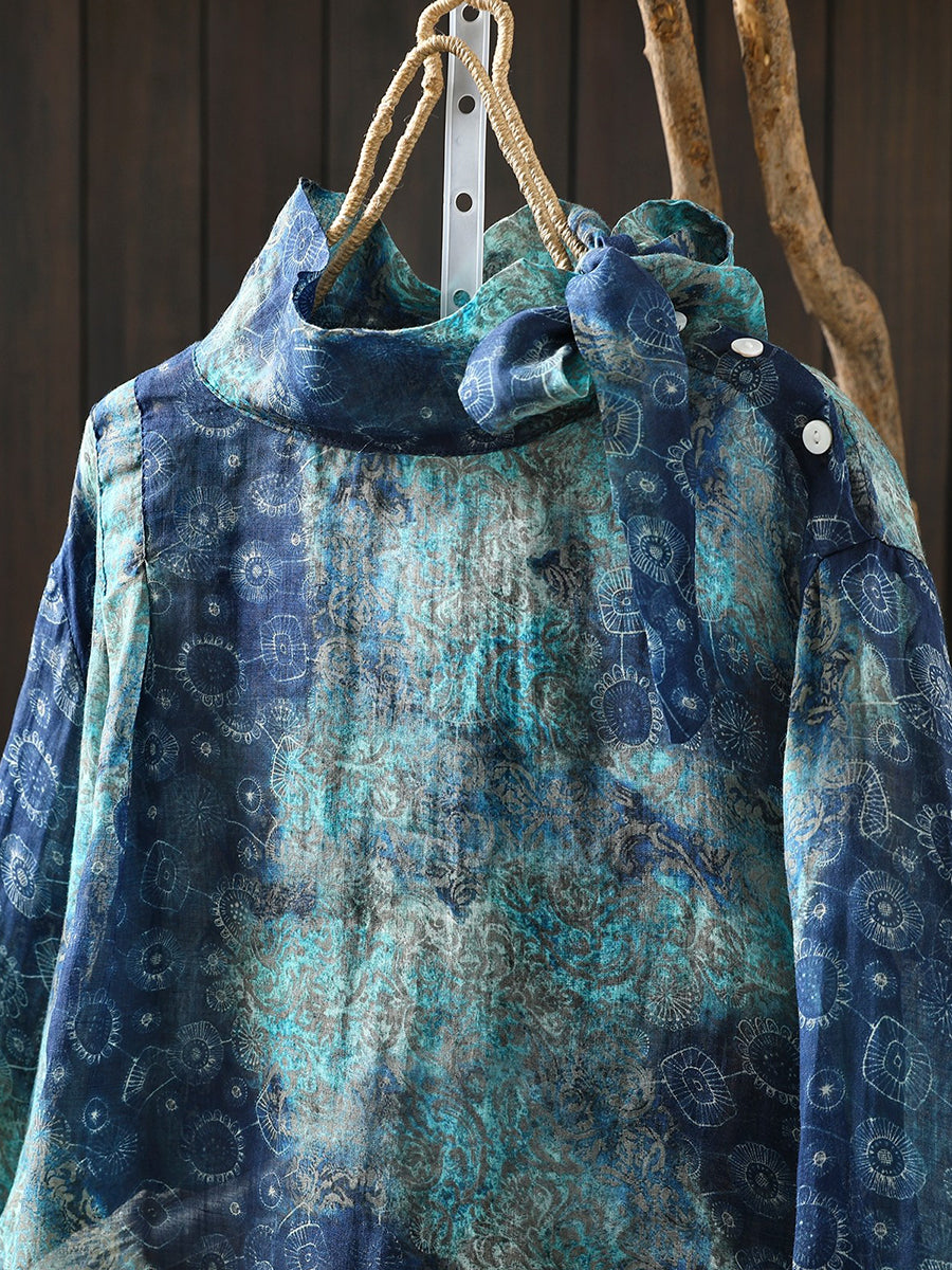 Kvinders forårsbluse med kunstnerisk blomsterprint og 100% ramie-krave