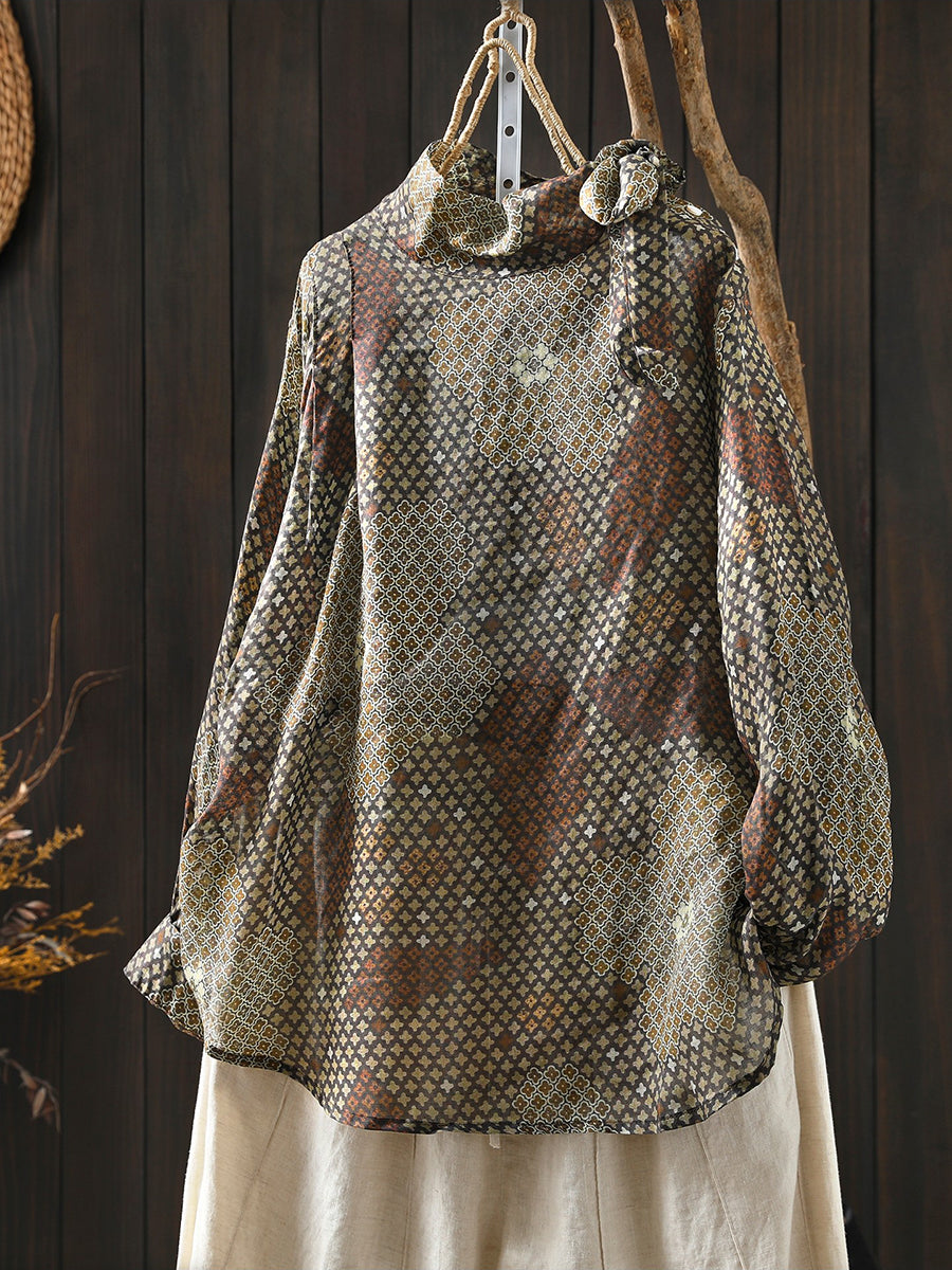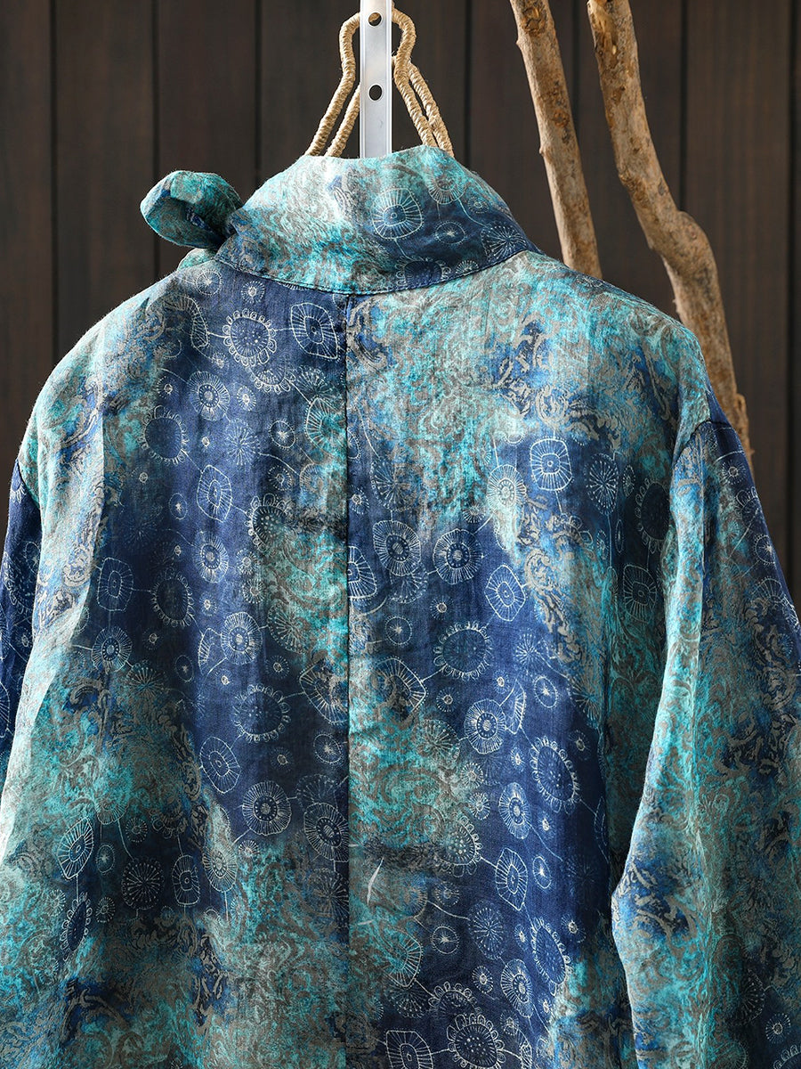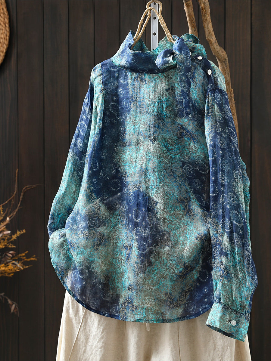 Kvinders forårsbluse med kunstnerisk blomsterprint og 100% ramie-krave