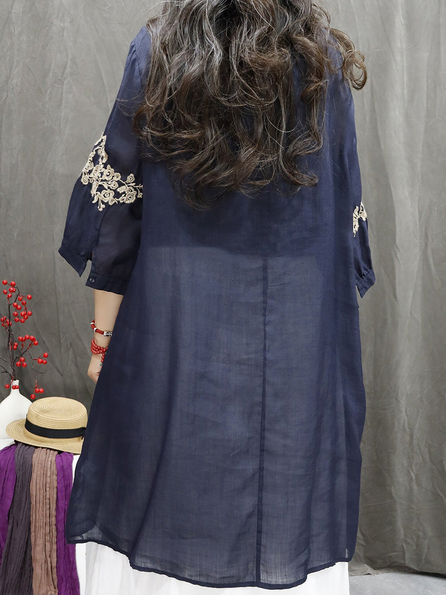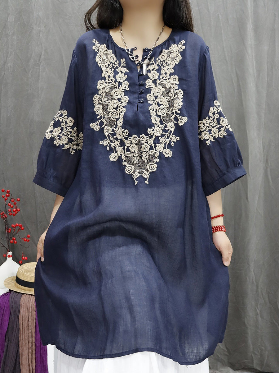 Dame forårsskjorte med kunstnerisk blomsterbroderi og 100% ramie-V-hals