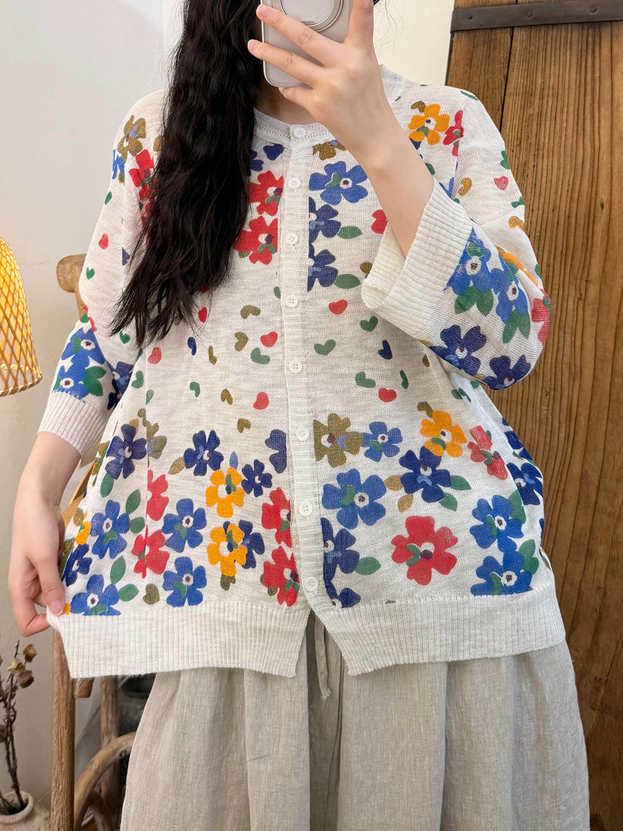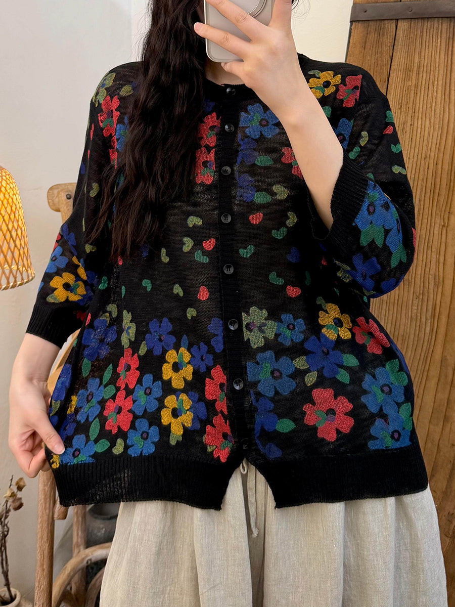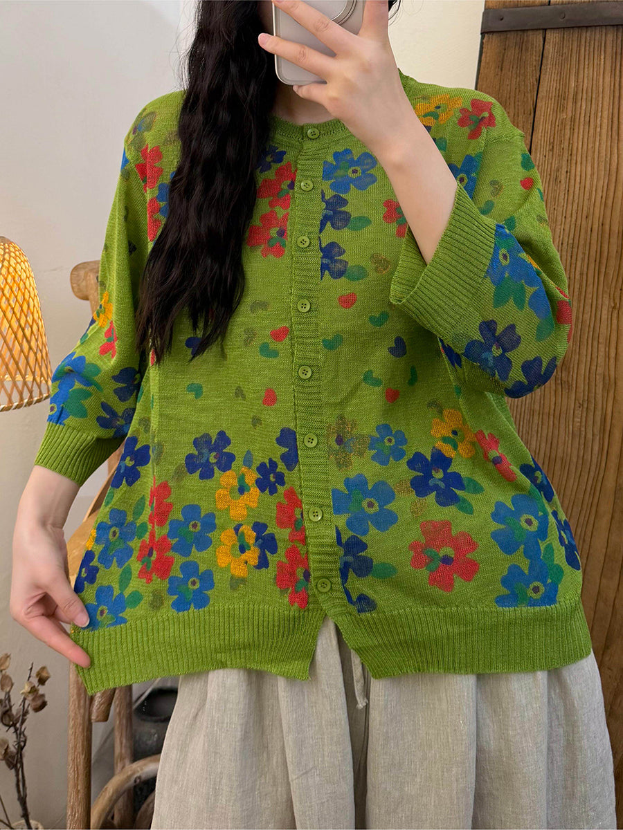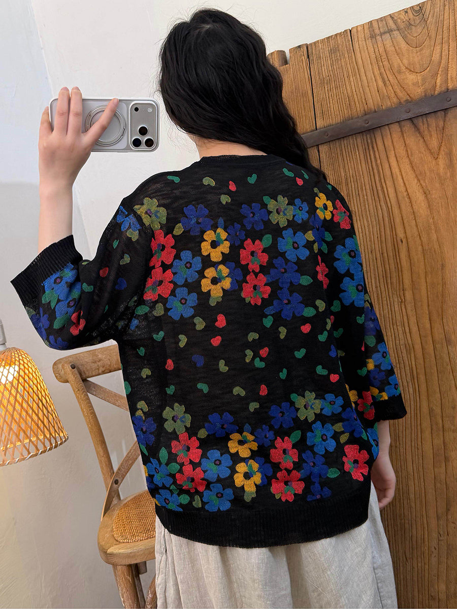 Kunstnerisk blomsterstrikkskjorte til kvinder
