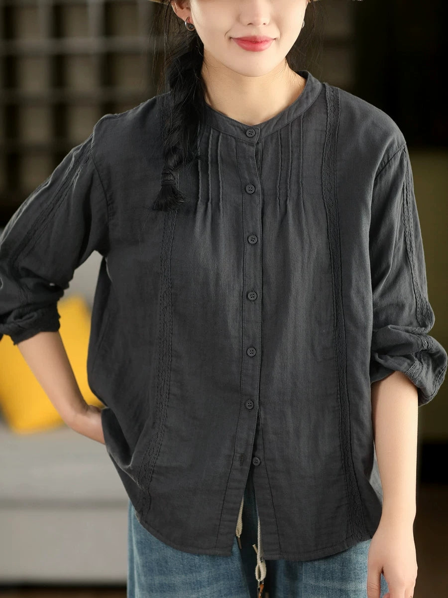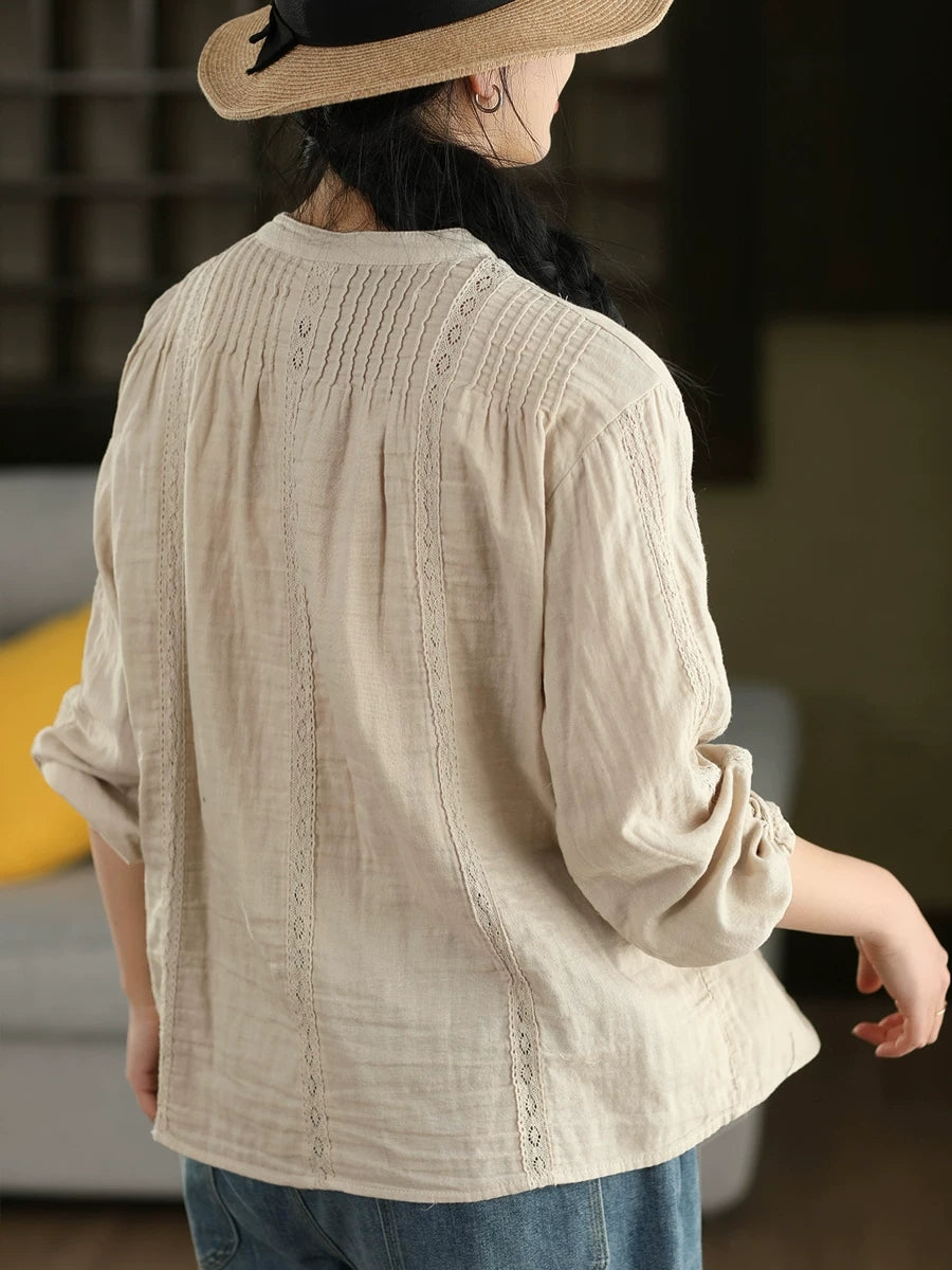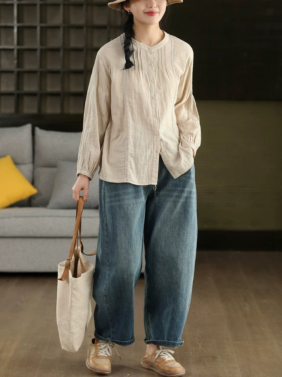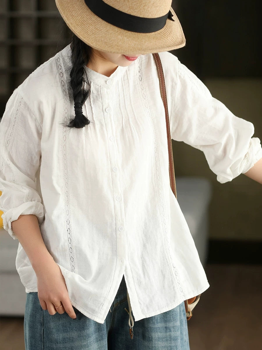 Dame forårsskjorte med kunstnerisk blondemønster og splejsning af 100% bomuld